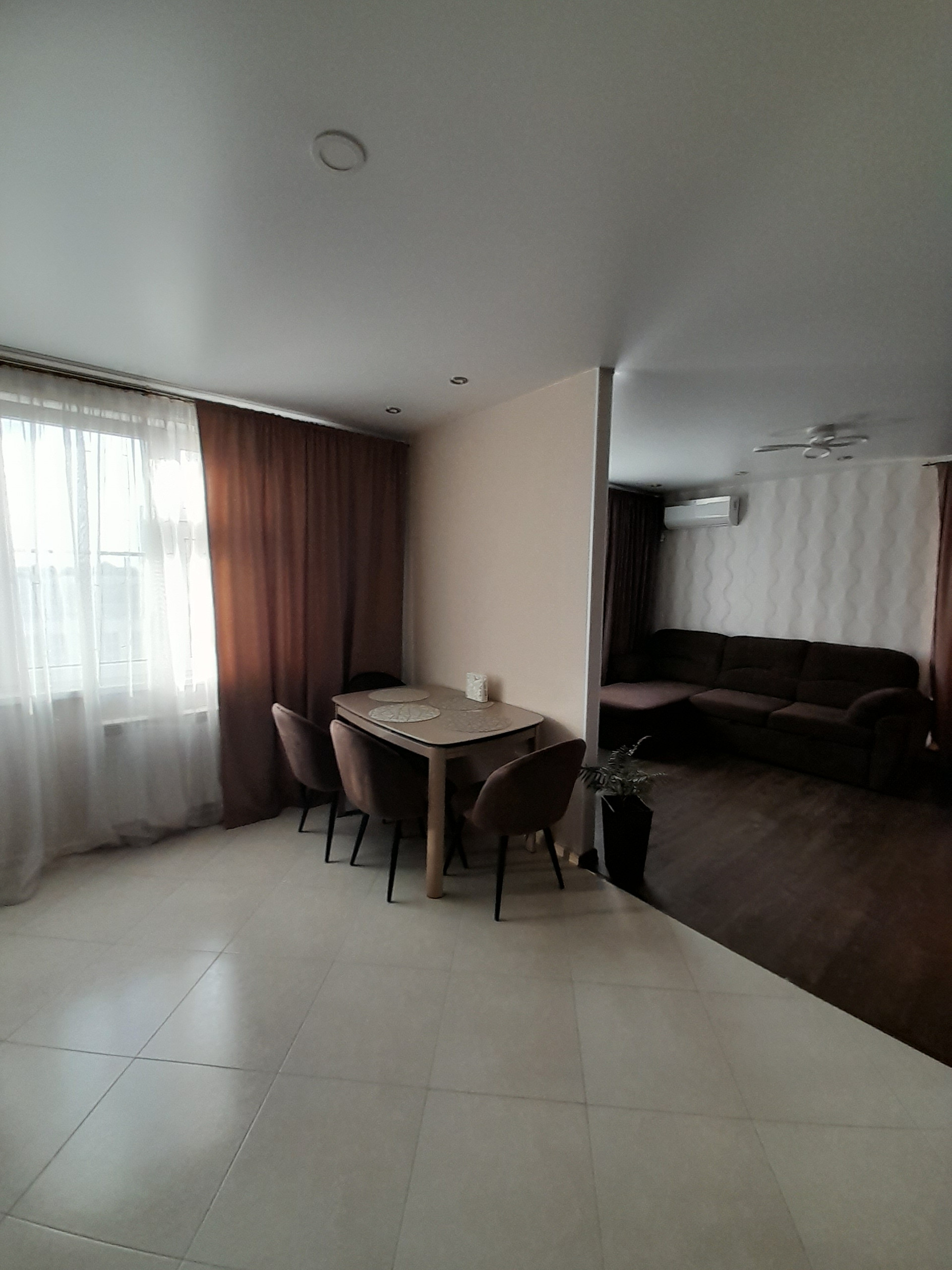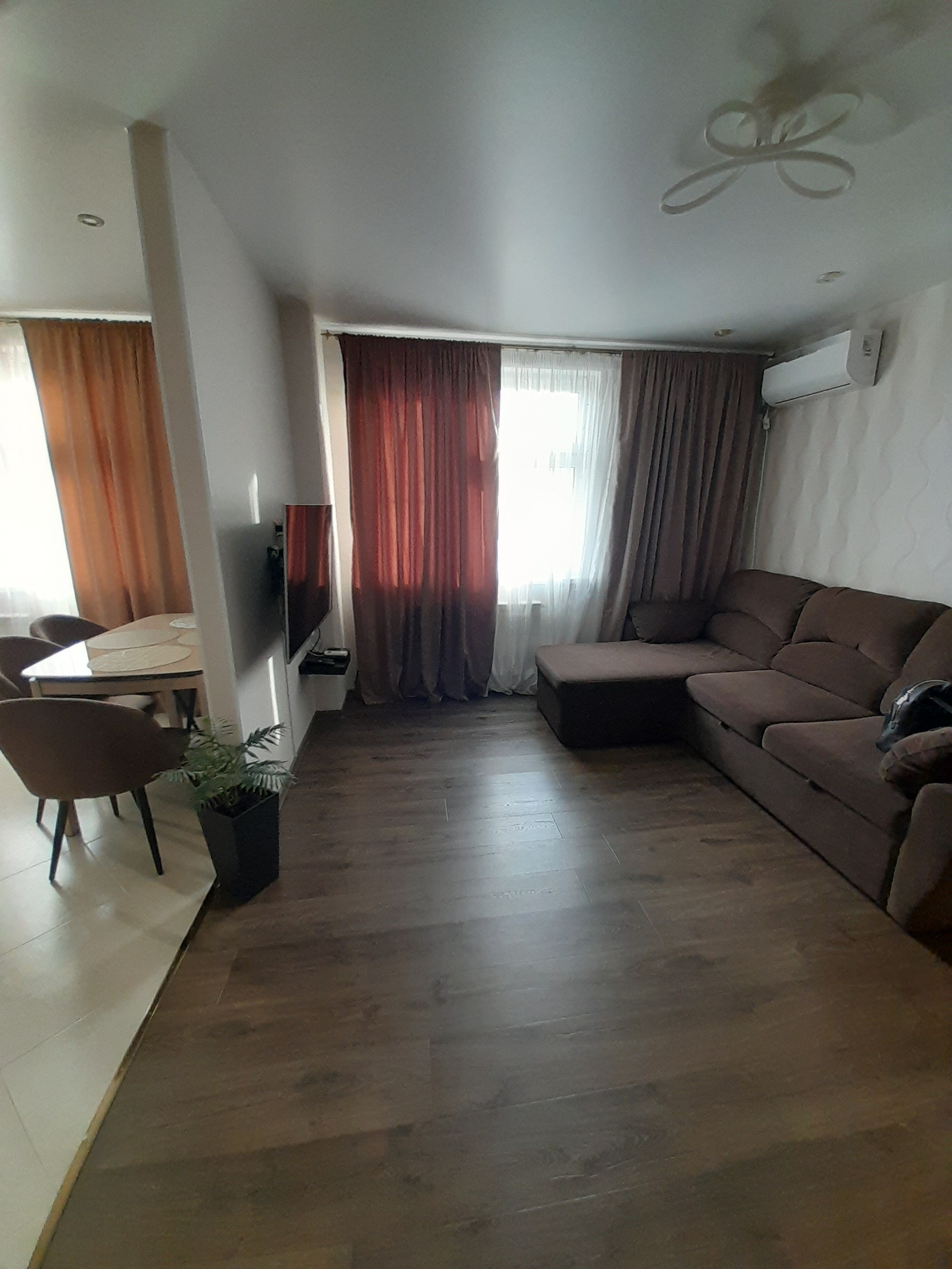 В зоне гостиной кондиционер, телевизор, удобный диван.