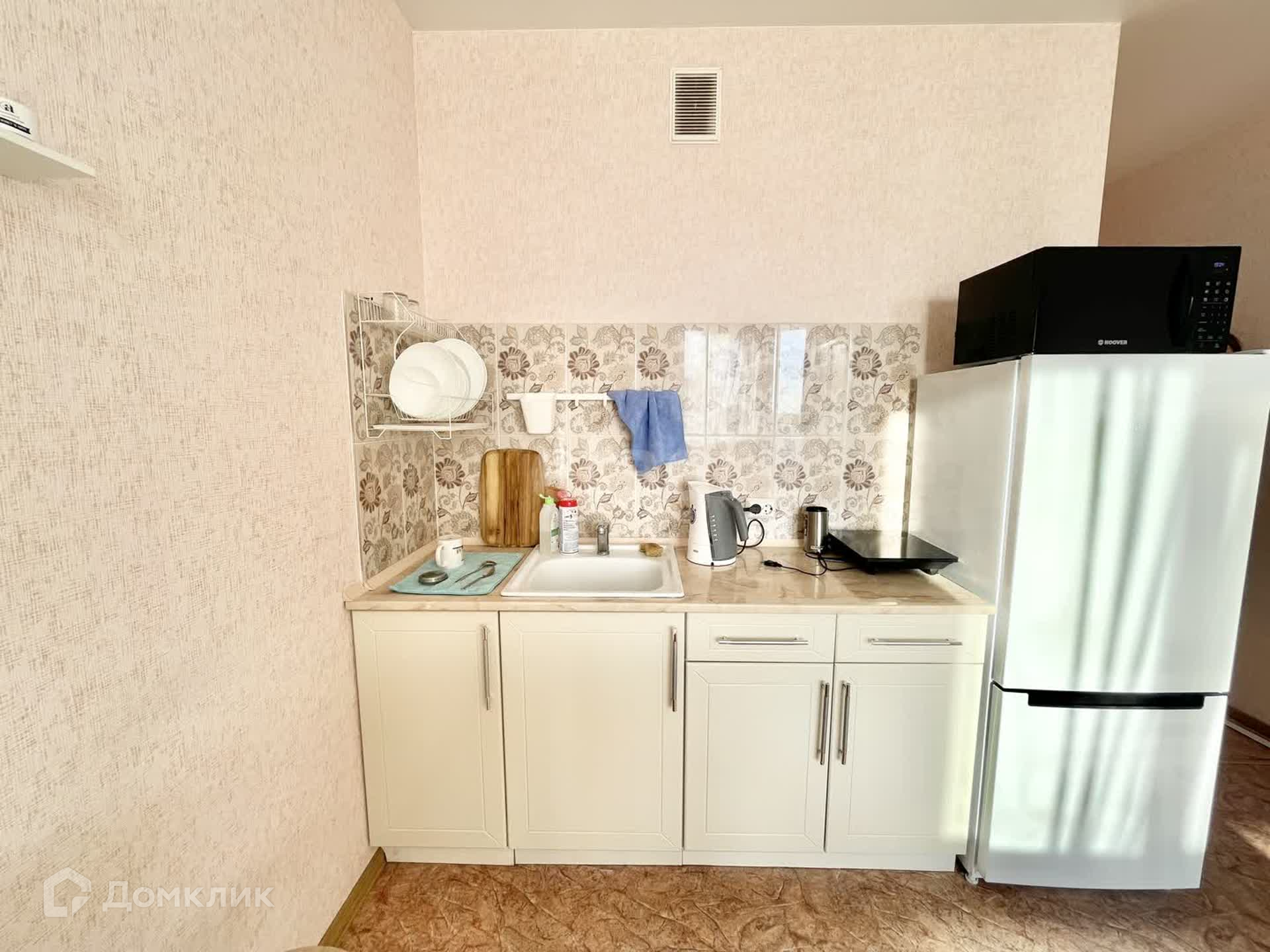 В квартире из необходимой мебели и техники имеется: кровать, холодильник, стиральная машина, микроволновка, обеденный стол и стулья.