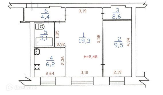 Высота потолков (м.): 2.48