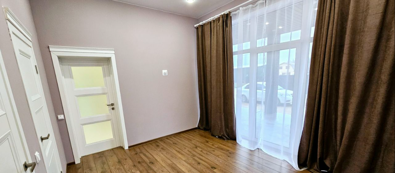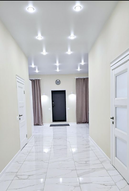 В доме три отдельные комнаты по 15 кв.м., (в двух из них панорамное остекление с выходом на террасу и в одной из них есть собственный санузел, гардеробная), широкий коридор, кухня-гостиная 44 кв.м. с выходом на террасу (оборудована кухонной мебелью со встроенной техникой, новый холодильник, газовая плита, духовой шкаф, микроволновая печь, посудомоечная машина, стол). Высота потолков 3 метра. Внутренняя отделка также выполнена из качественных материалов. На полу ламинат и керамогранит. Стены в санузлах керамогранит. Отличная планировка, много свободного пространства и солнечного света.