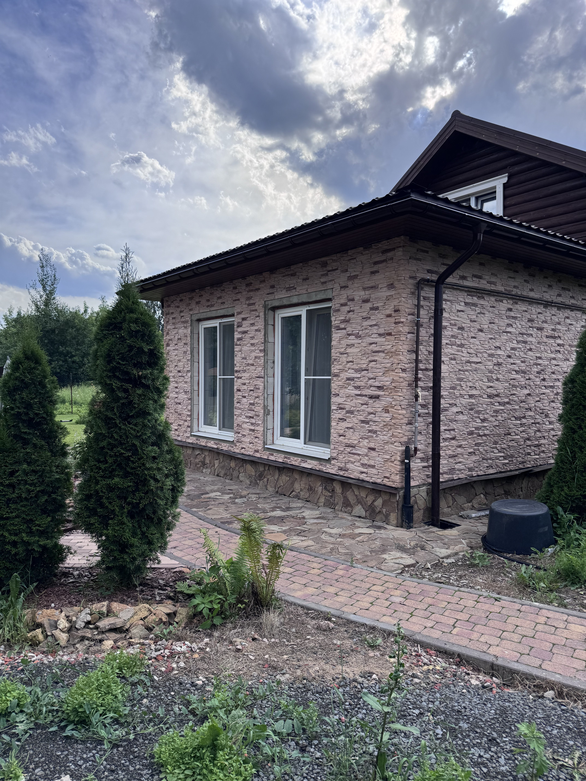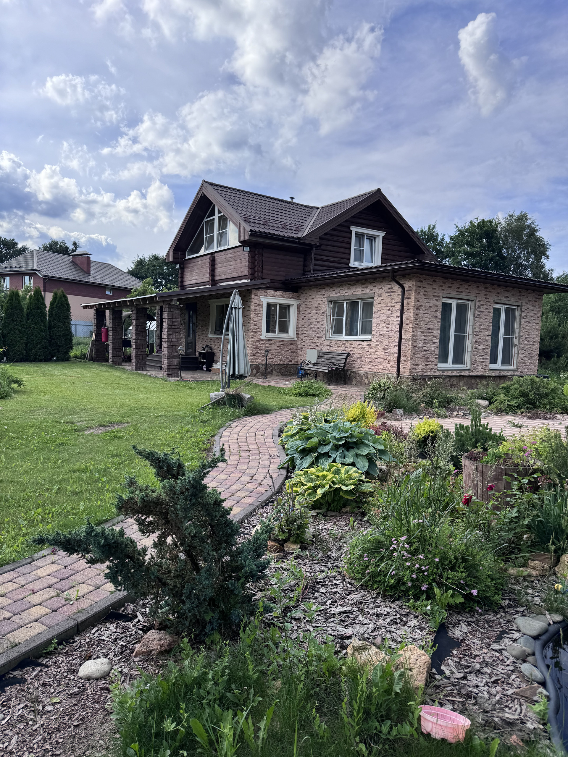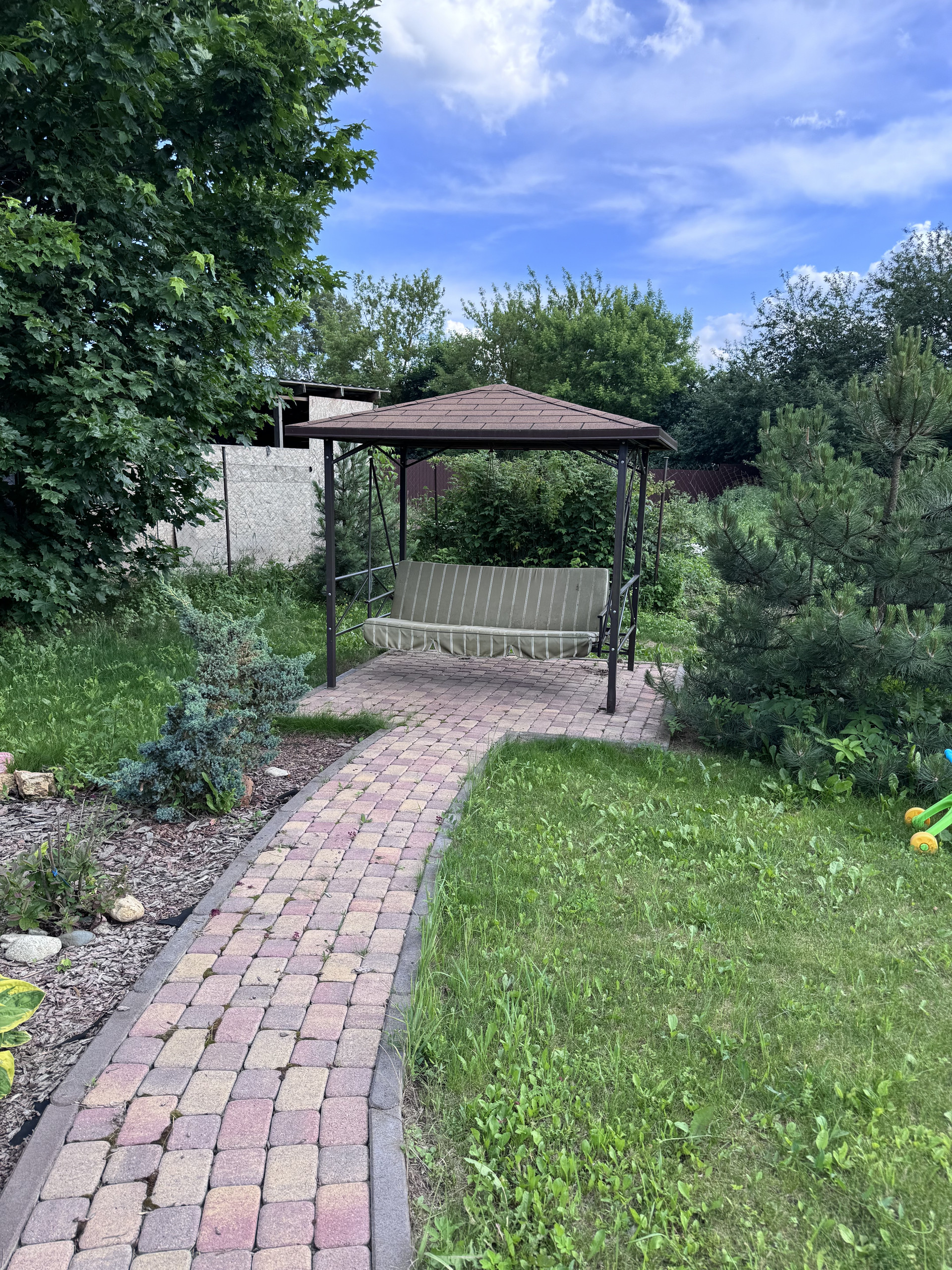Участок полностью укомплектован, дорожки из камня, плитка, беседка большая, качели , мангальная зона , хвойные растения, газон