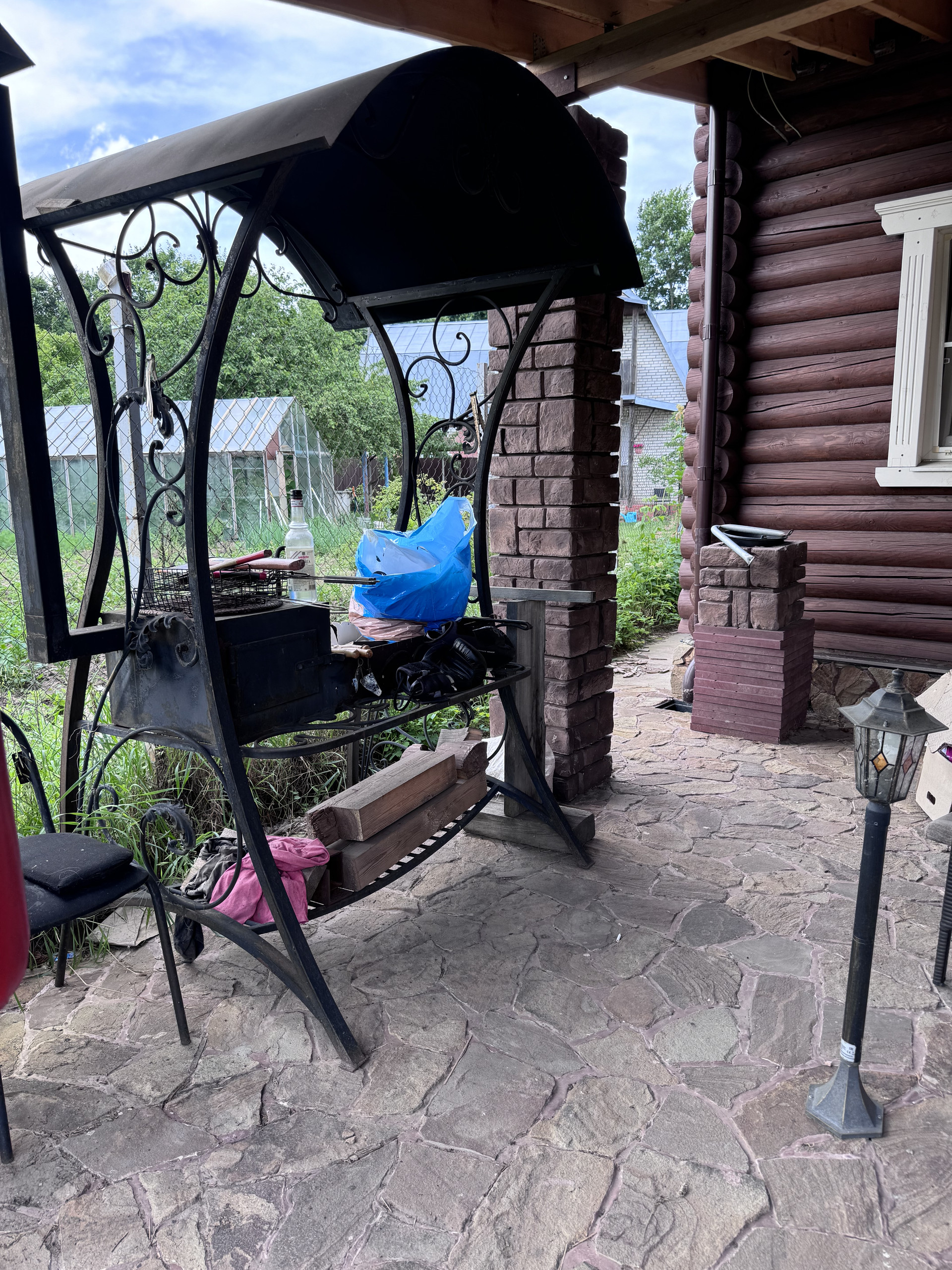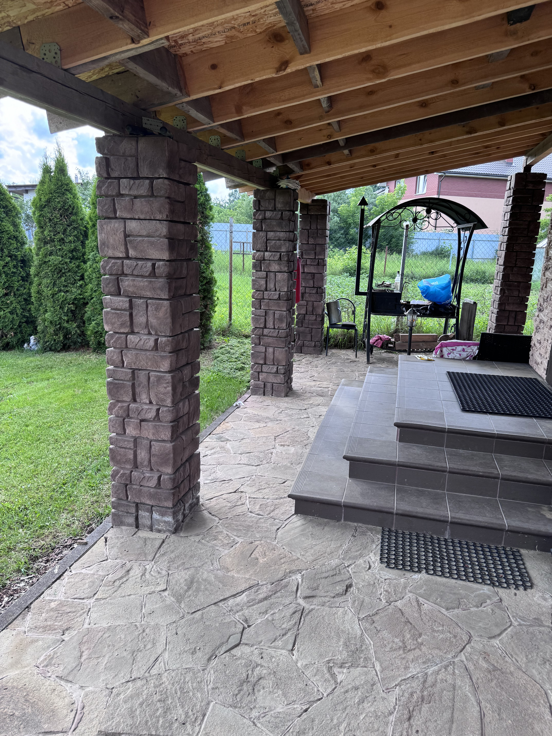 Перед домом большой навес , мануальная зона и мангал