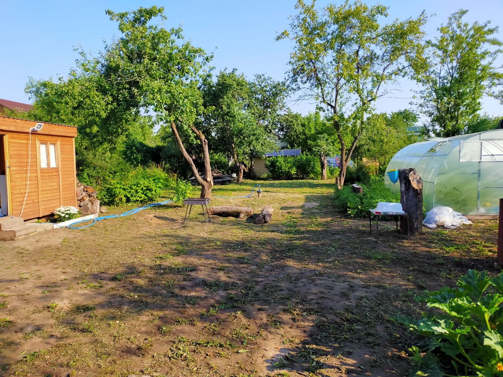 Так же на участке есть плодовые деревья и кустарники: яблони, вишни, сливы, черная смородина, малина, ежевика, крыжовник, клубника, земляника. Земля плодородная, все прекрасно растет и зреет.