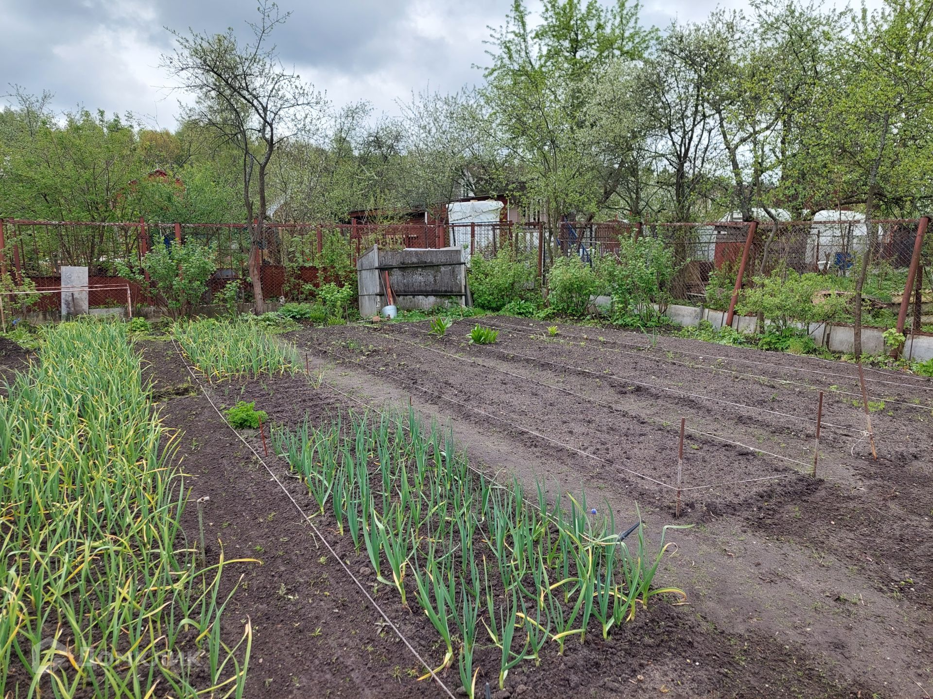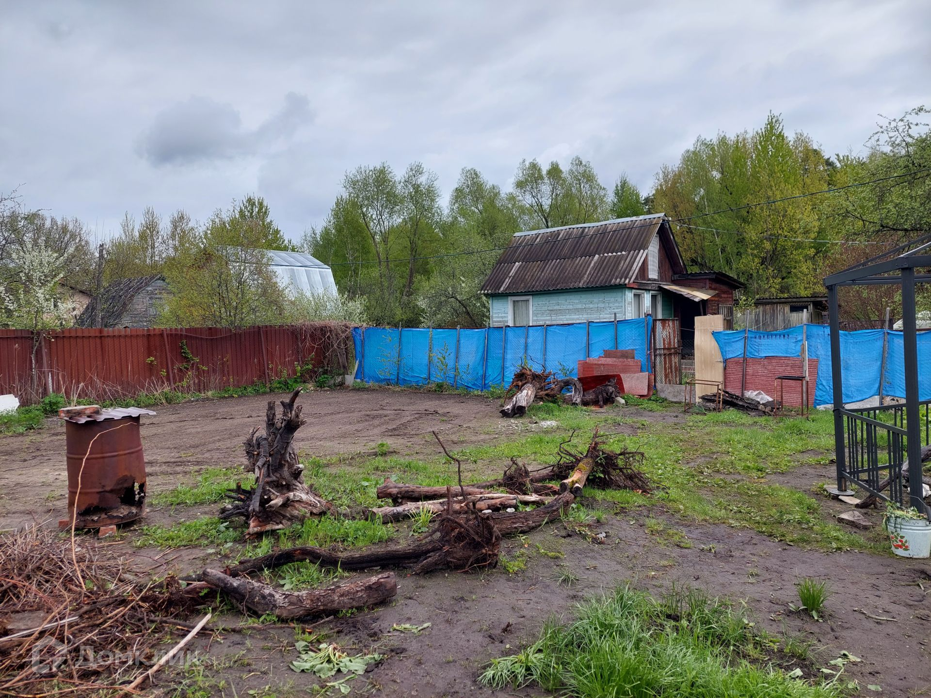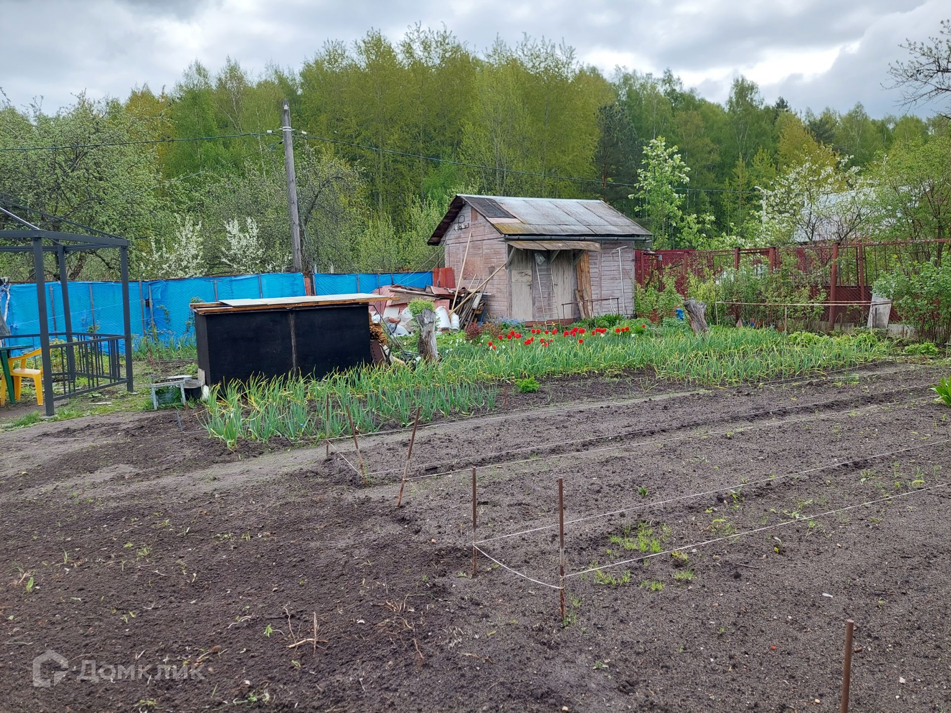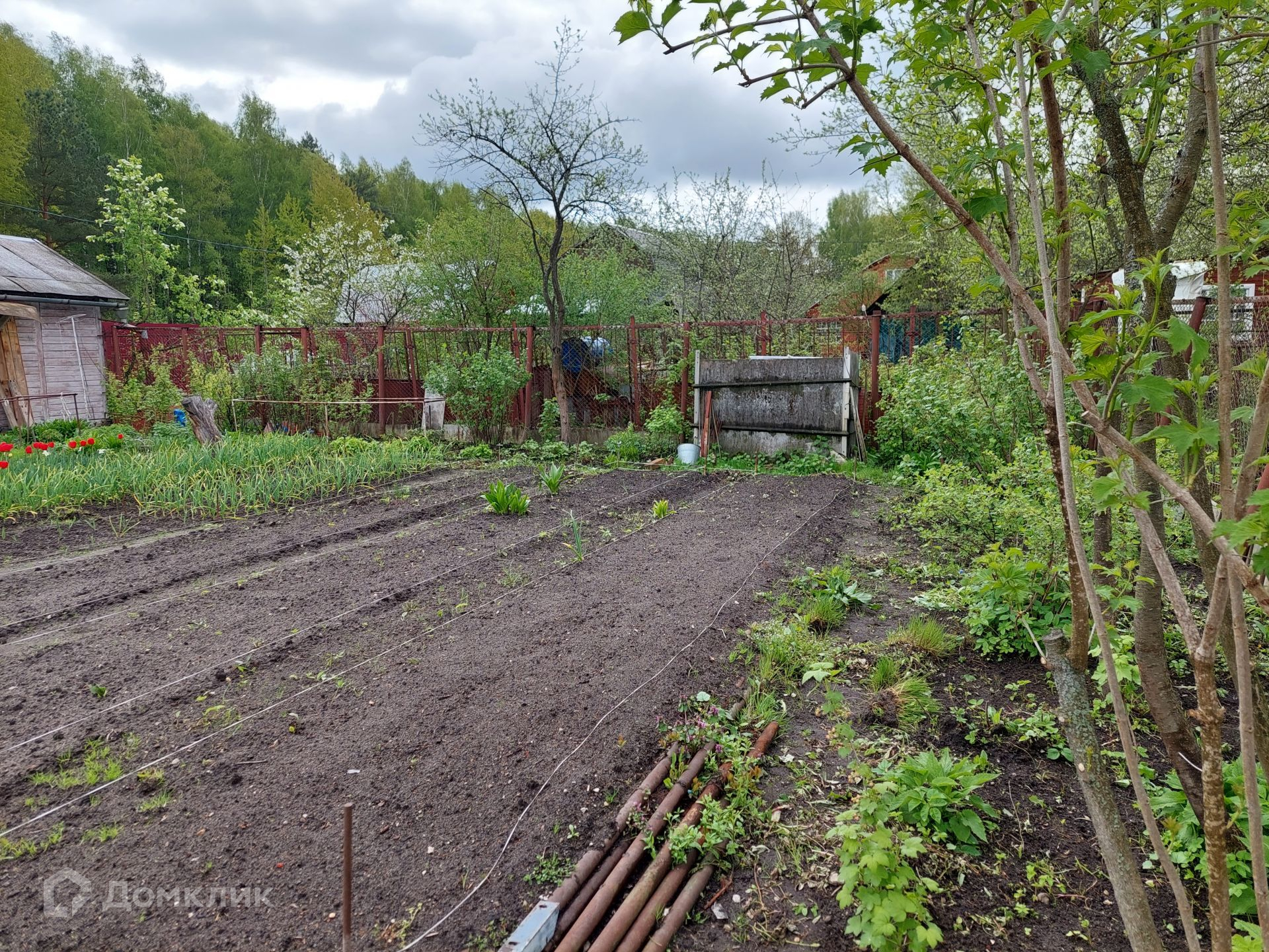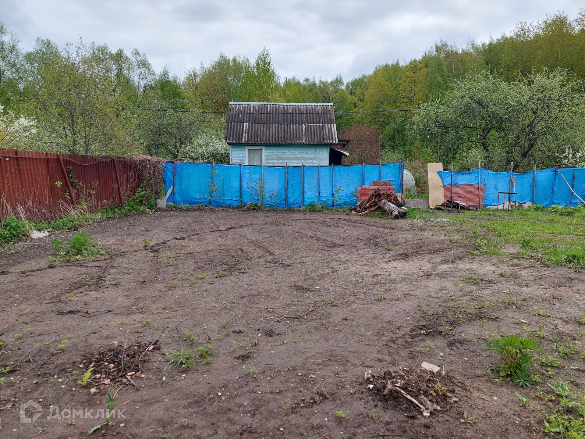 На территории уже установлен туалет, небольшой домик 4х3 м, в котором можно отдохнуть, укрыться от дождя. Со всех сторон участок огорожен рабицей.