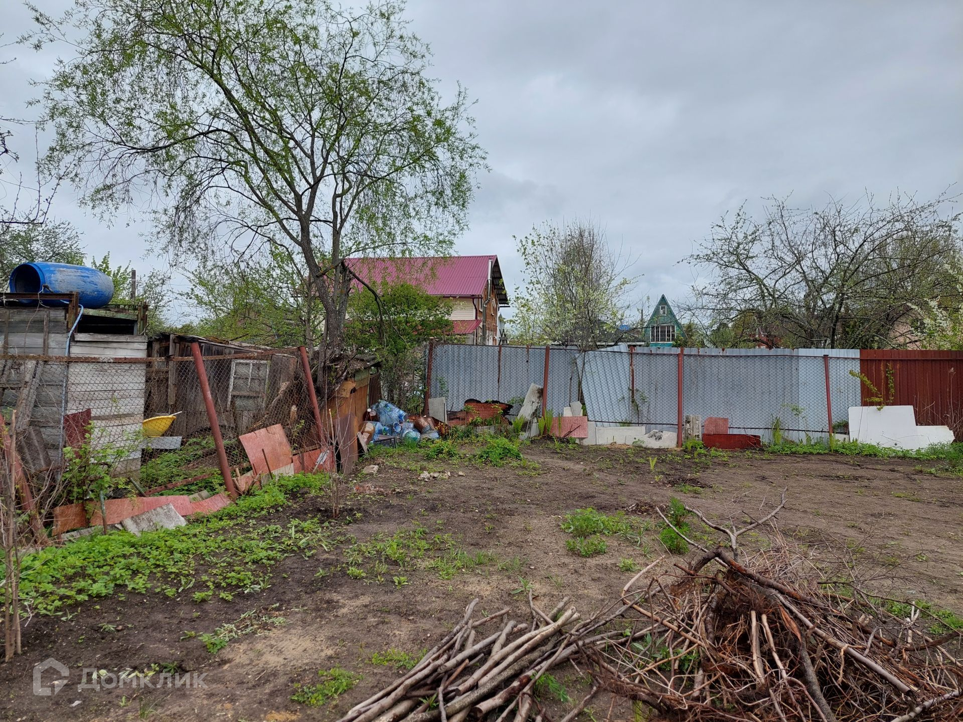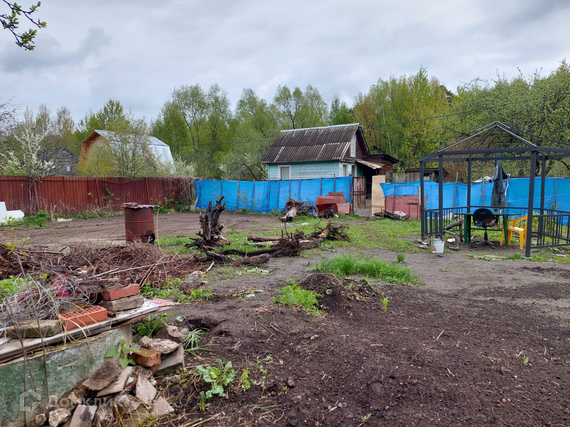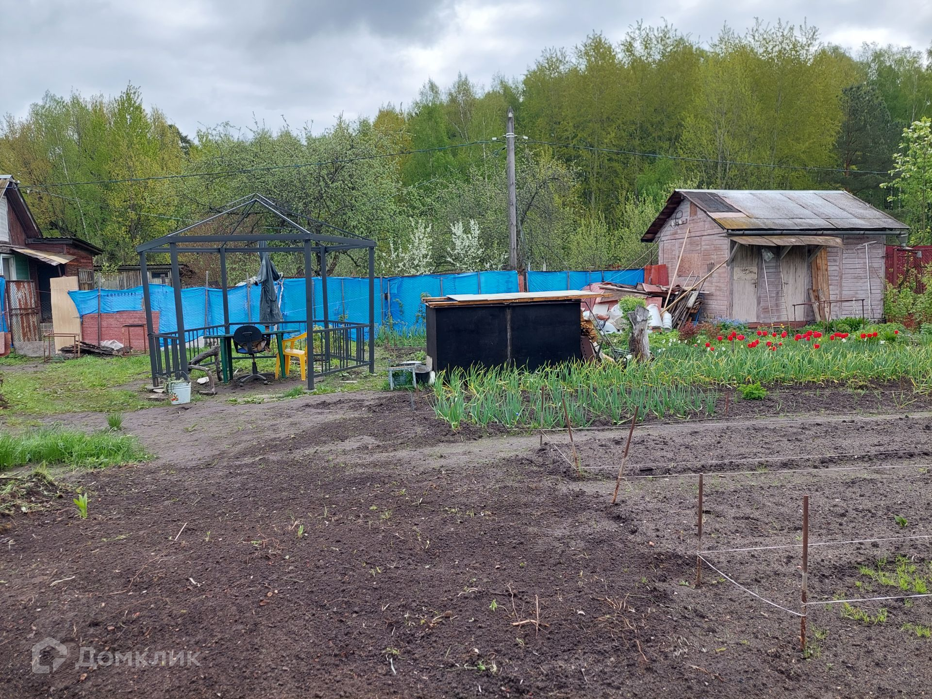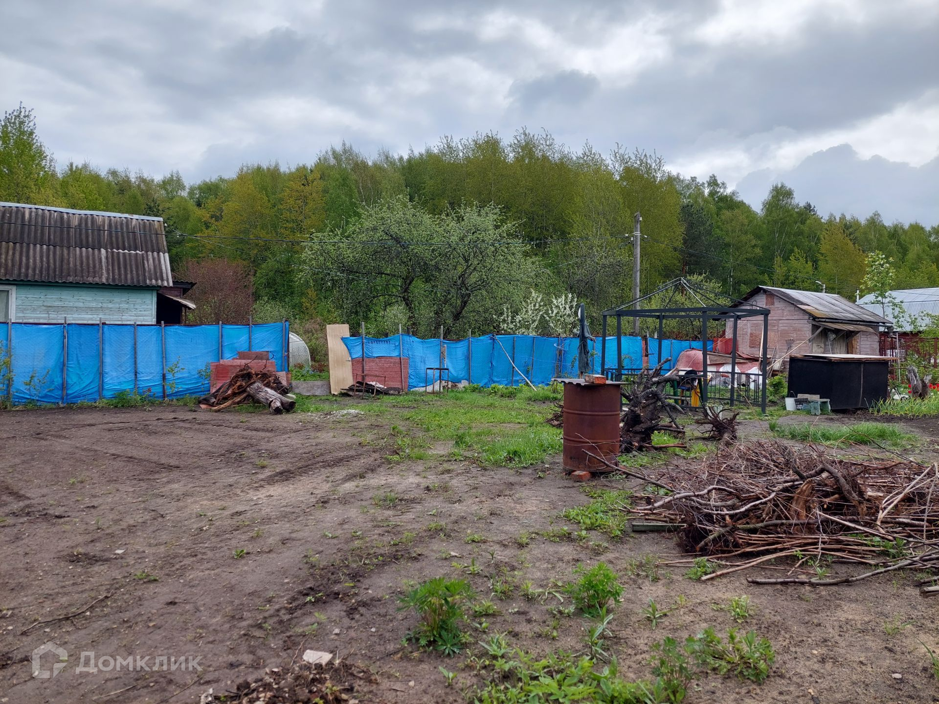 На территории уже установлен туалет, небольшой домик 4х3 м, в котором можно отдохнуть, укрыться от дождя. Со всех сторон участок огорожен рабицей.