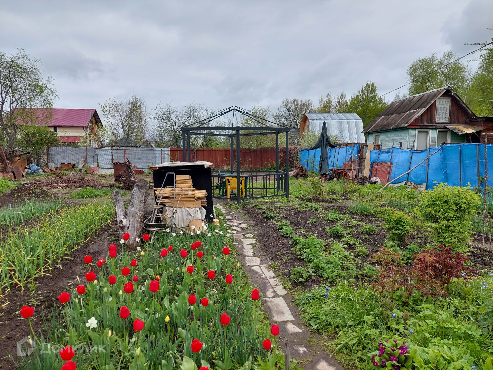 Беседка - шатер остается в подарок новым собственникам, тент есть.