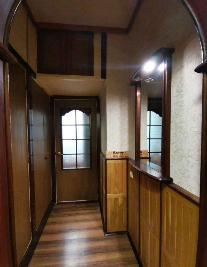 Напольные покрытия (ламинат, линолеум, ковролин). В кухонной зоне потолок отделан сборной конструкцией из дерева (ручная работа). Так же в коридоре отделка панелями ручной работы.