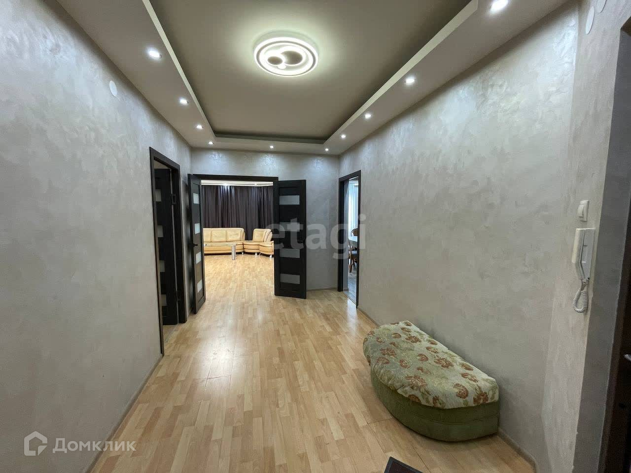 Окна ПВХ, современные межкомнатные двери, полы застелены ламинатом, подвесные двухуровневые потолки во всей квартире. На балконе натяжной потолок с точечным освещением, установлены отопительные электро-радиаторы с регулировкой мощности, застеклён ПВХ.