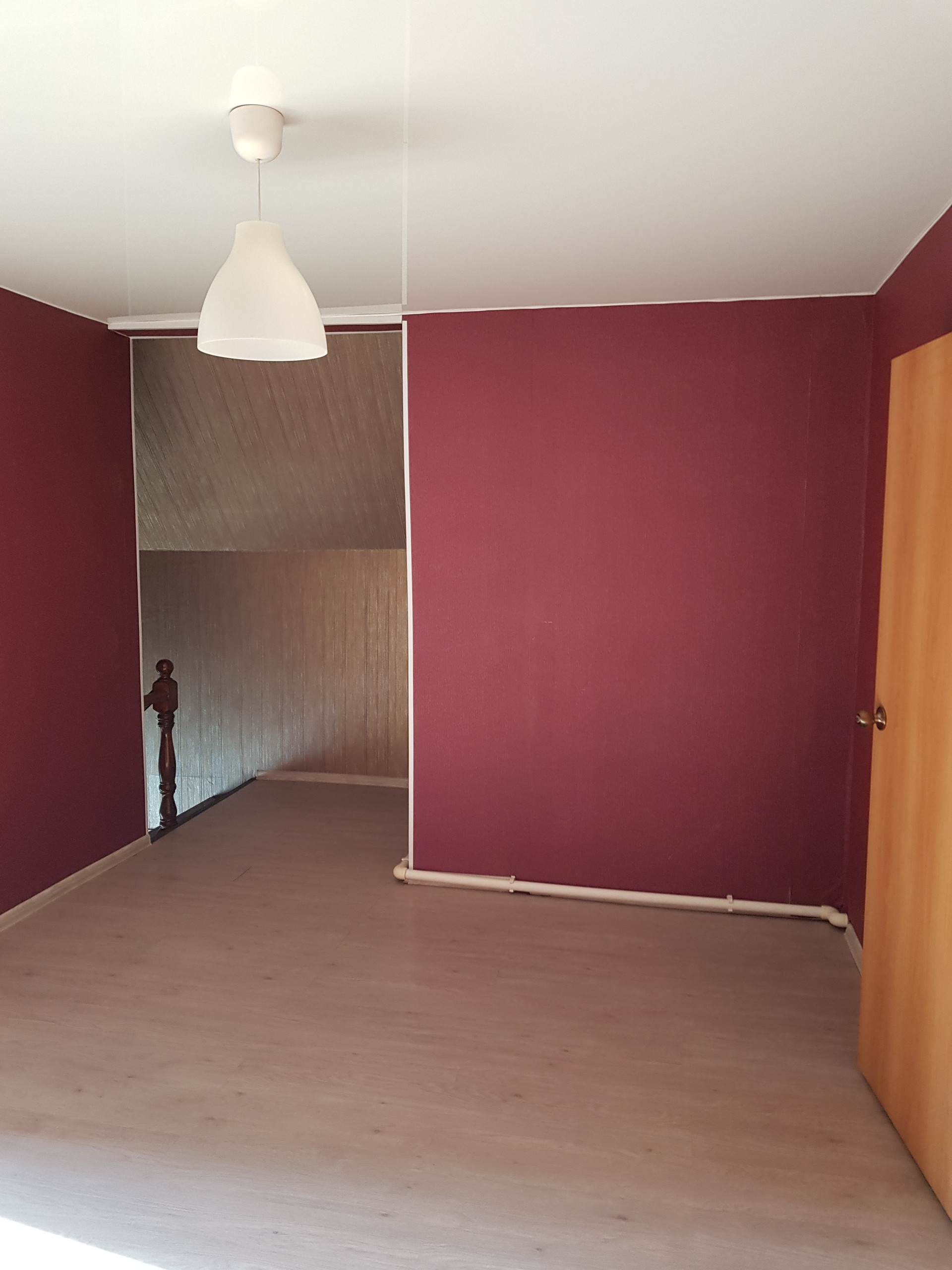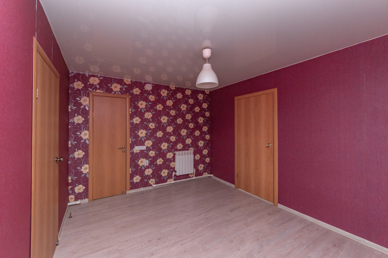 на полу ламинат. Все стены оклеены обоями , Окна большие пластиковые, лоджия застеклена и облагорожена.