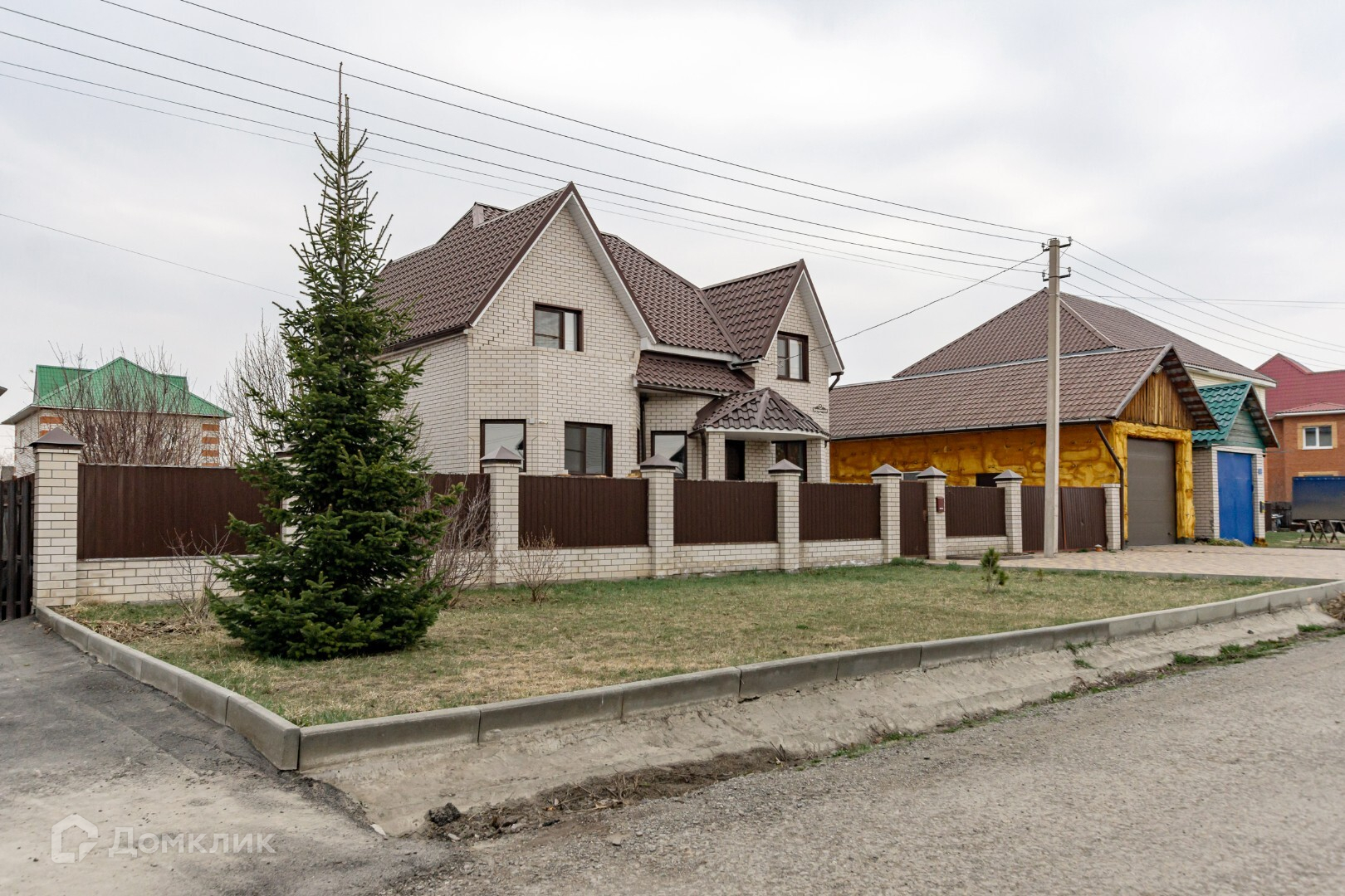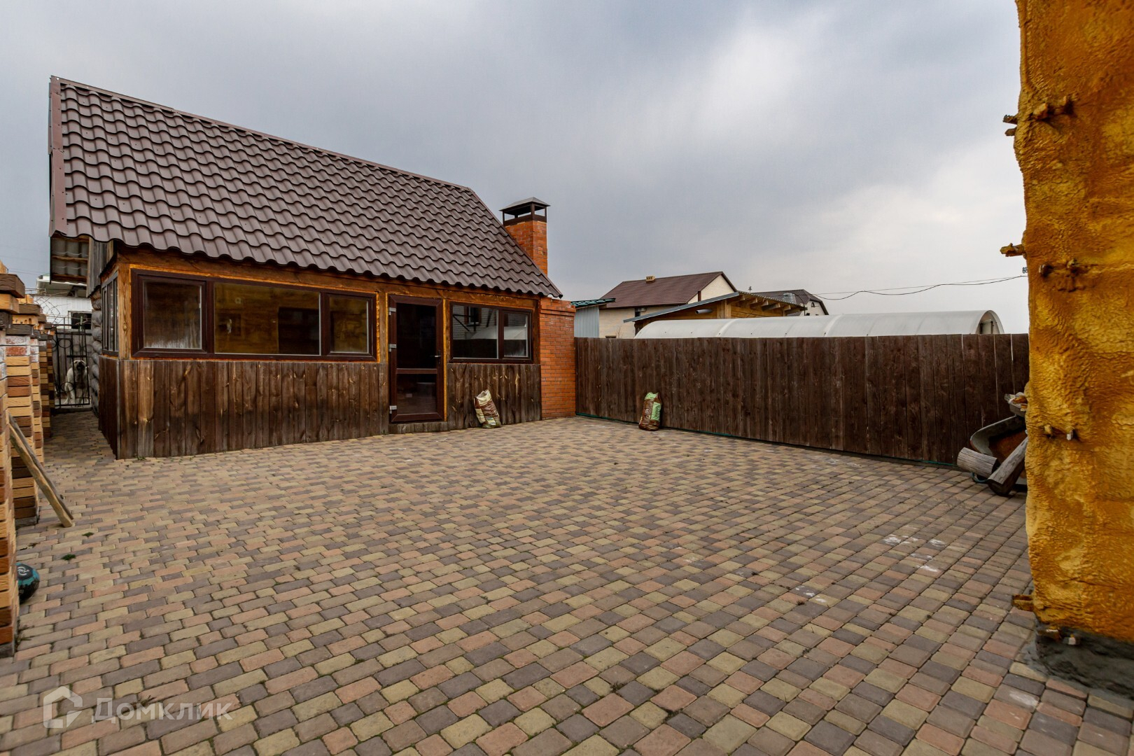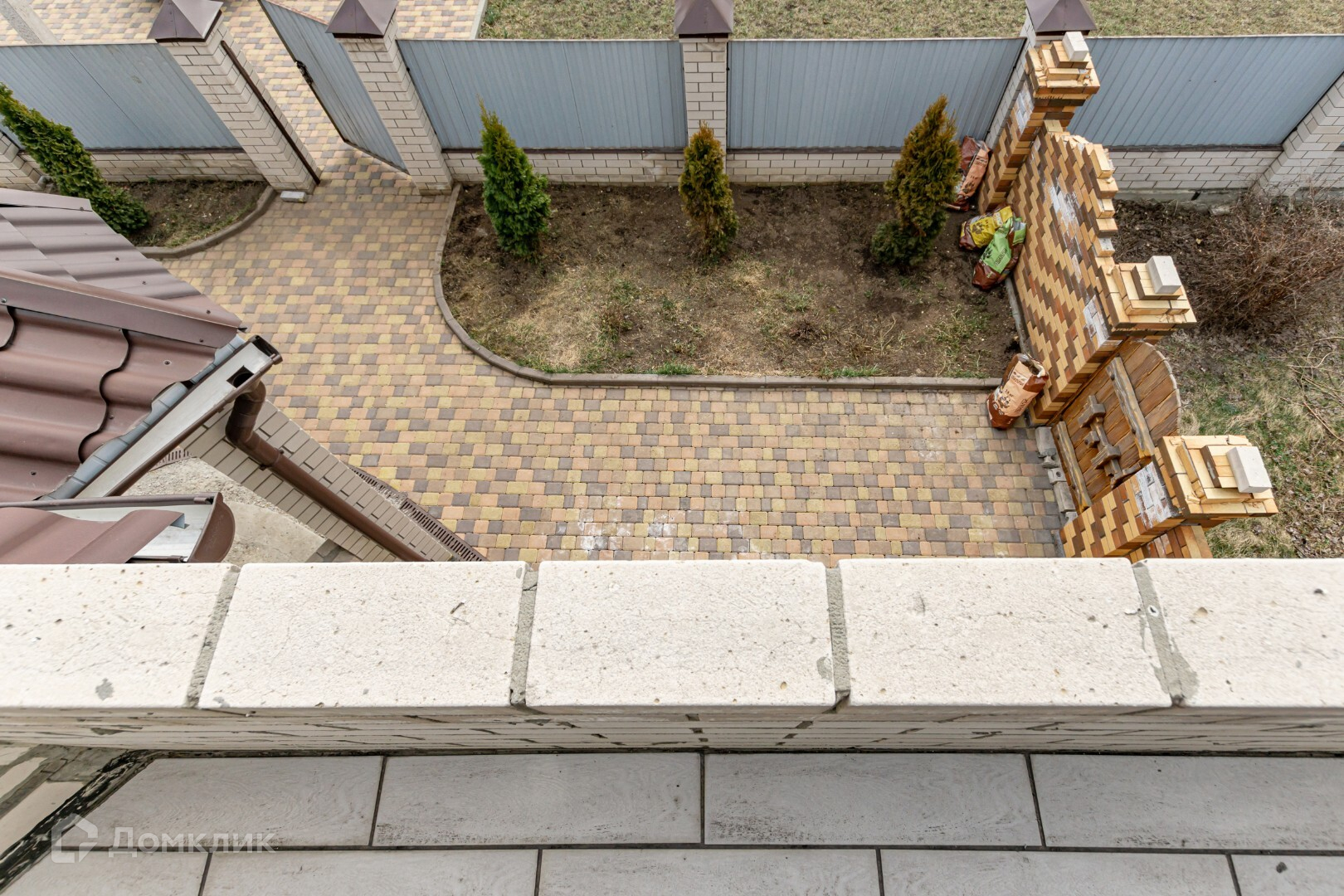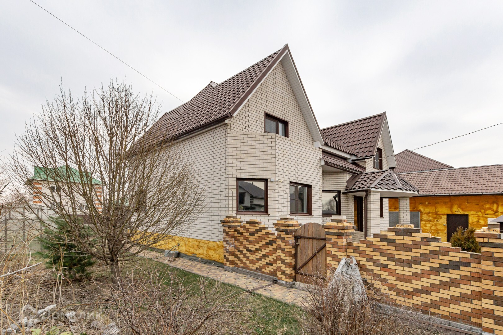 Сад и огород огорожены декоративным забором из кирпича, за банным комплексом есть вольер для собаки.