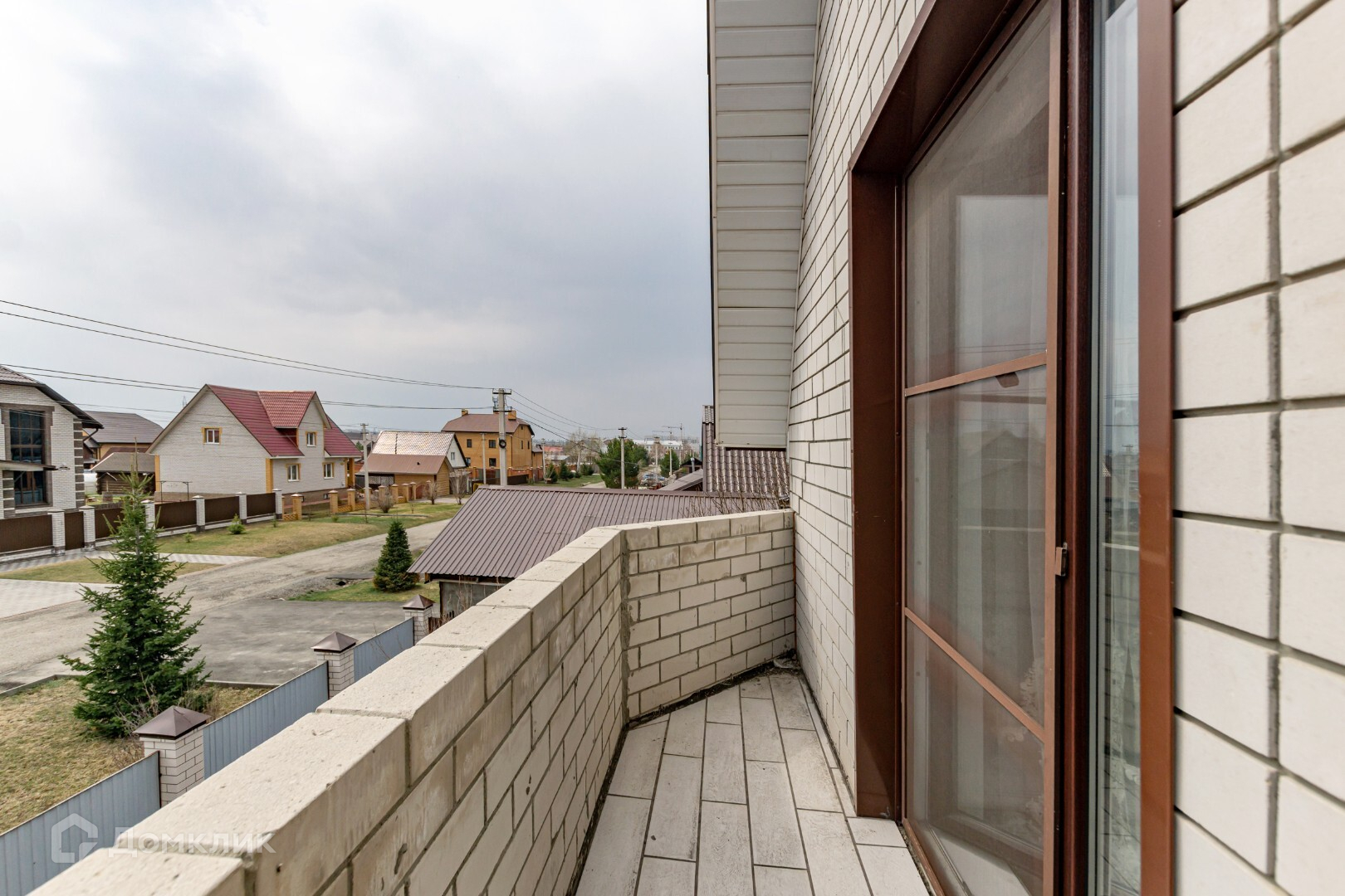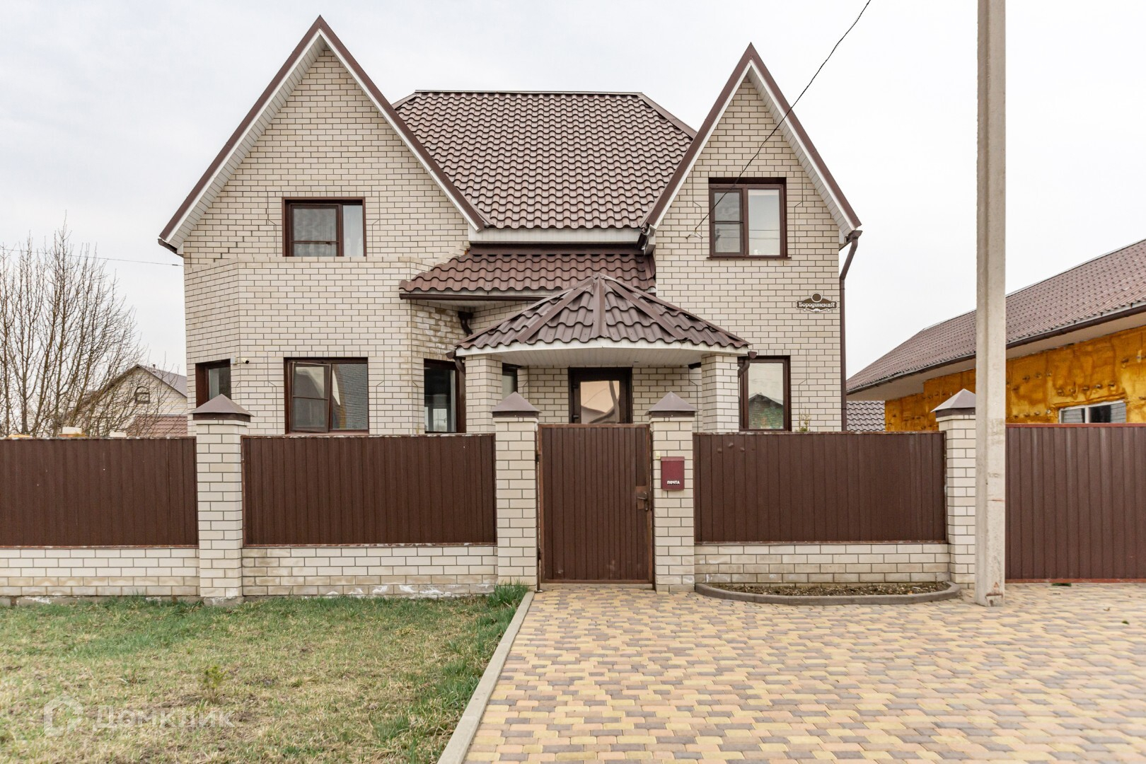 Перед домом газон и тротуарная плитка.