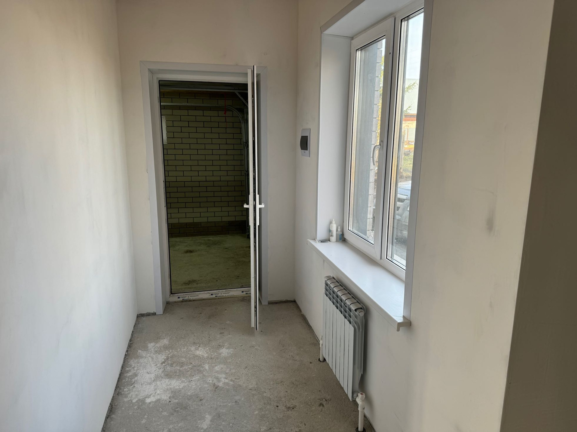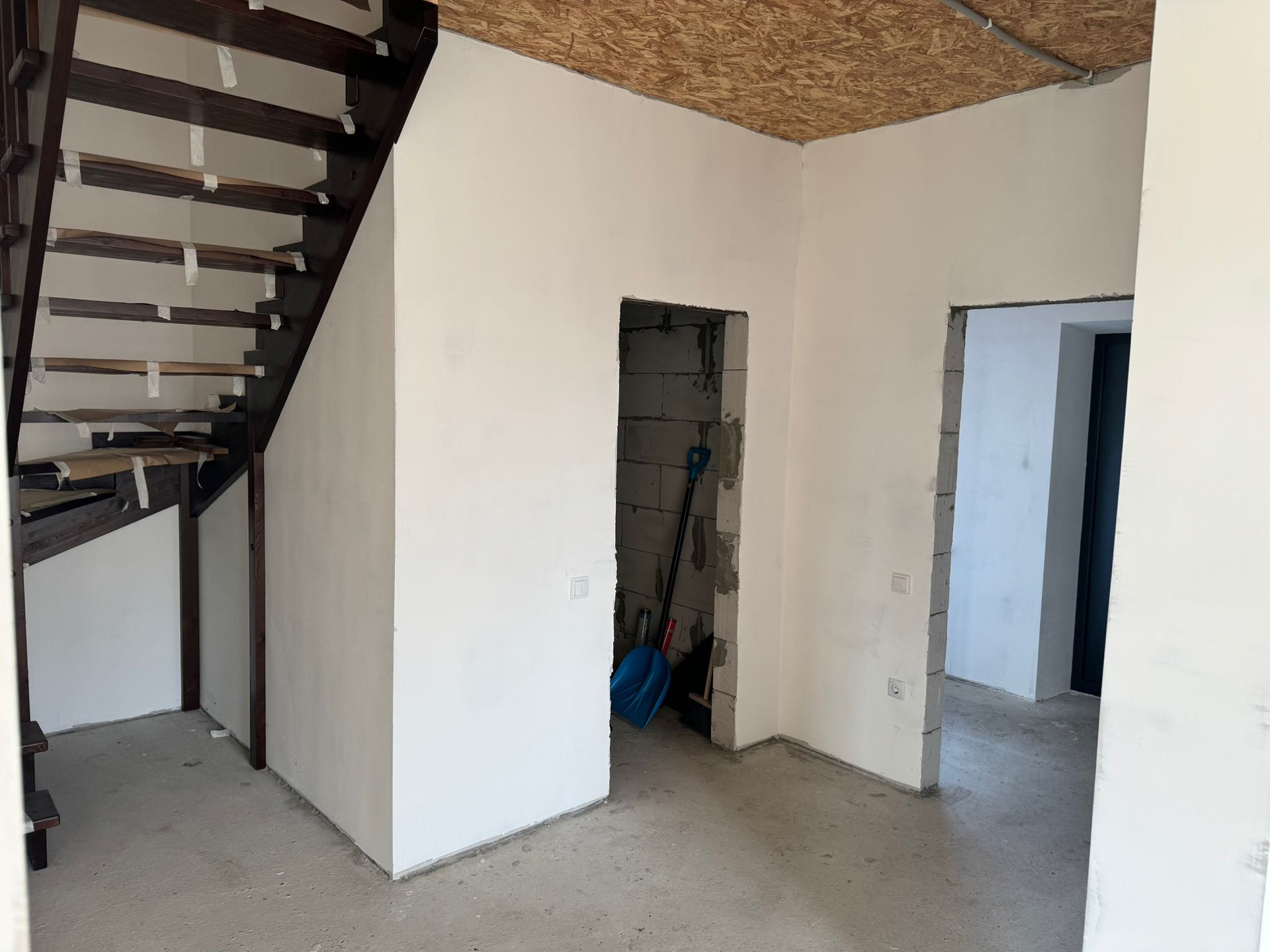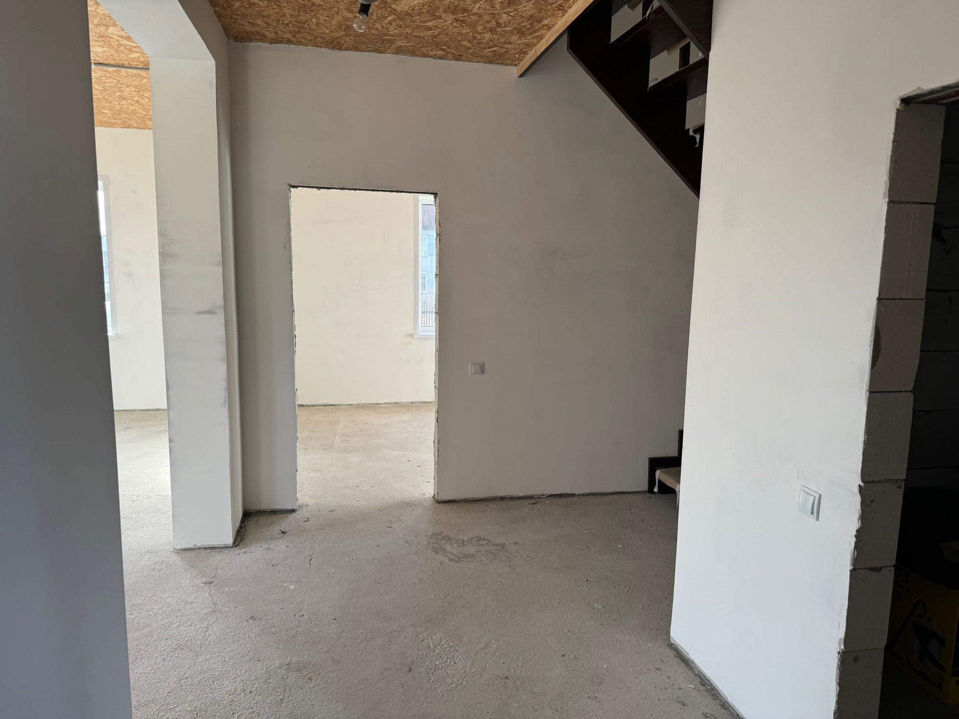 Первый этаж - прихожая с выходом в гараж, хол с лестницей на второй этаж, кухня-гостиная,спальня,санузел.