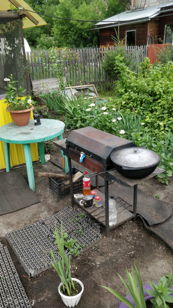 Участок в собственности 5.47 кв. метров. На участке баня, две теплицы, хозблок, зона барбекю, беседка, вольер для собаки, уличный туалет. Есть плодовые деревья, огород возделывается.