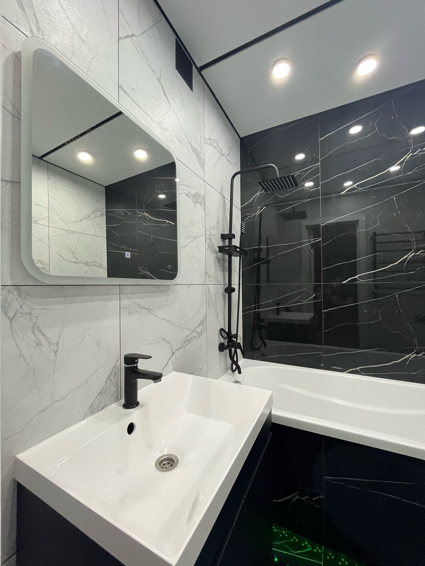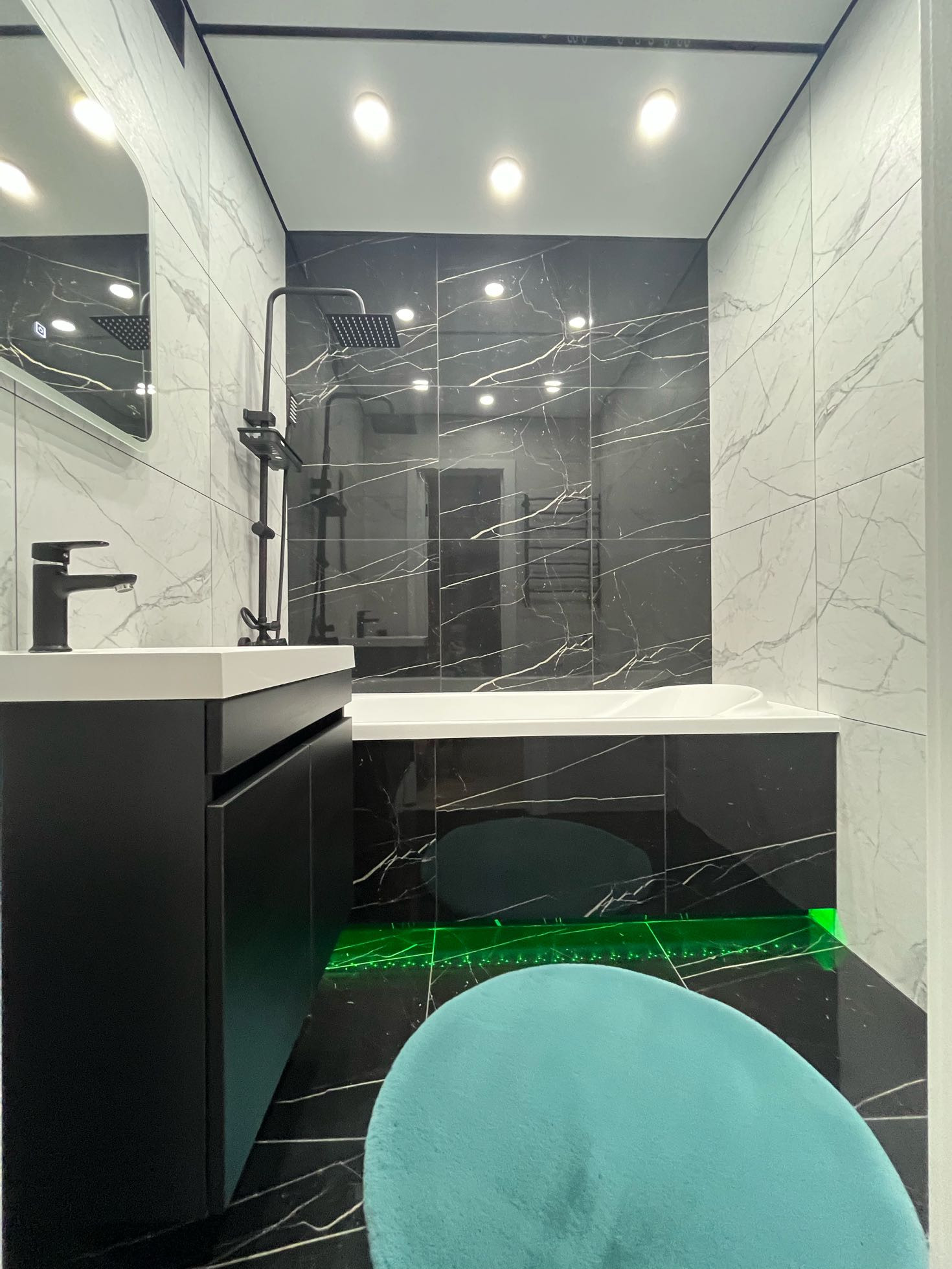 Ванная комната сделана из дорогой широкоформатной керамической плитки. Тропический душ, парящая ванна, зеркало с подсветкой не оставят вас равнодушными!
