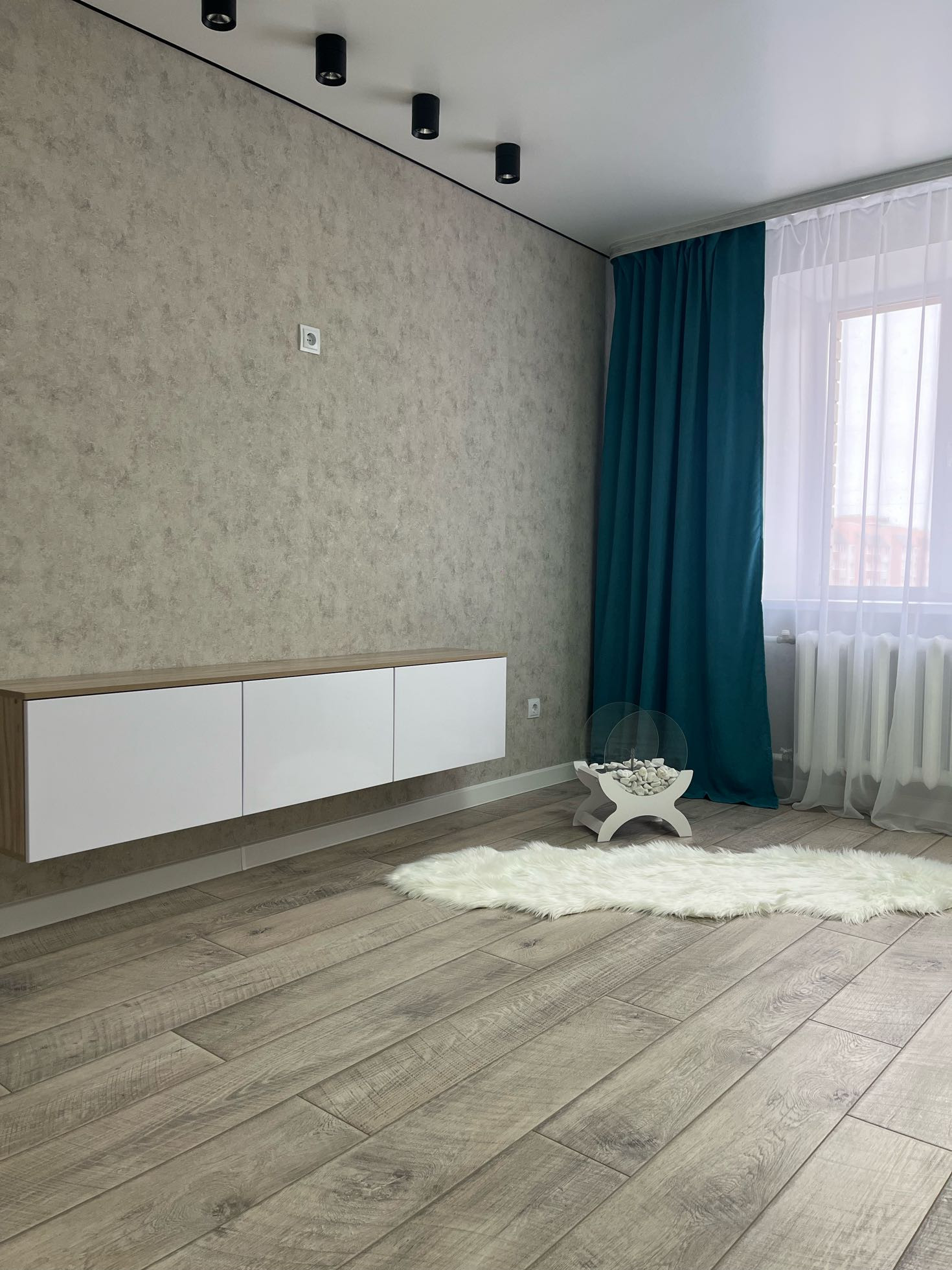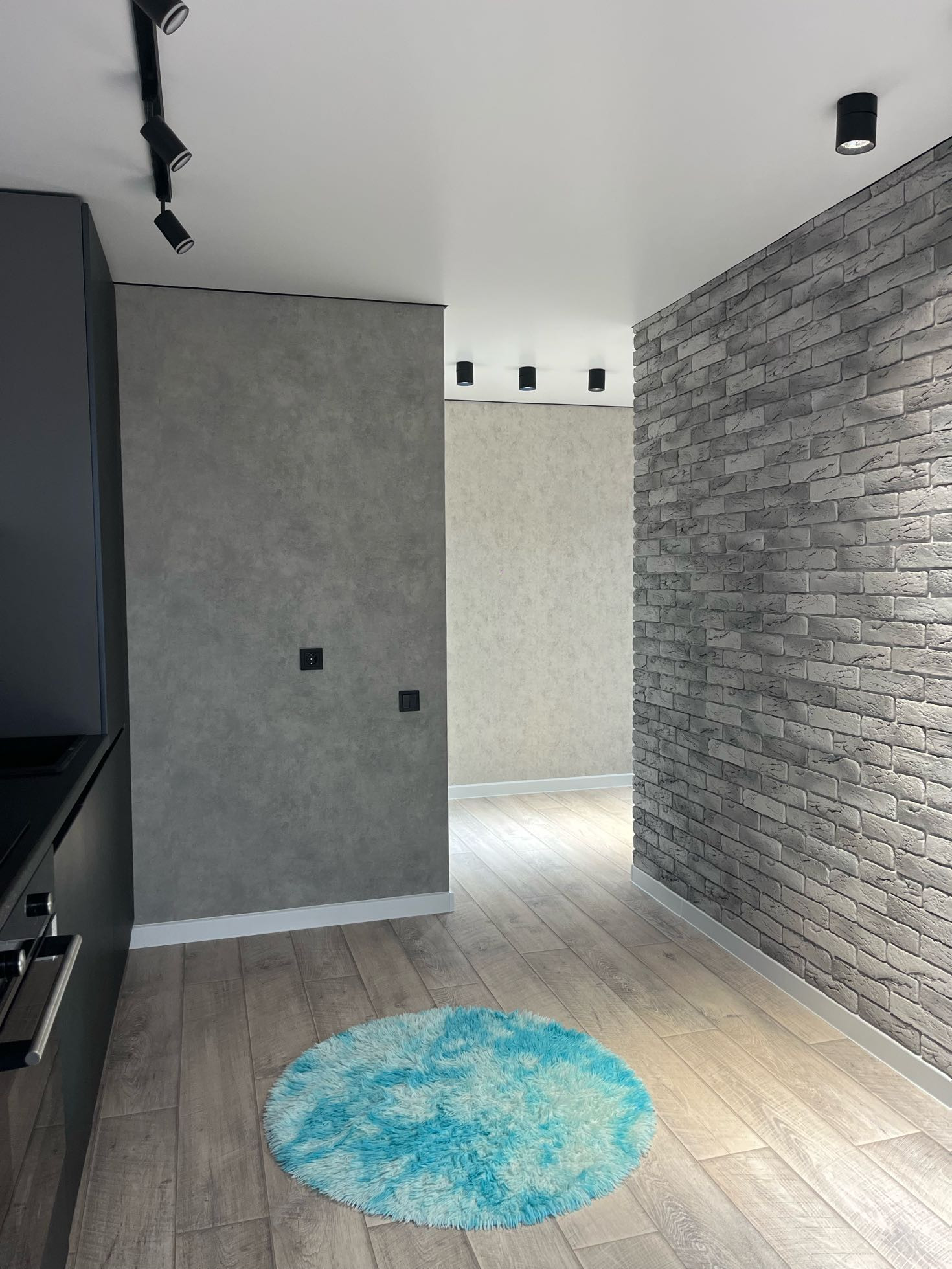 Стена на кухне выложена из декоративного камня, в зале - парящая стена.
