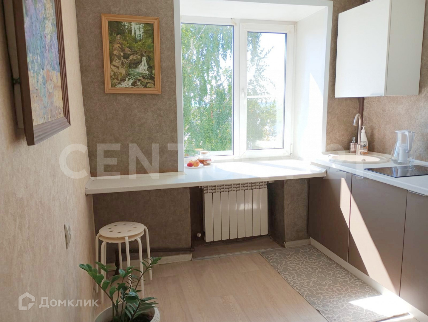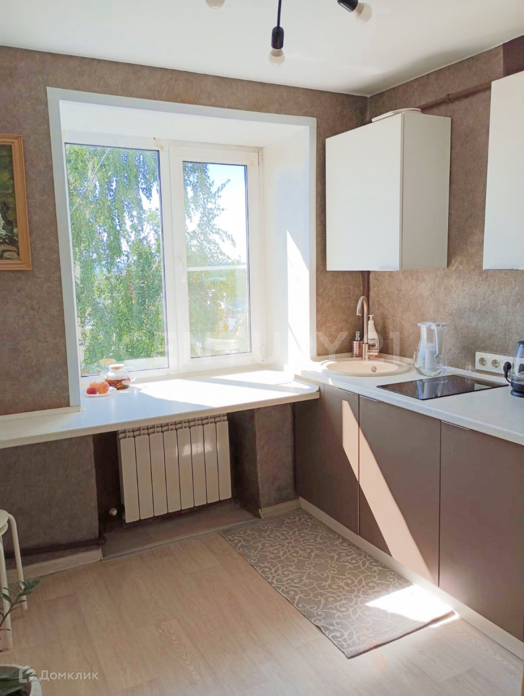 Окна смотрят на солнечную сторону, выход на застекленный балкон через комнату. Окна заменены на пластиковые. На кухне широкий подоконник, который удобно использовать как обеденный стол.