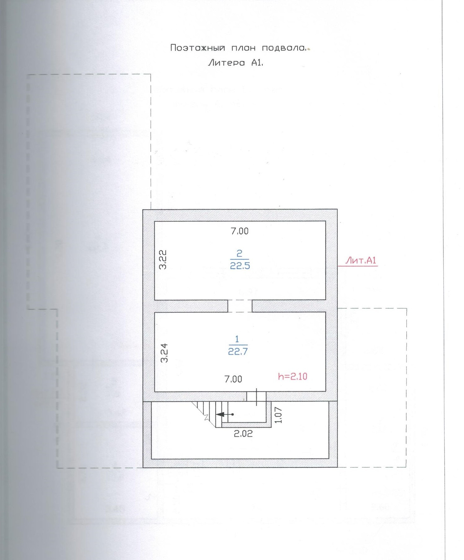 Цокольный этаж- подвальное помещение площадью 45 кв.м, состоящее из 2х комнат.