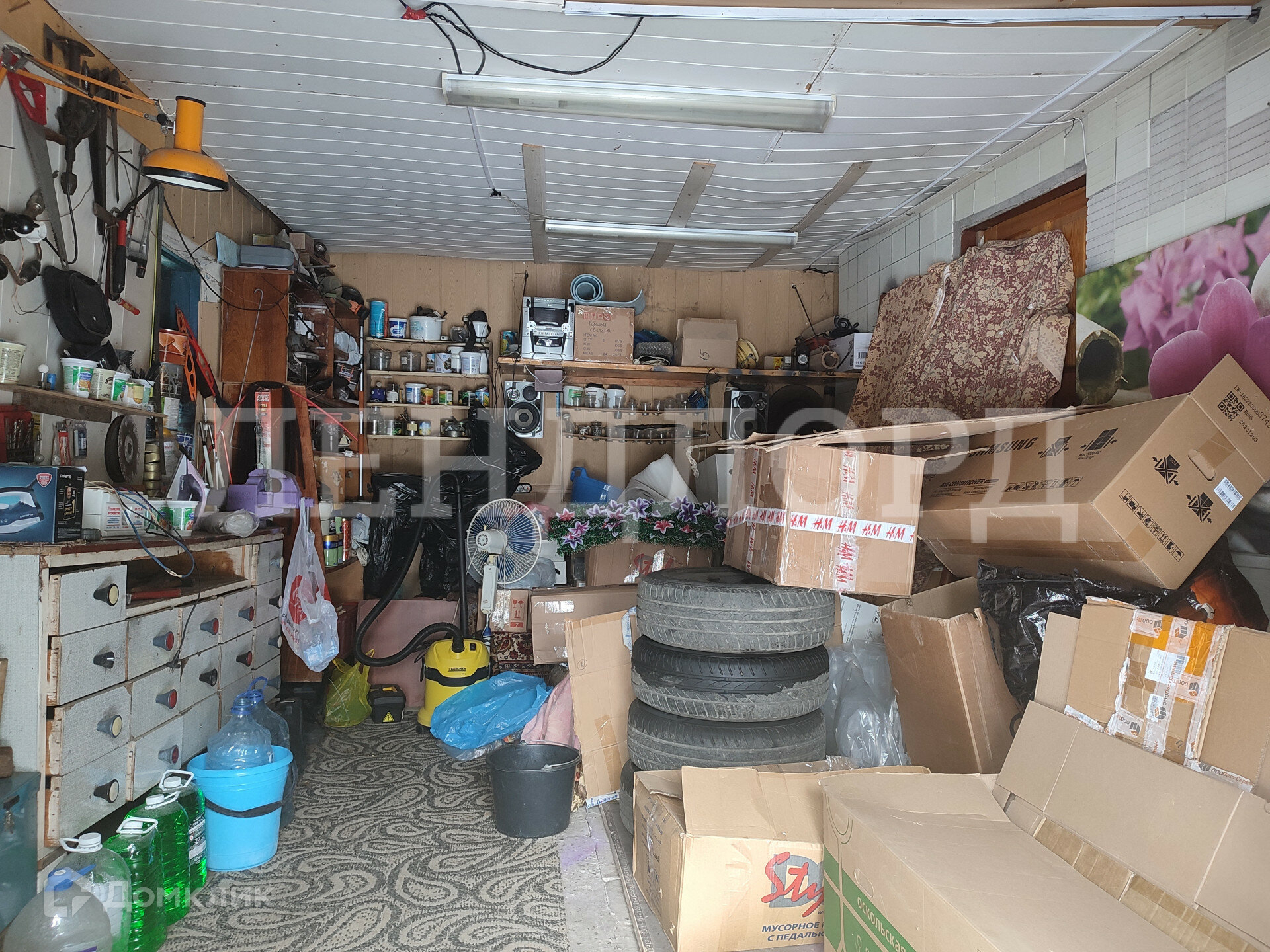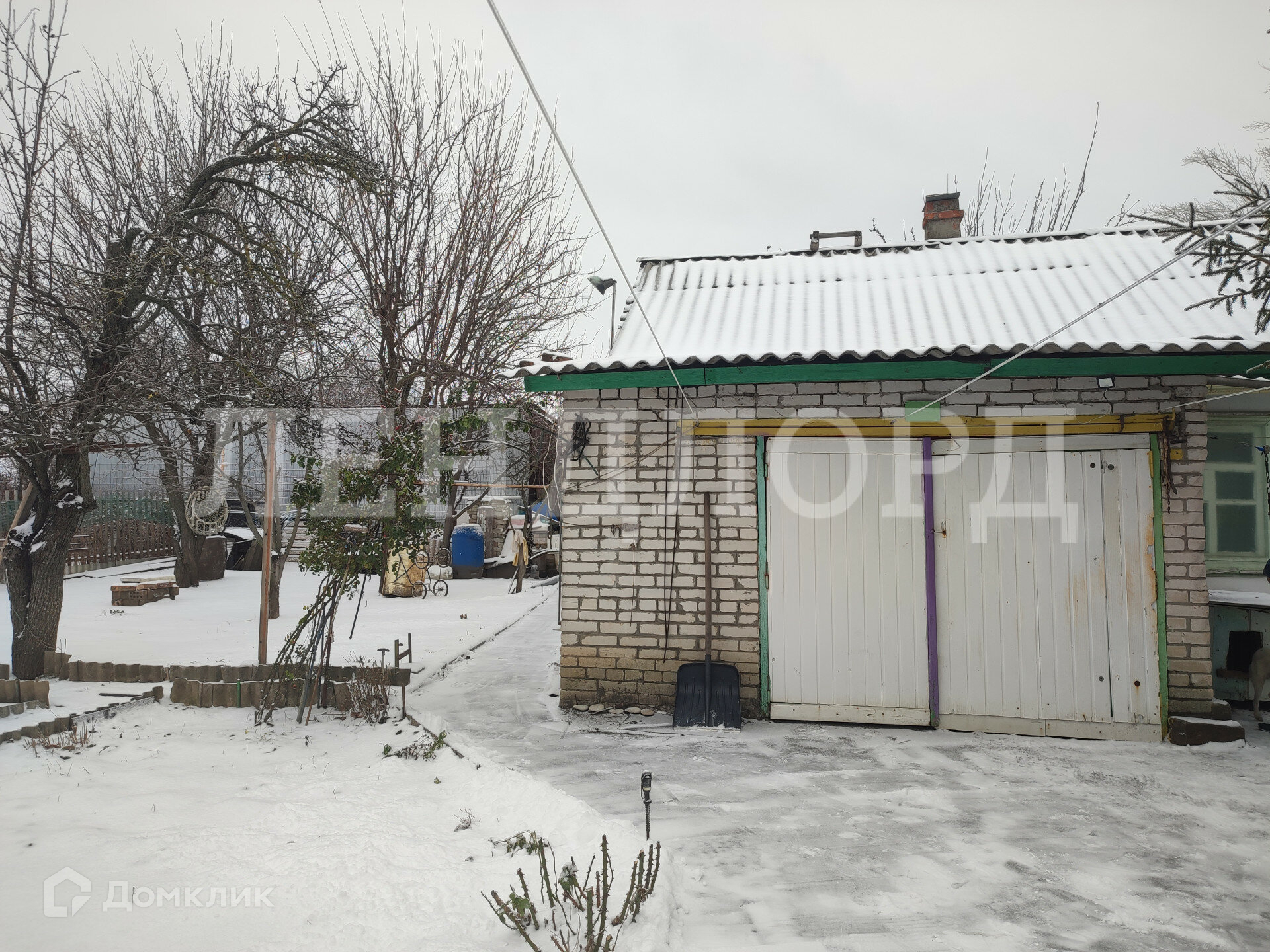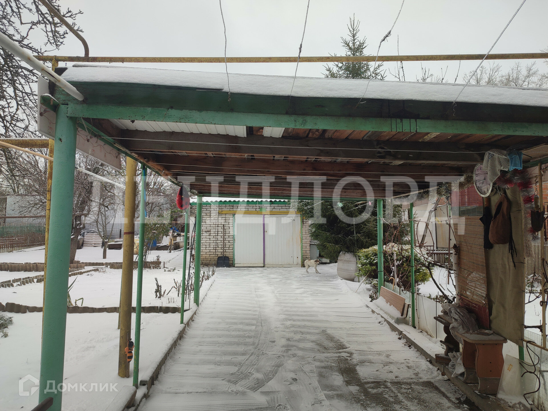 Во дворе кирпичный гараж и навес для машины.