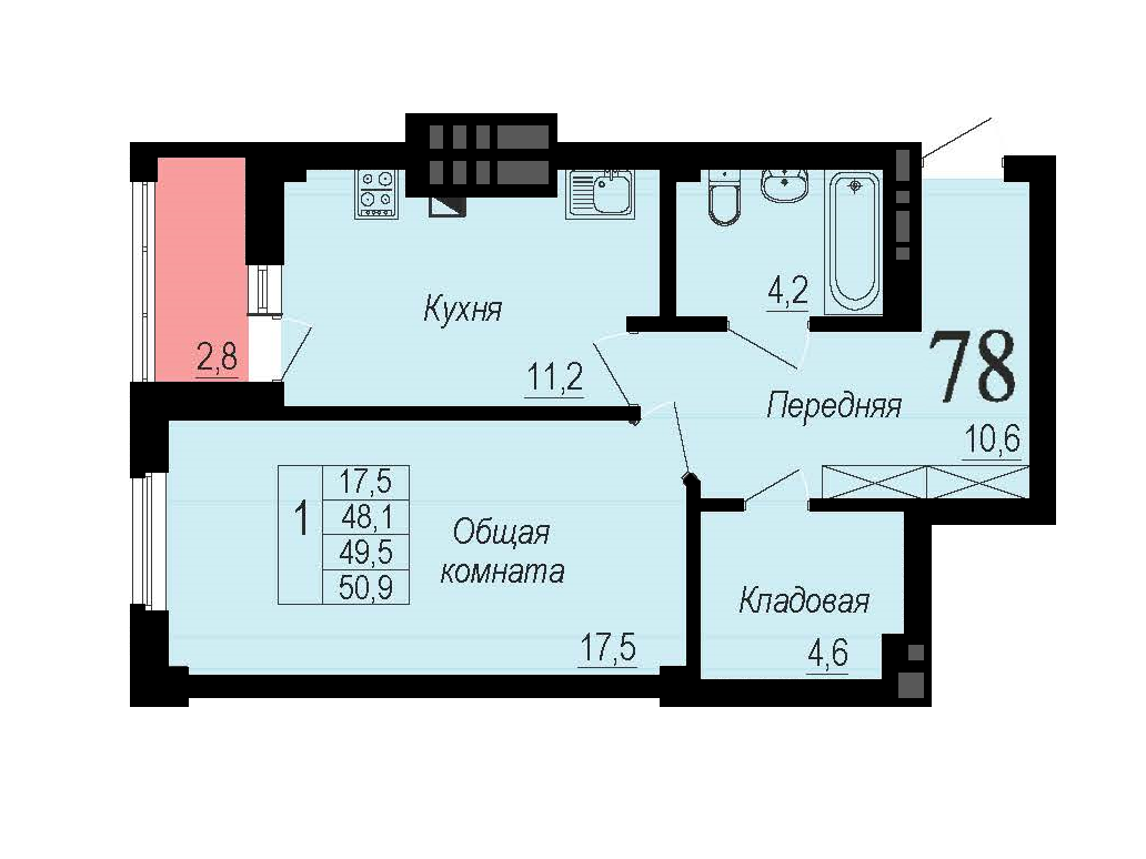 Общая площадь 50.9 м2