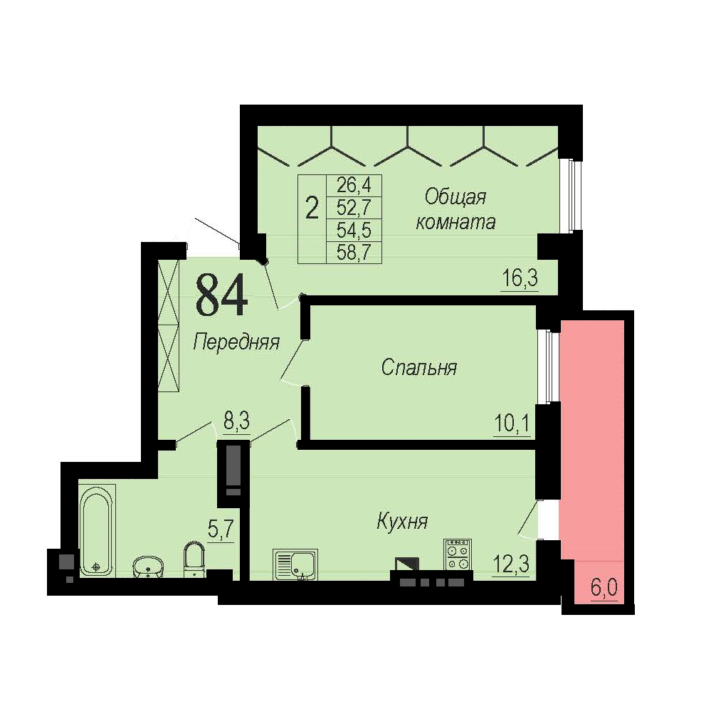 Общая площадь 58.7 м2