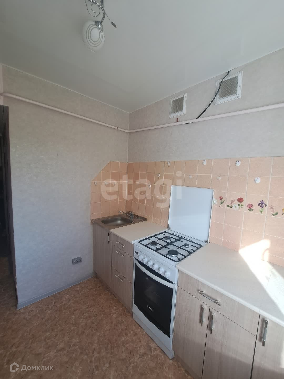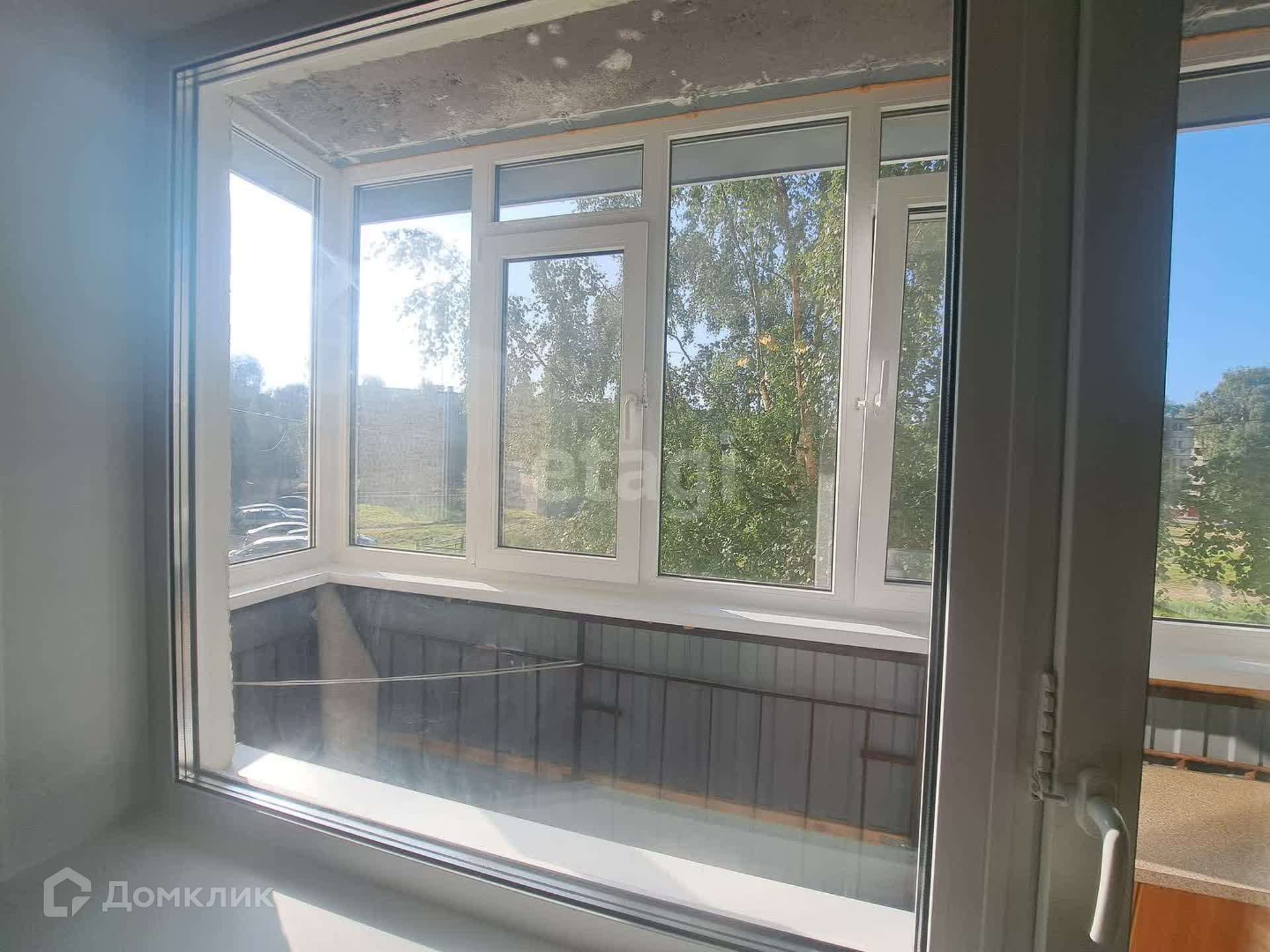 На полах уложен линолеум, окна заменены на пластиковые. Балкон также остеклен пластиком.