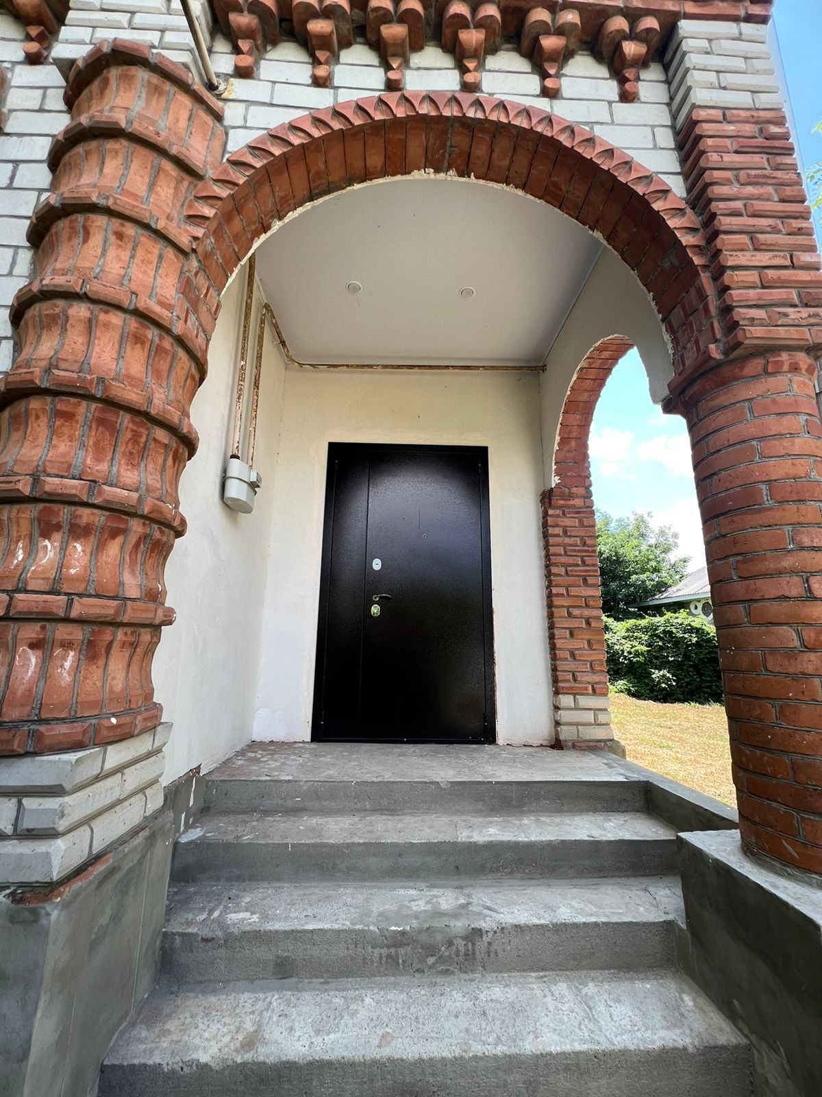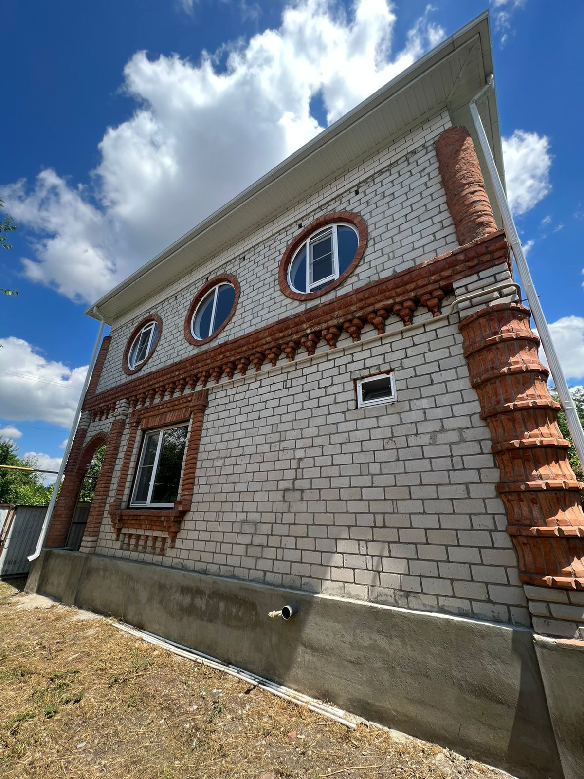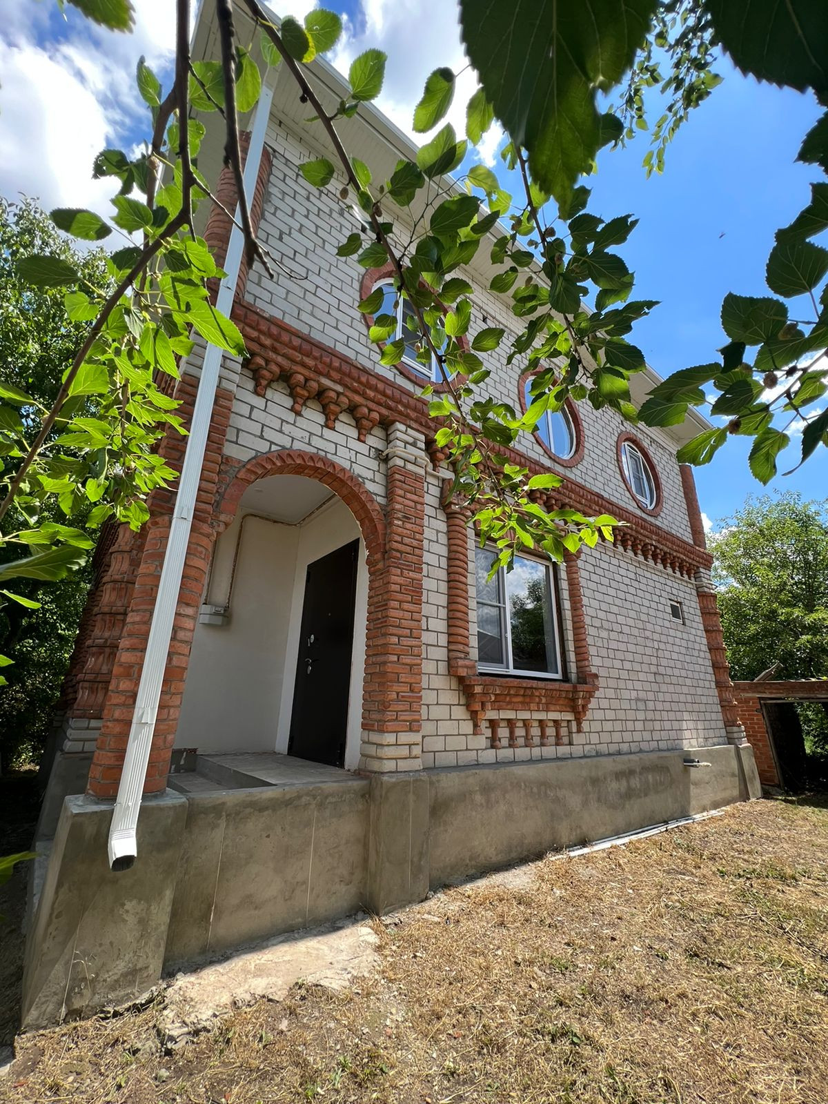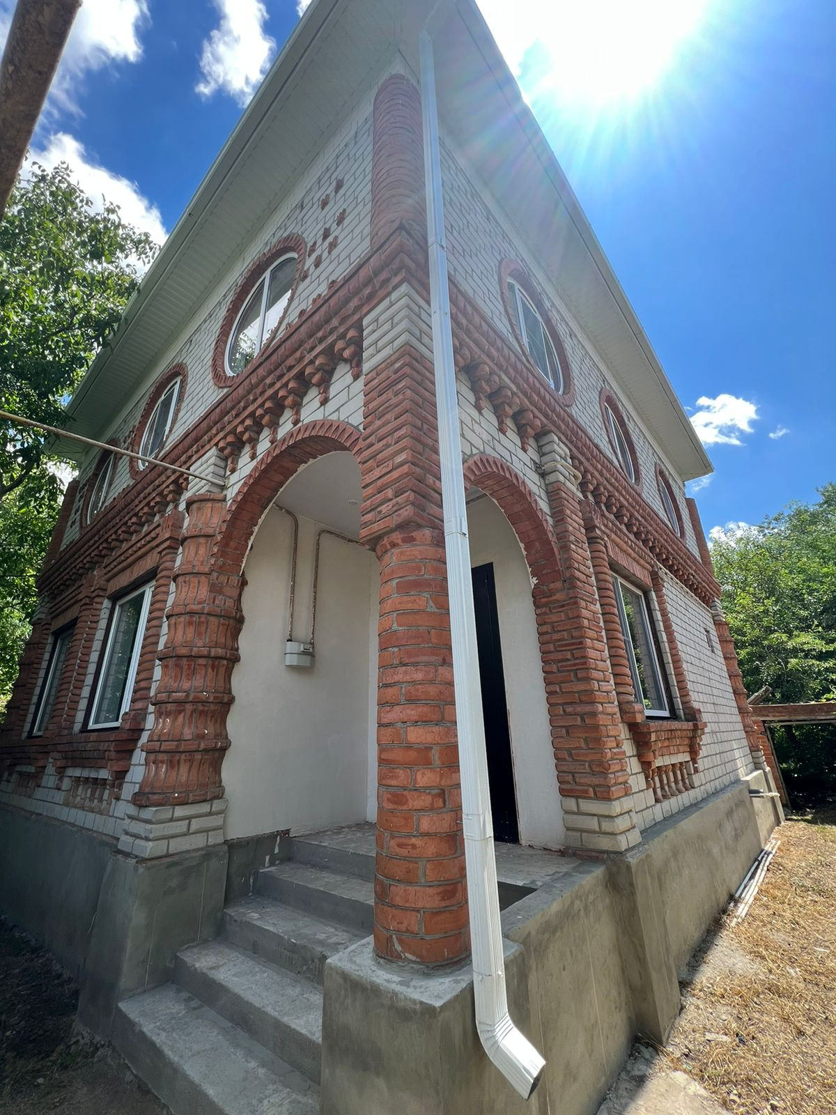 Дом построен на высоком фундаменте , полностью кирпичный .