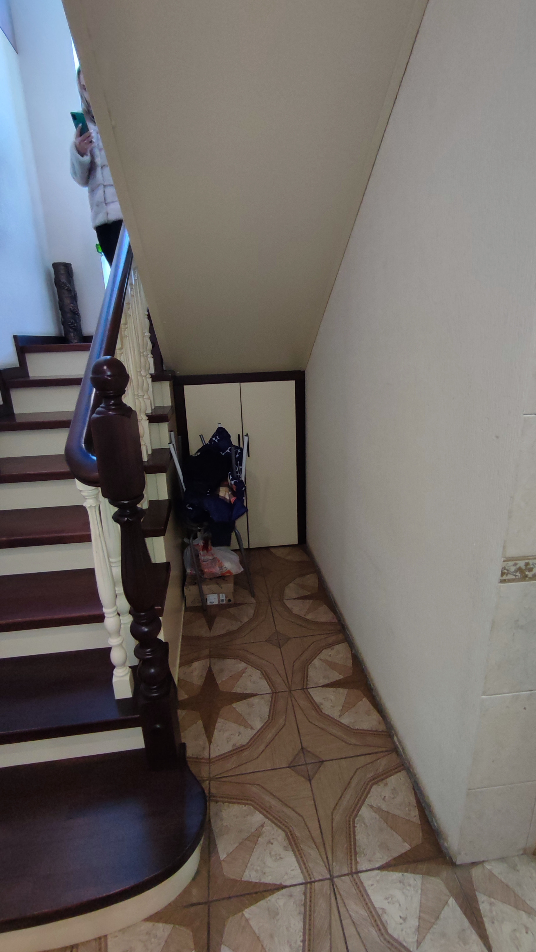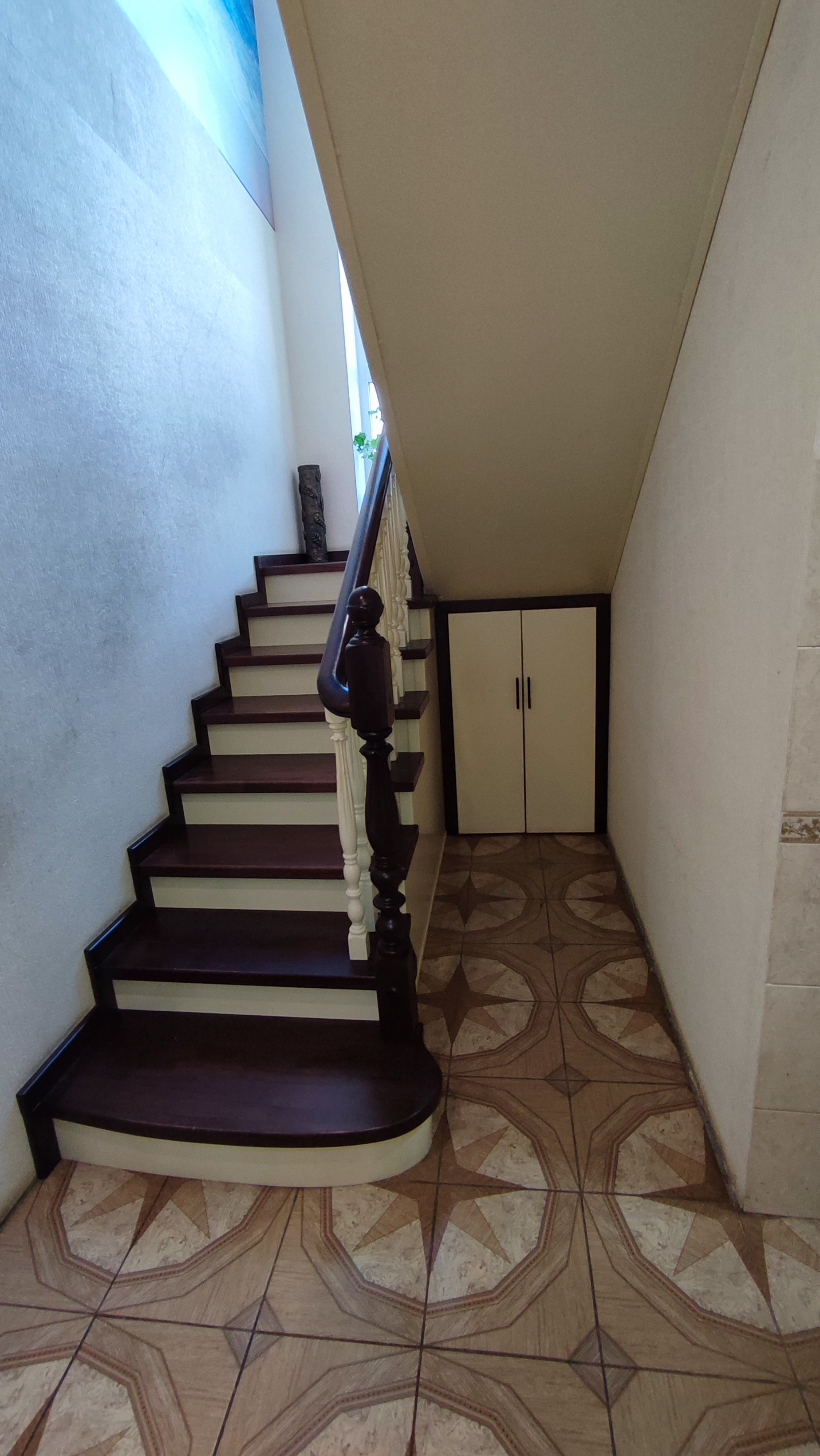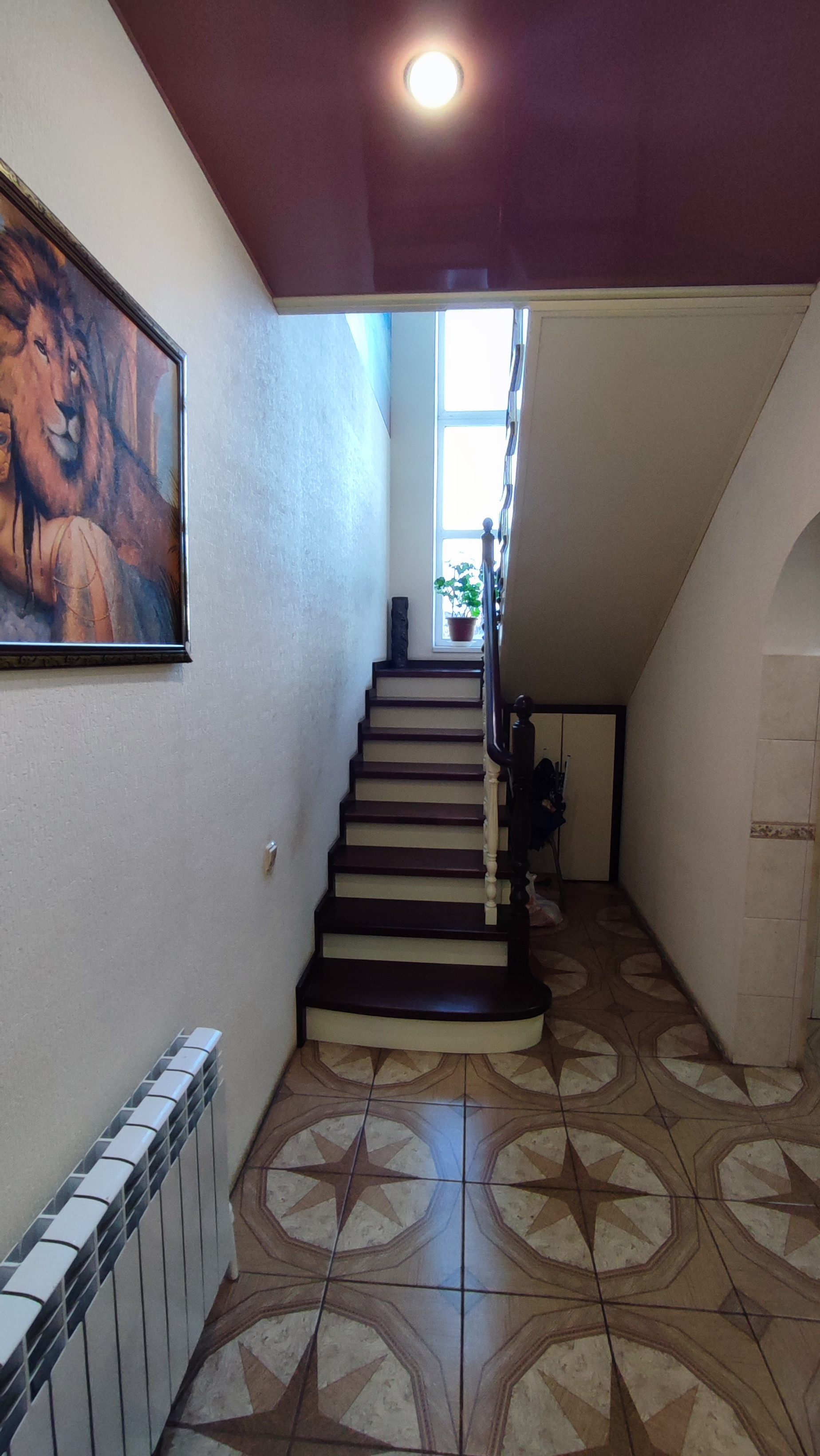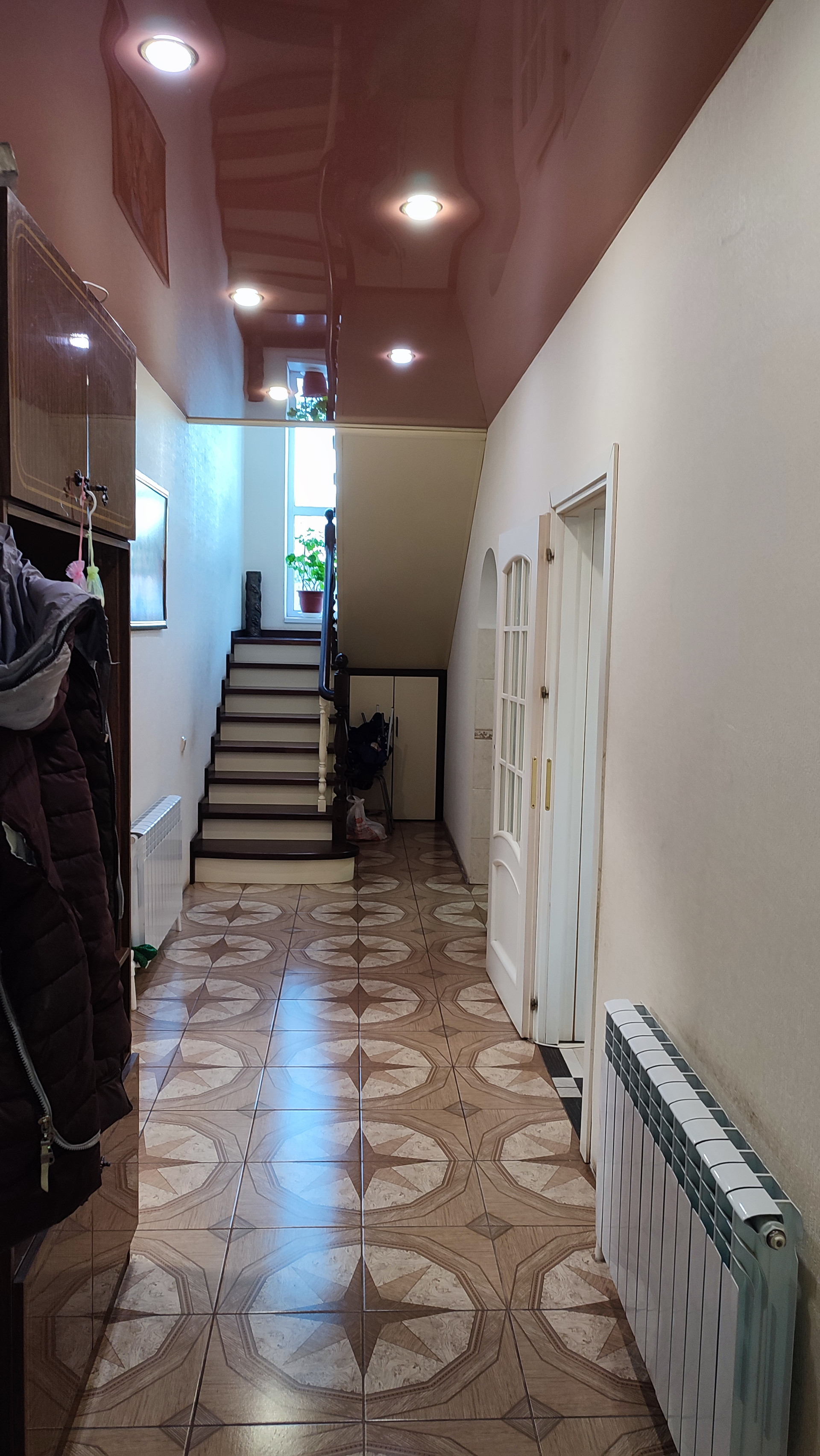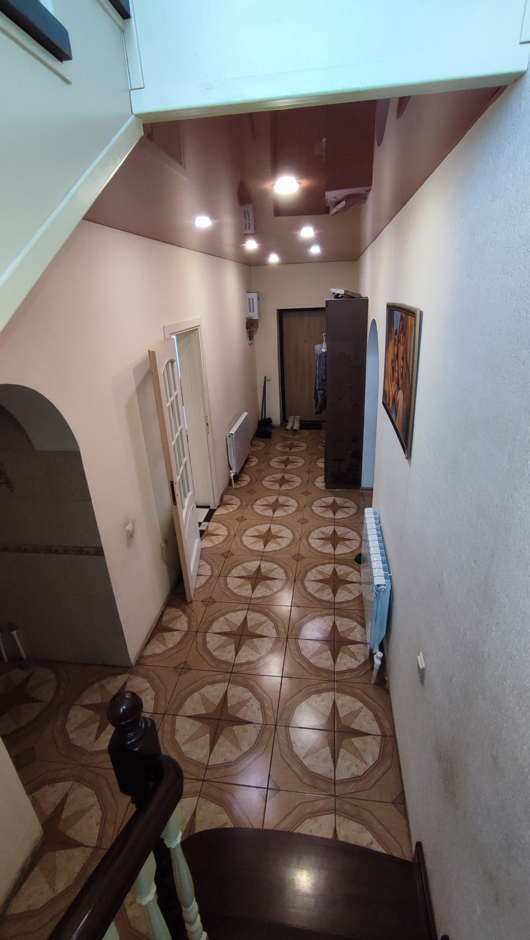 На первом этаже дома большая гостинная, кухня-столовая, сан.узел, небольшая кладовка под лестницей.На полу в коридоре плитка. На всем первом этаже сделан теплый пол. Сан.узел раздельный и облицован плиткой. Остается встроенная кухня. Лестница деревянная.