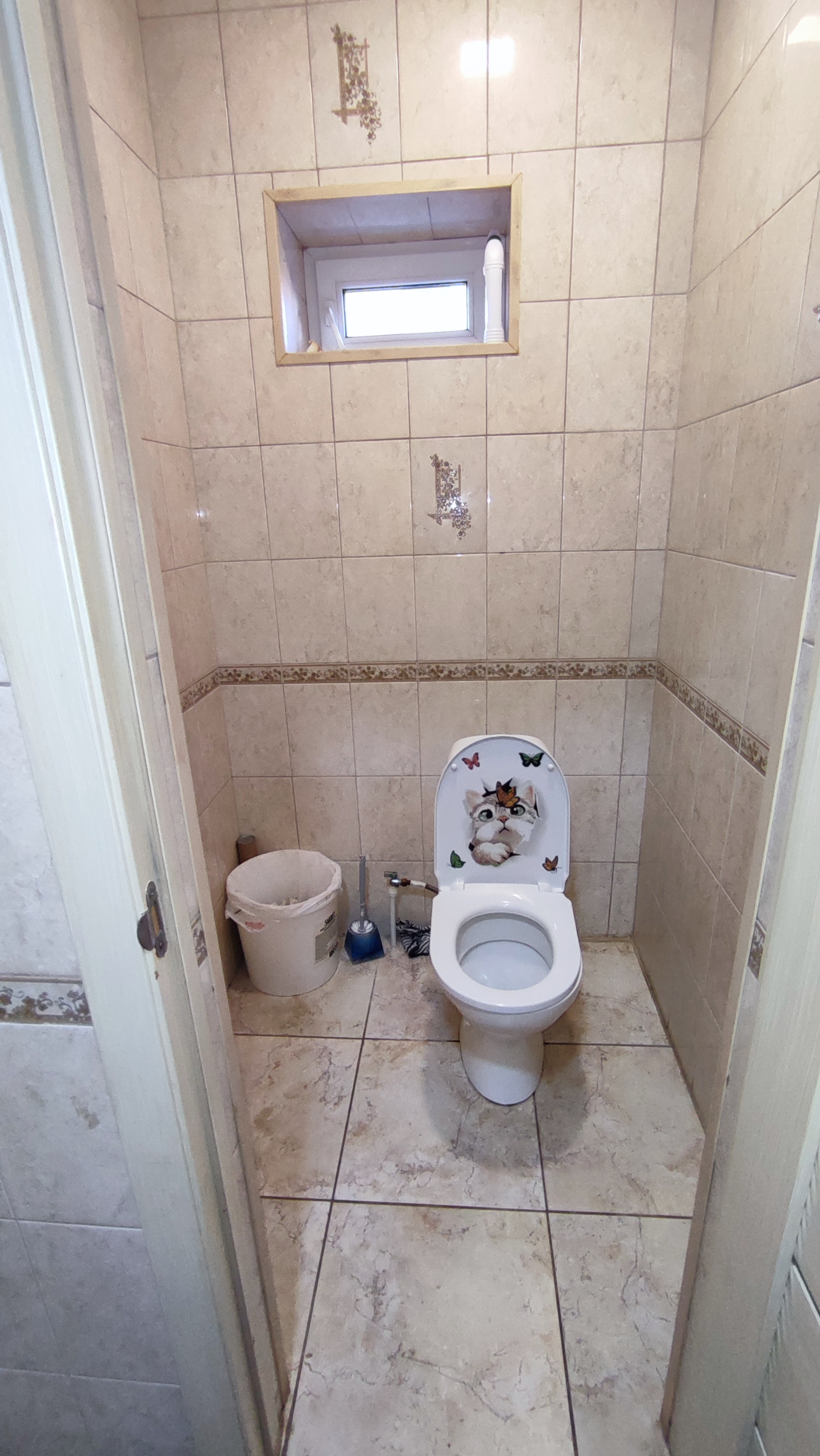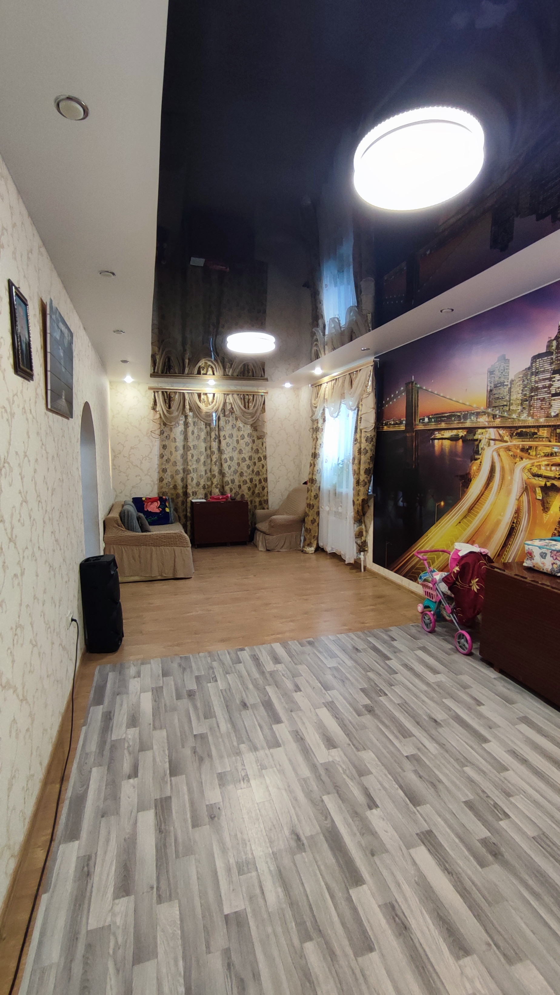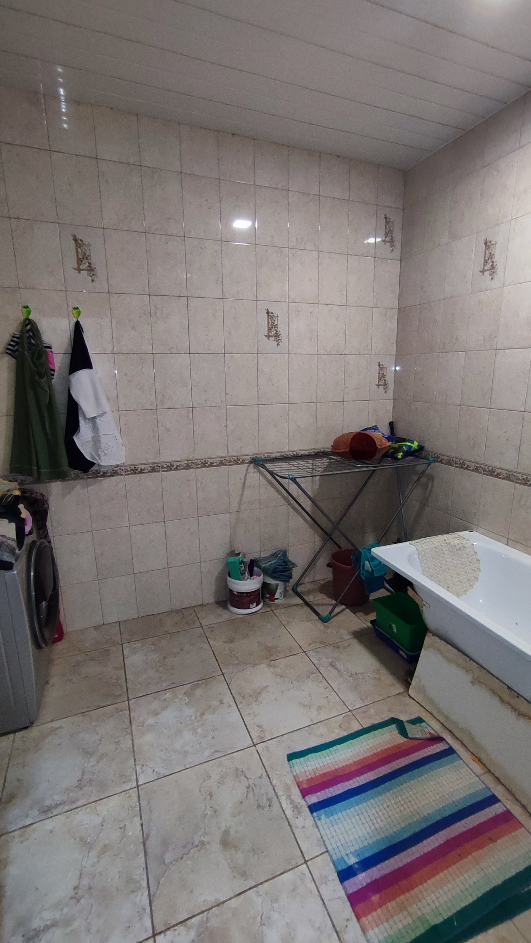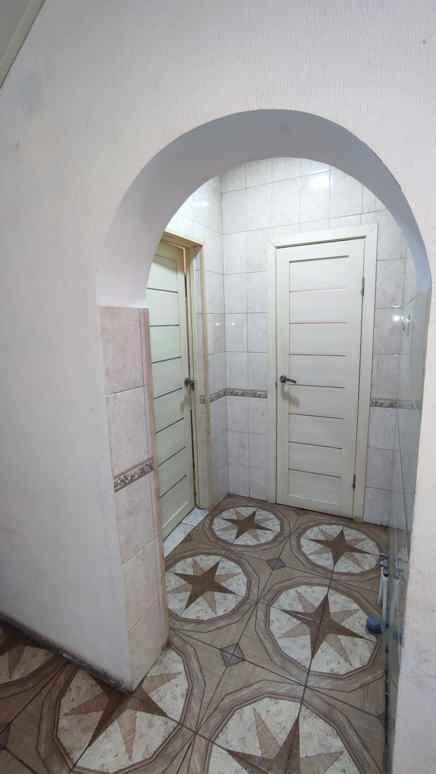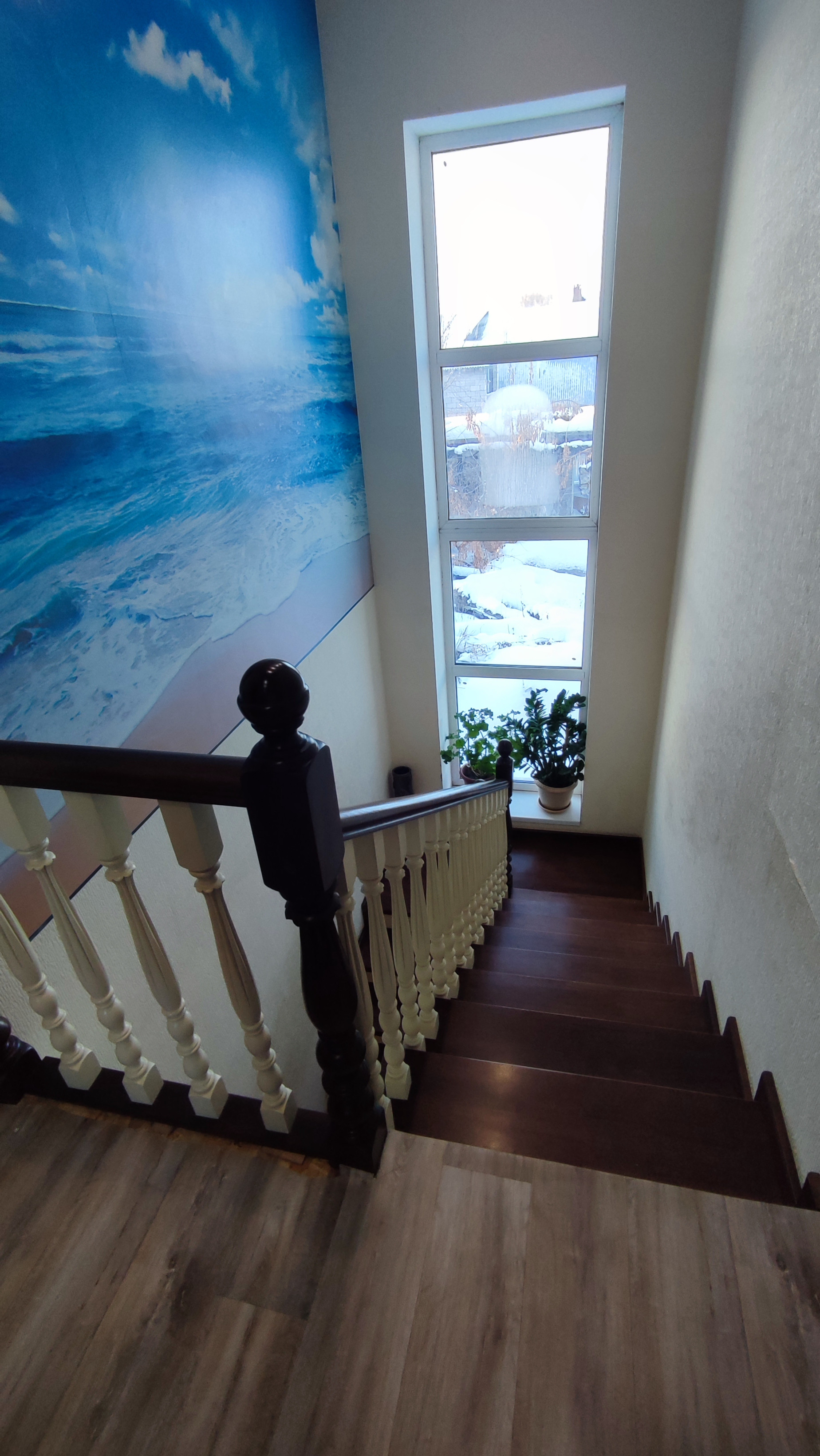 На первом этаже дома большая гостинная, кухня-столовая, сан.узел, небольшая кладовка под лестницей.На полу в коридоре плитка. На всем первом этаже сделан теплый пол. Сан.узел раздельный и облицован плиткой. Остается встроенная кухня. Лестница деревянная.