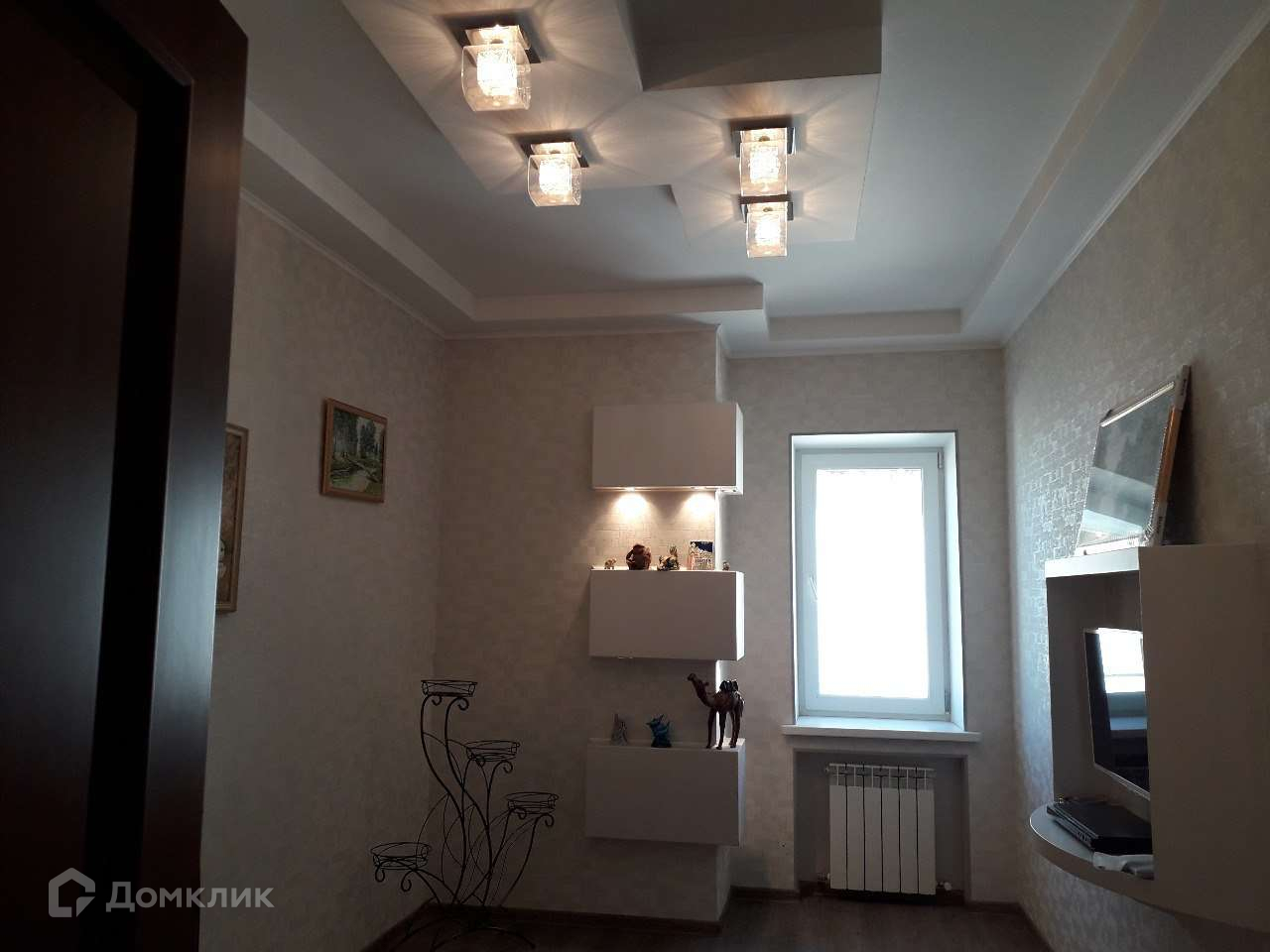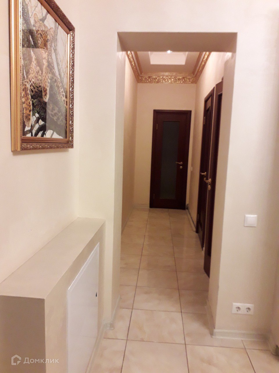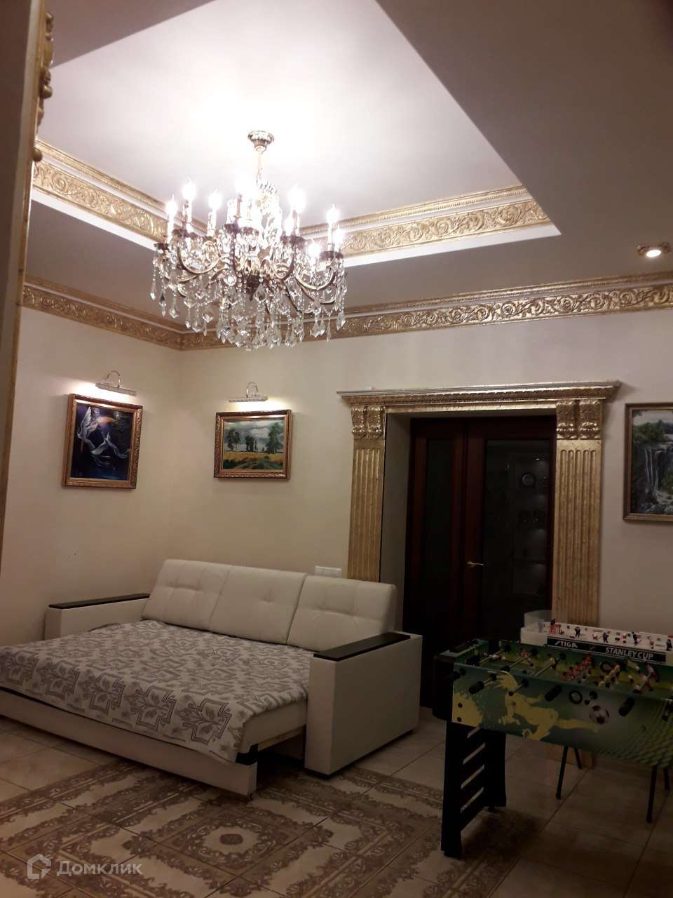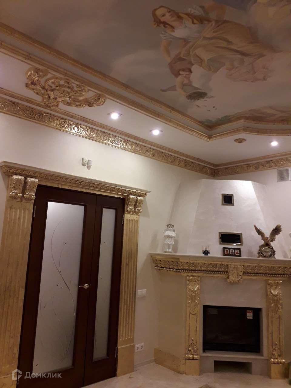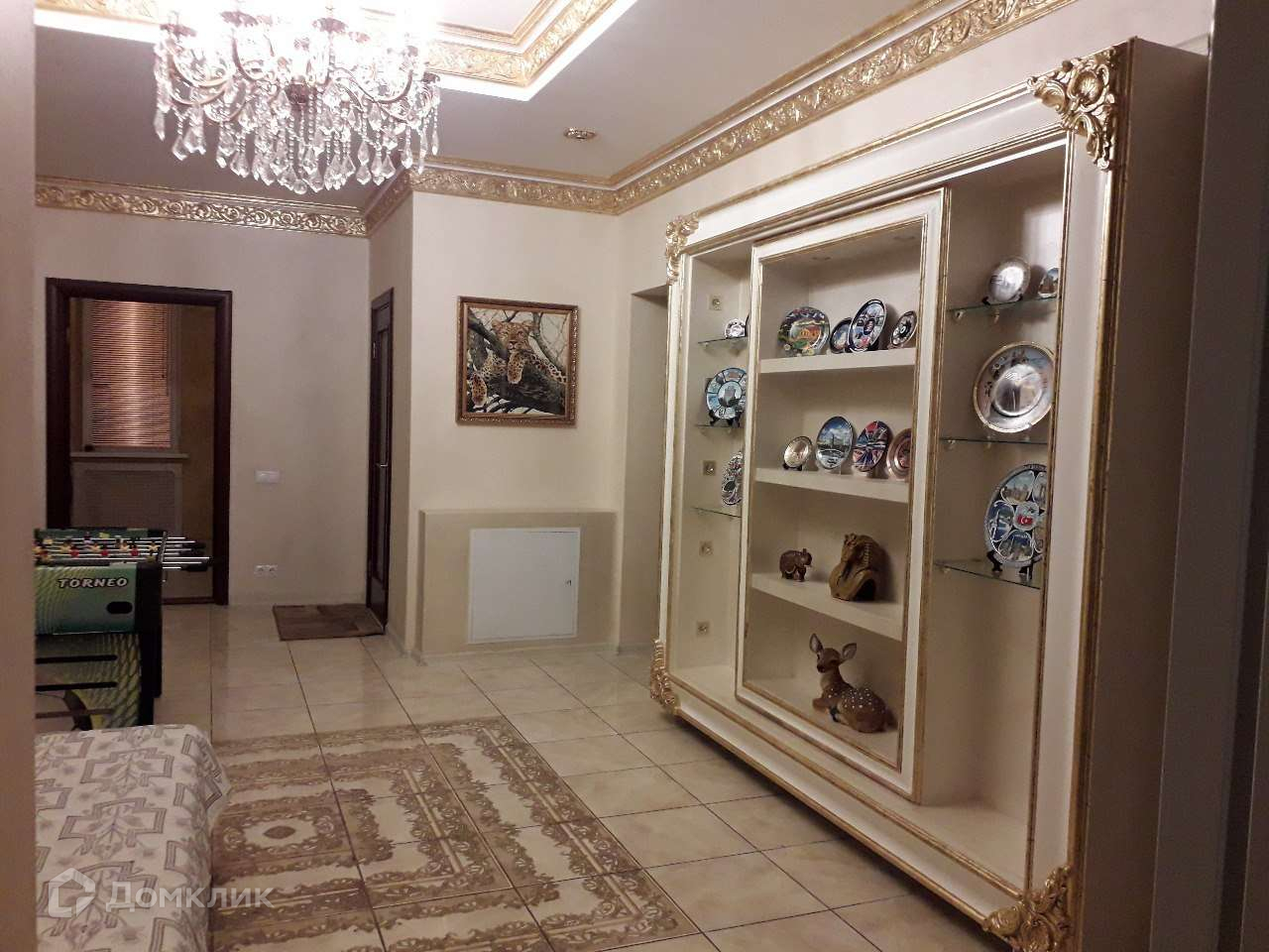Далее проходим в шикарный холл, на полу коллекционная плитка. У стены красивые полки с подсветкой. Справа от входа в холл, расположена гостинная в царском стиле Елизаветы 2. Так же в гостинной в левом углу стоит настоящий камин, отделанный натуральным камнем и лепниной с золотым покрытием. Холл и гостинная оформлены в стиле РОКОКО.