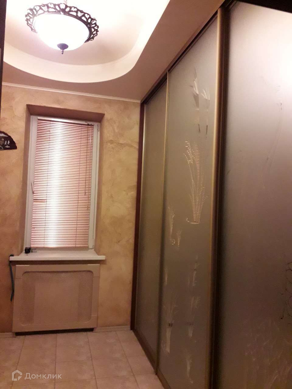 На первом этаже дома в прихожей на всю стену стоит очень вместительный встроенный шкаф-купе.На полу плитка и стены оформлены декоративной штукатуркой.