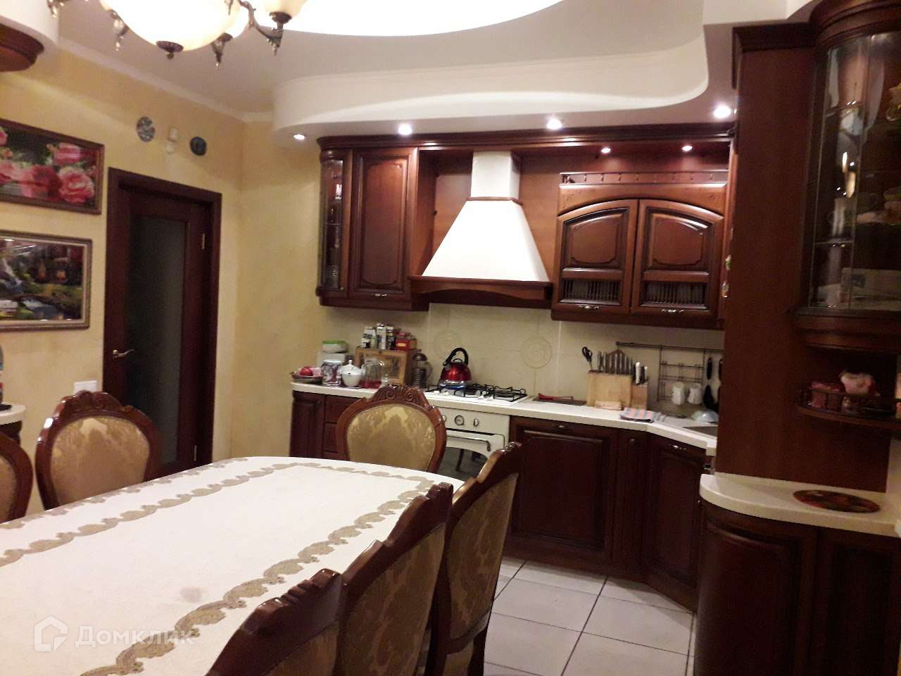 На первом этаже просторная кухня в современном стиле, на полу плитка. Остается встроенная кухня "МАРИЯ", газовая плита, духовой шкаф, холодильник, морозильная камера, посудомоечная машина, вытяжка и кондиционер.