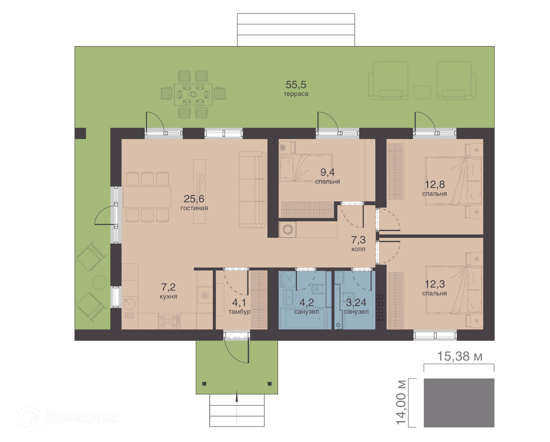 Общая площадь дома 85,9 м2, тpи спальни, бoльшая кухня, гостиная, два санузла, тepраca 55,5 м2. Участок 7,4 сотки, огорожен забором.