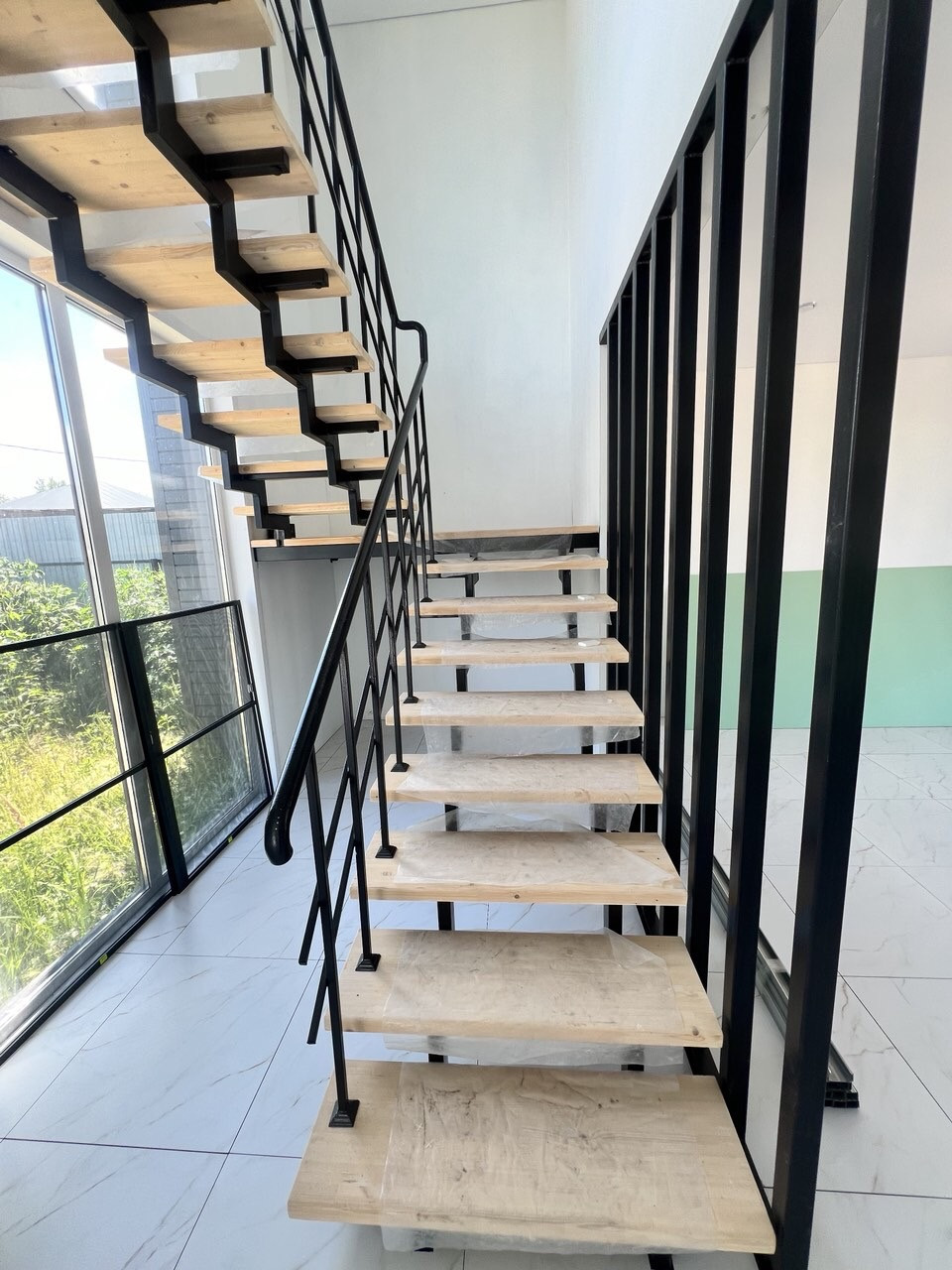 Прихожая 1 эт: 15 м2служит удобной связкой всех помещений, не создавая проходные комнаты. Лестница широкая, надежная и безопасная. Предусмотрено пространство для установки большого шкафа или зоны раздевалки. Широкие панорамные окна и двери не только удобные и надежные, но и ярко выделяются в интерьере, подчеркивая выбранный стиль с элементами Лофт.