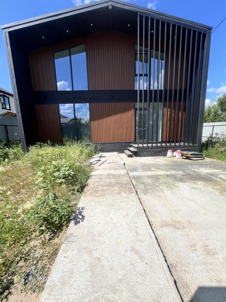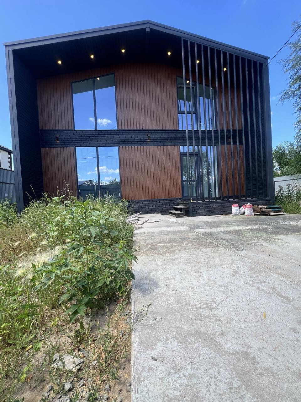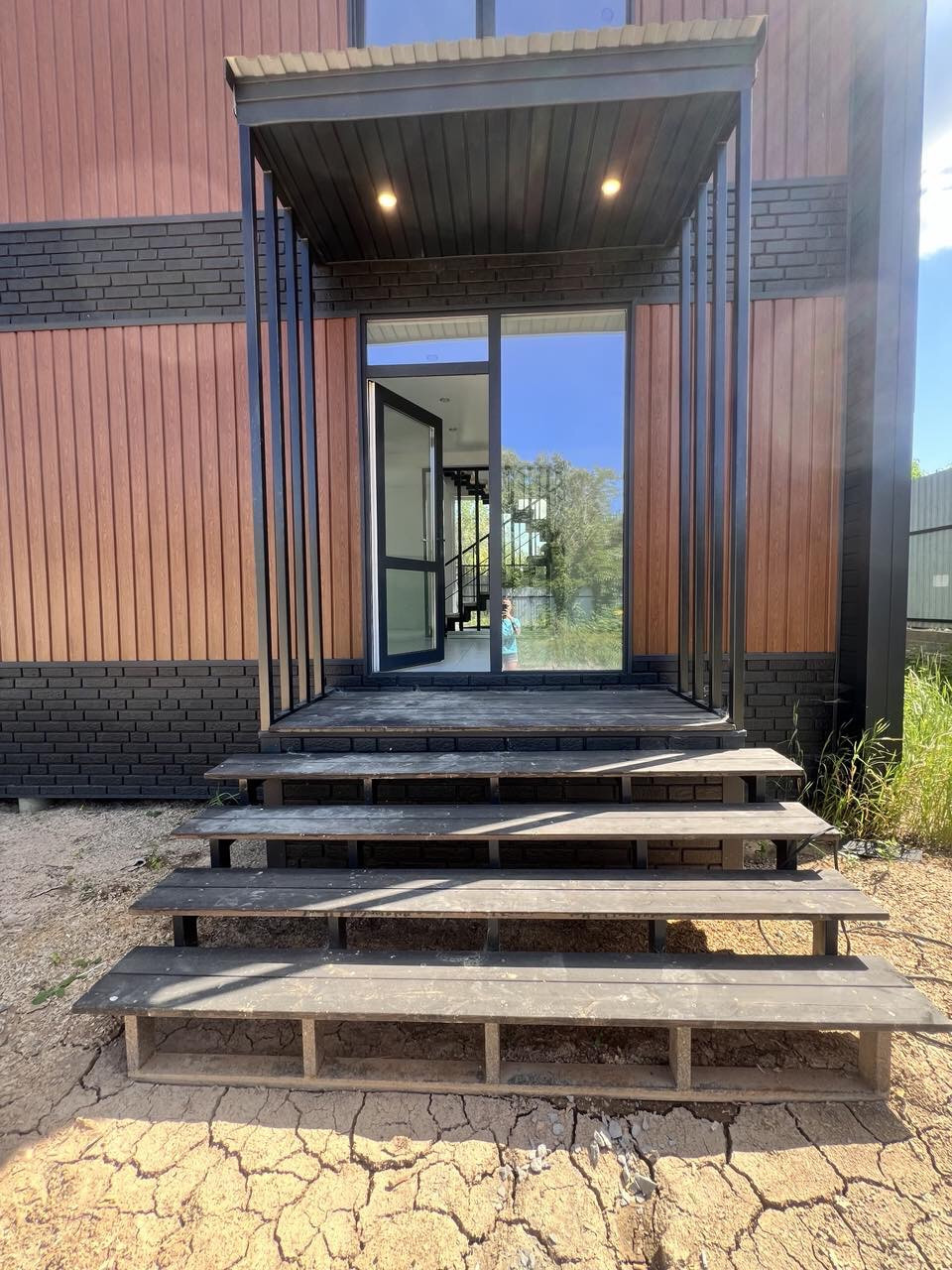 Передняя входная группа 4,5м2 с террасный доской и навесом с двойным освещением.