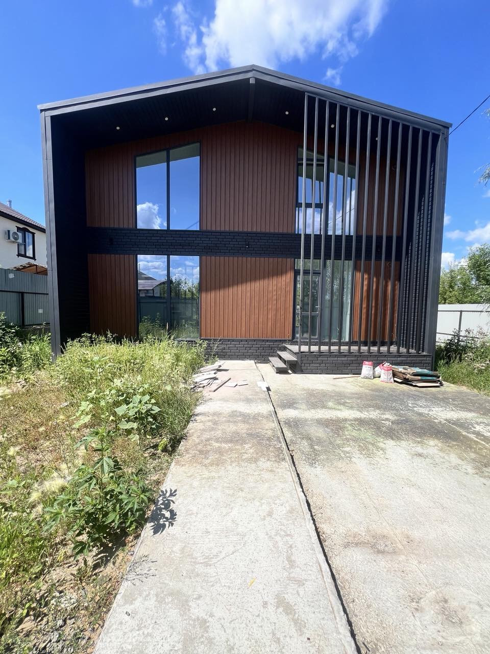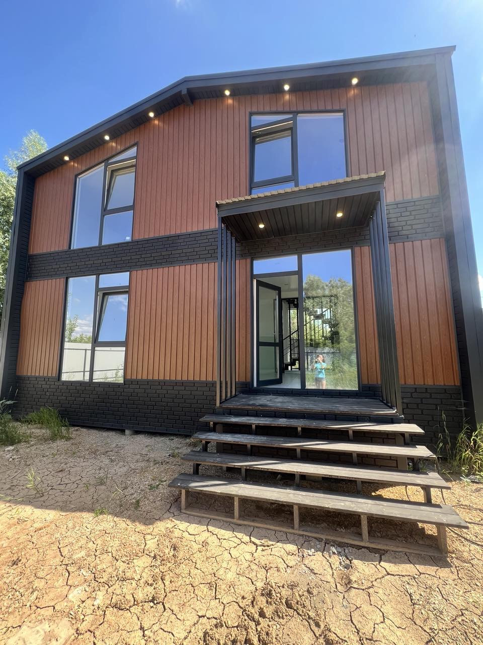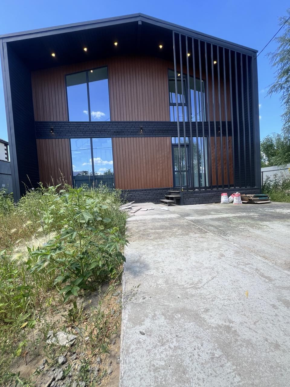 Передняя входная группа 4,5м2 с террасный доской и навесом с двойным освещением.