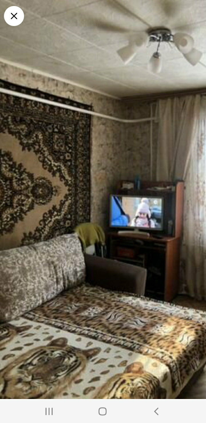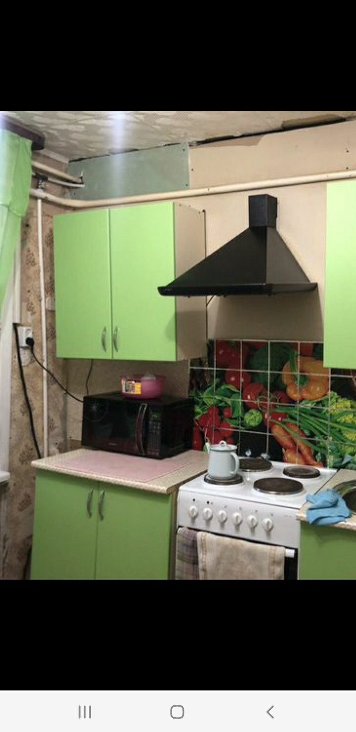 Дом щитовой. Квартира теплая. Чисто и уютно, состояние под ремонт. Окошки обычные. Две комнаты раздельные. В одной комнате остаются шкаф и диван. На кухне остаются вытяжка и электроплита.