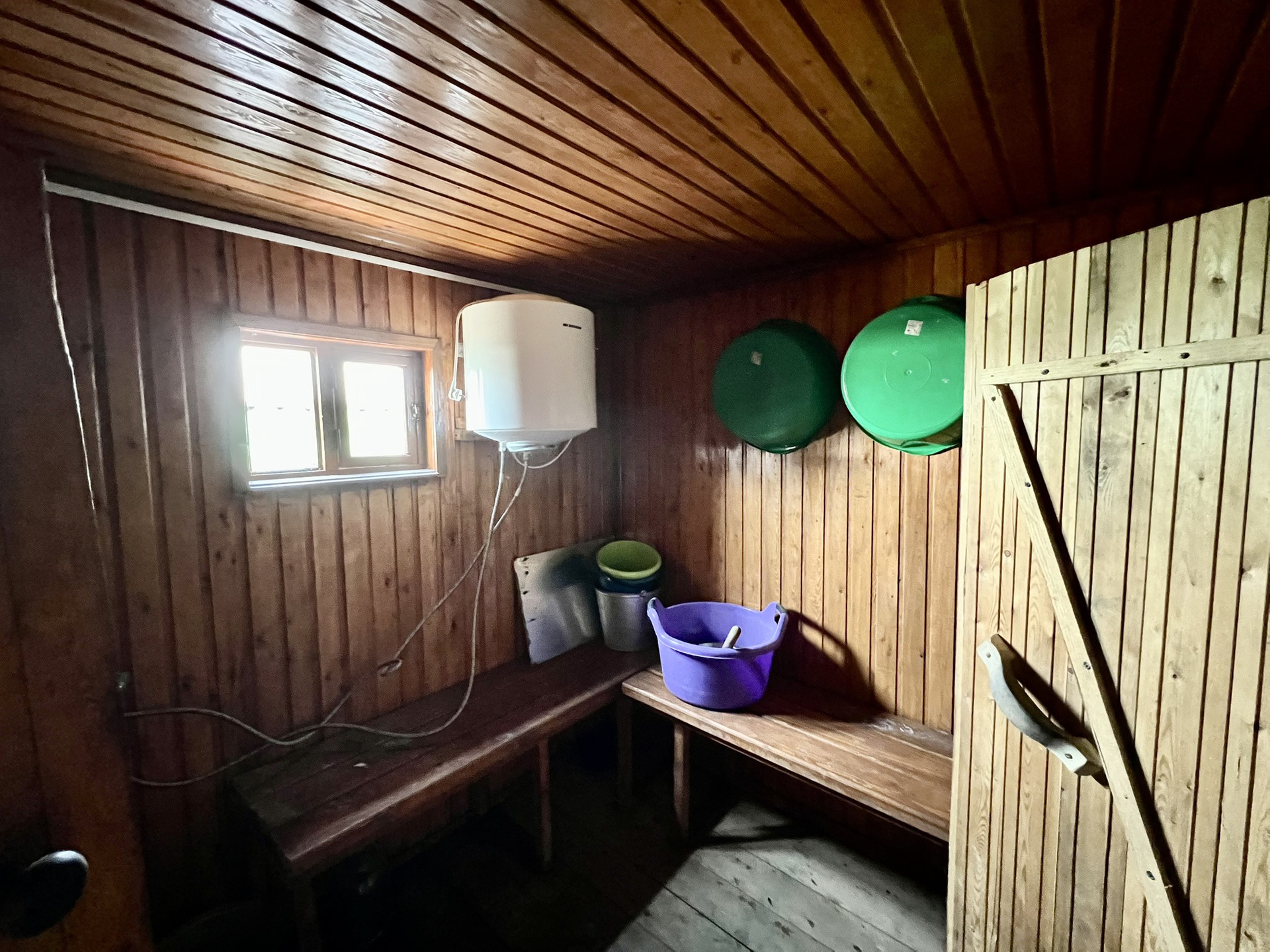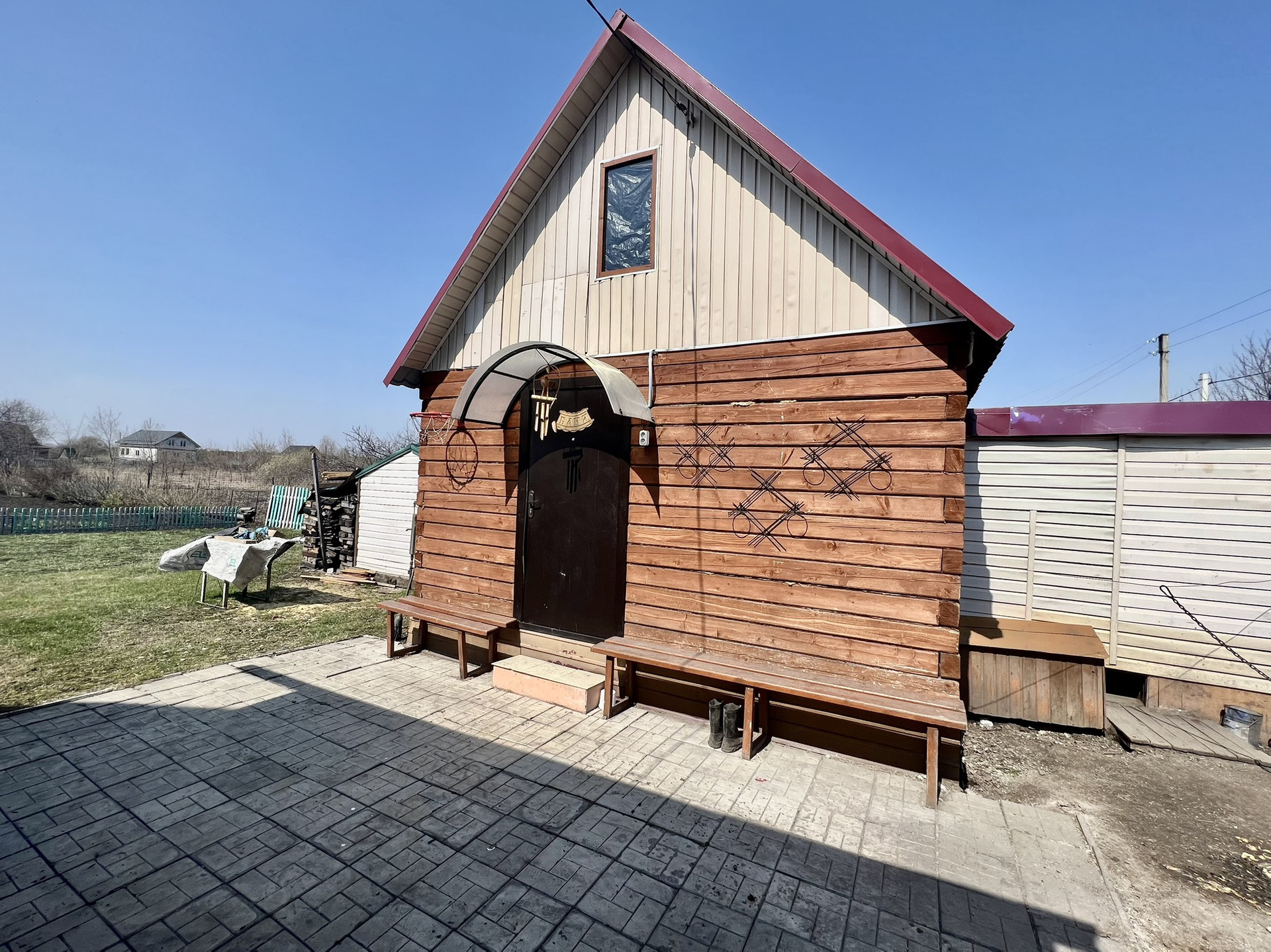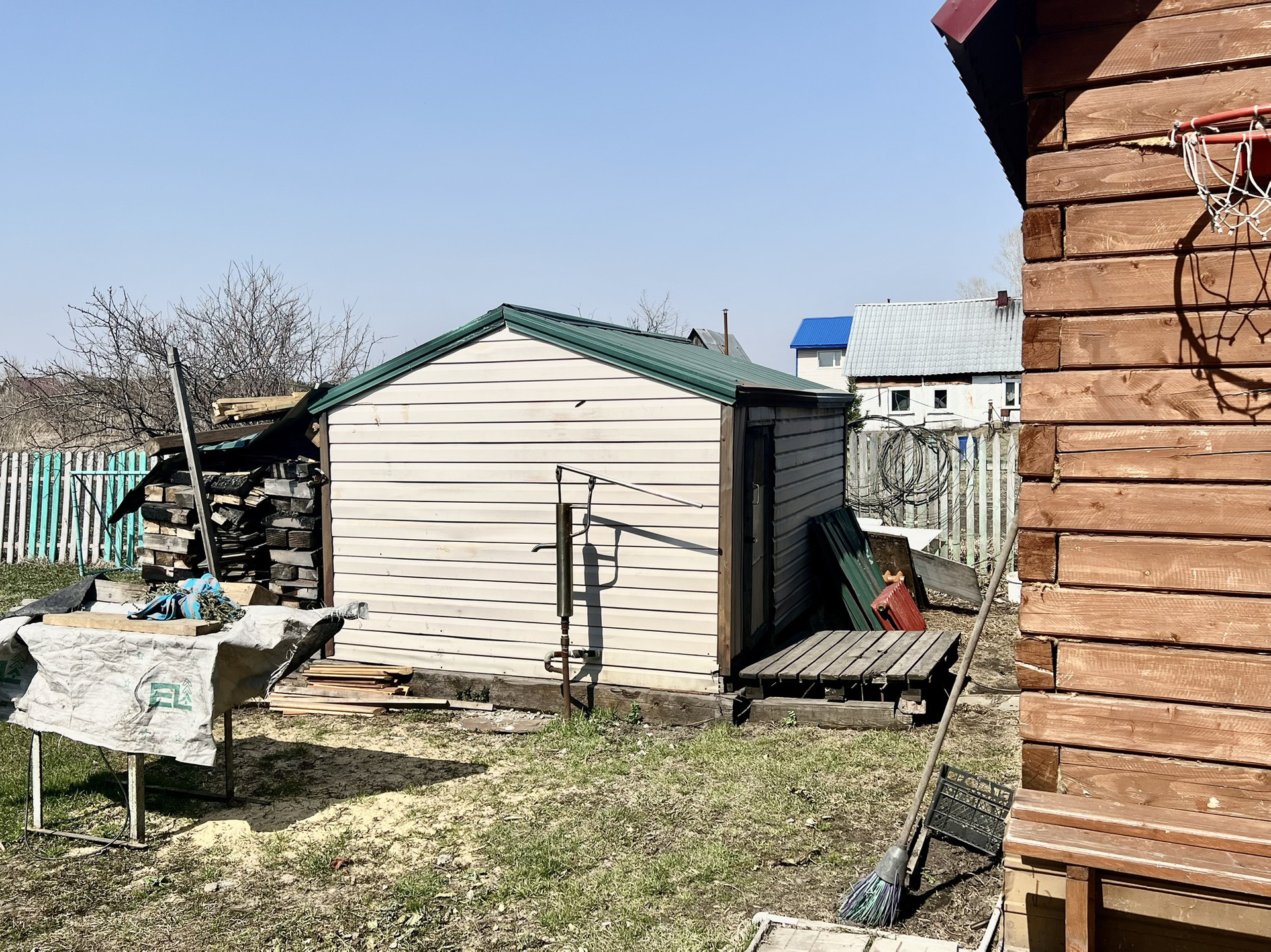 Рядом напротив из входа располагается второй дом,-оборудованы сауна со стеклянной дверью и баней. А также просторный капитальный гараж 10*5 и углярка. Дом, углярка и баня, - всё обшито сайдингом.