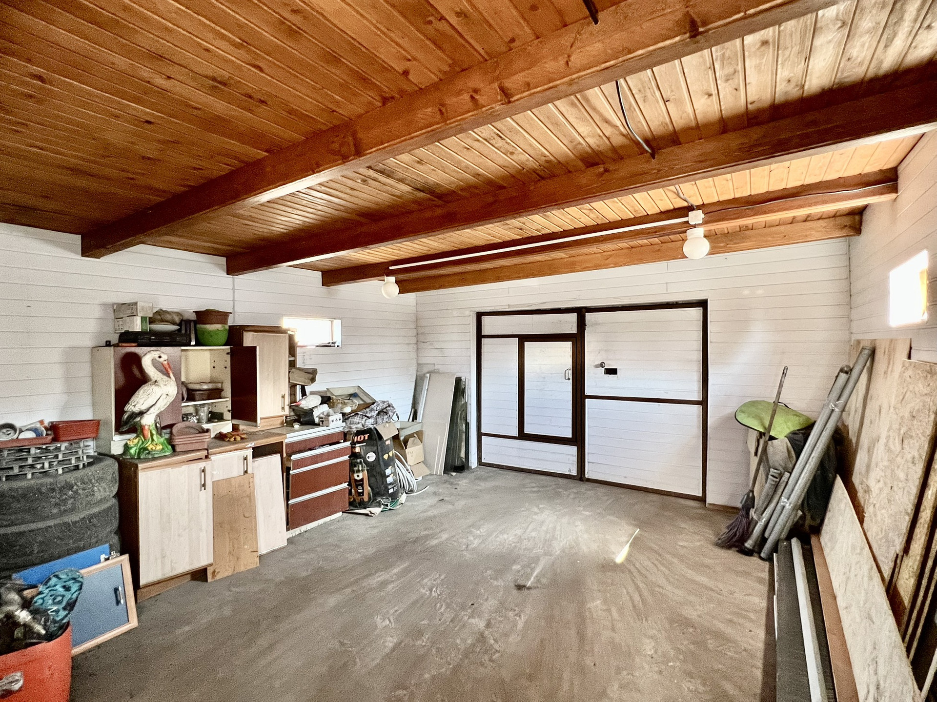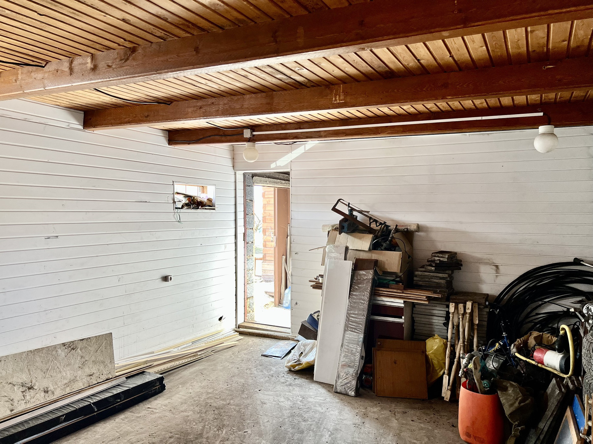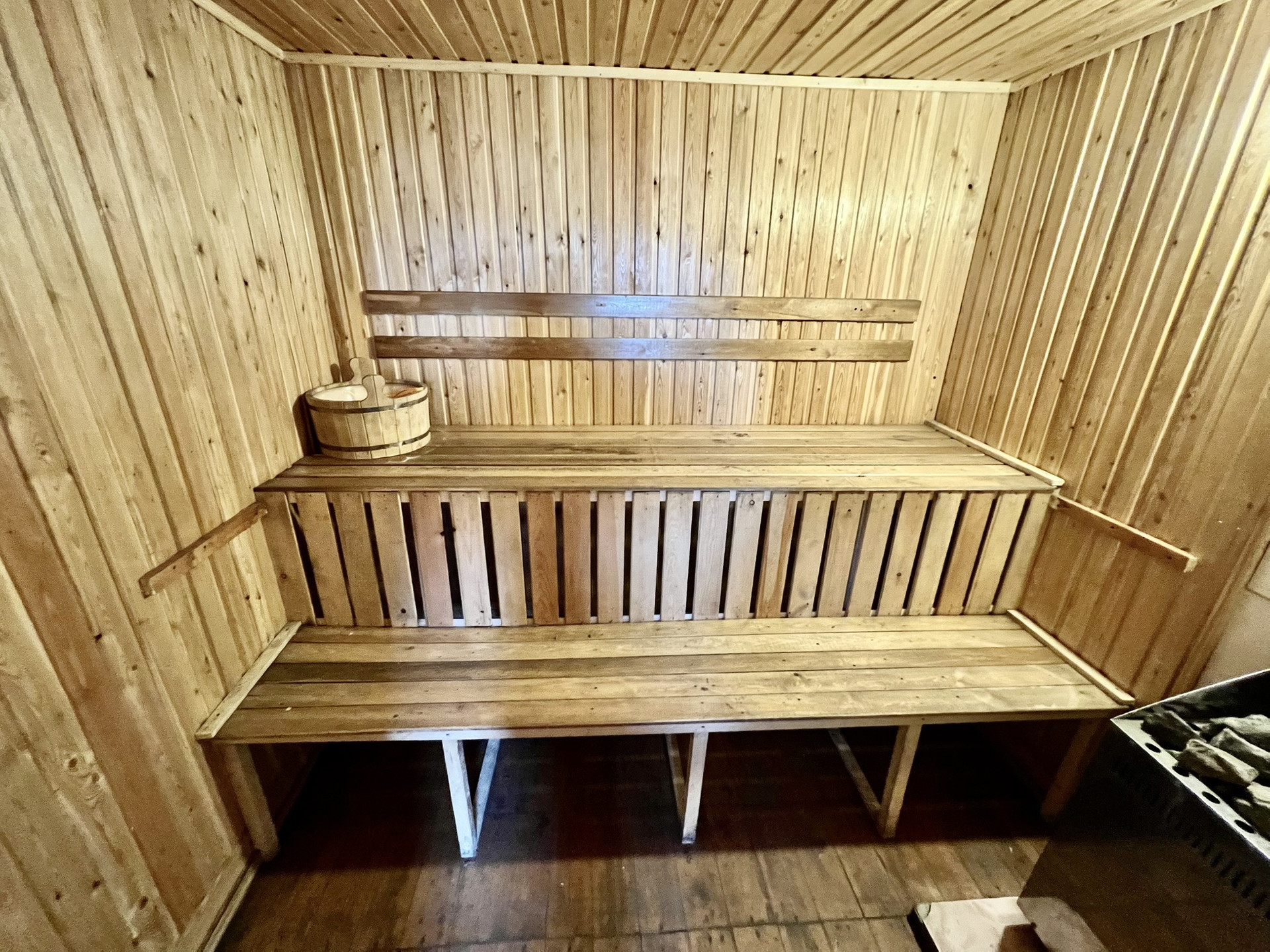 Рядом напротив из входа располагается второй дом,-оборудованы сауна со стеклянной дверью и баней. А также просторный капитальный гараж 10*5 и углярка. Дом, углярка и баня, - всё обшито сайдингом.