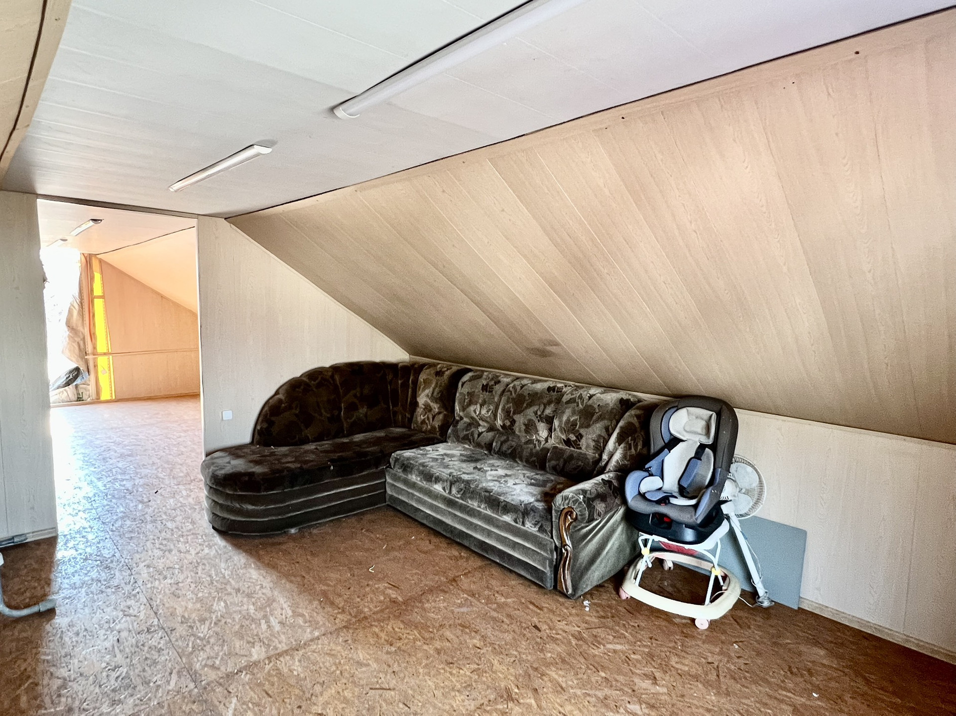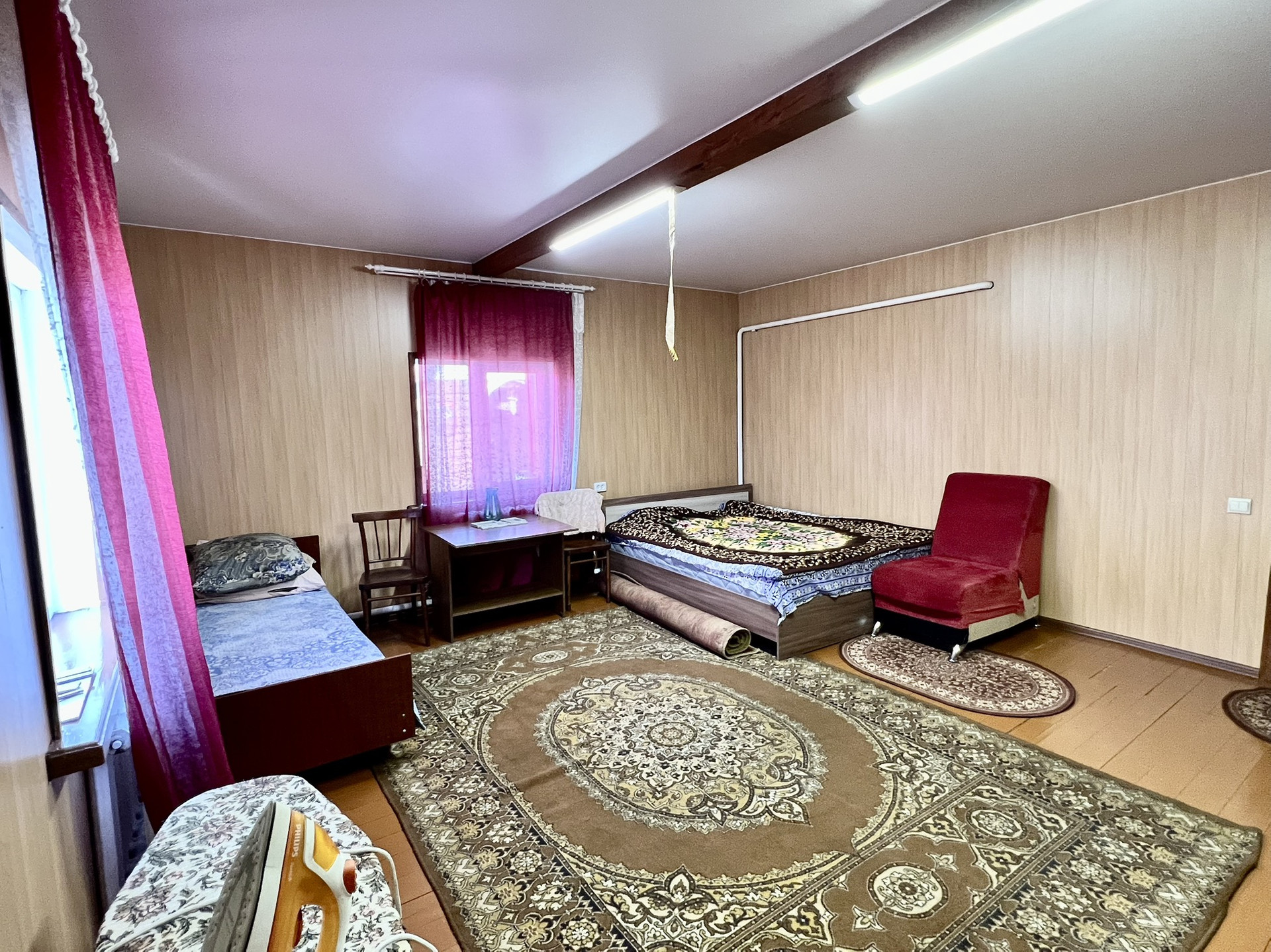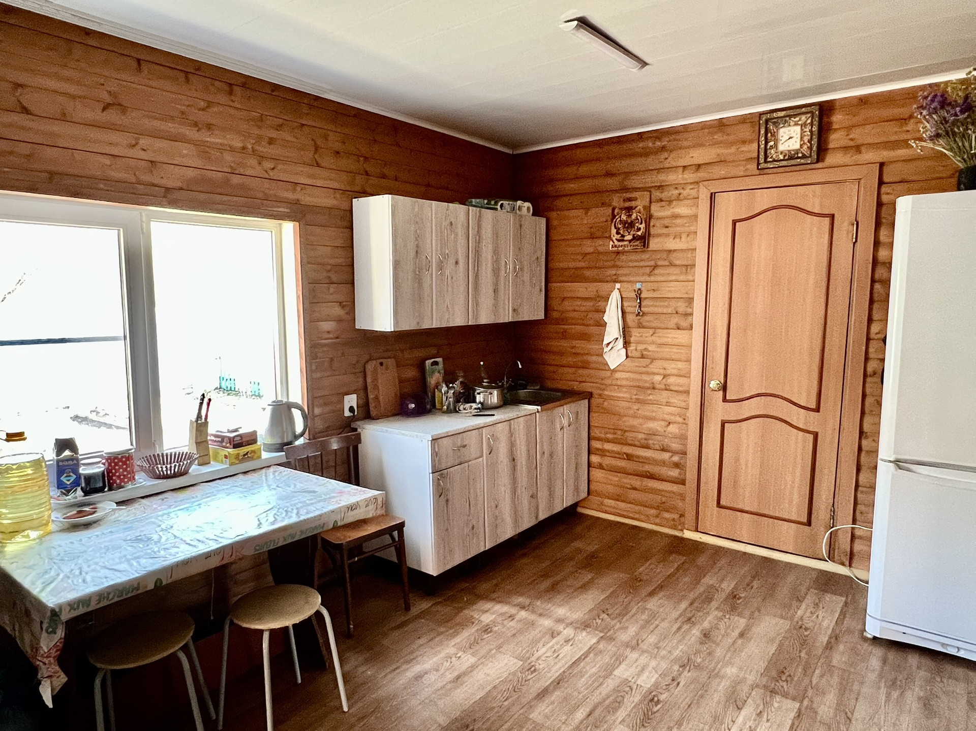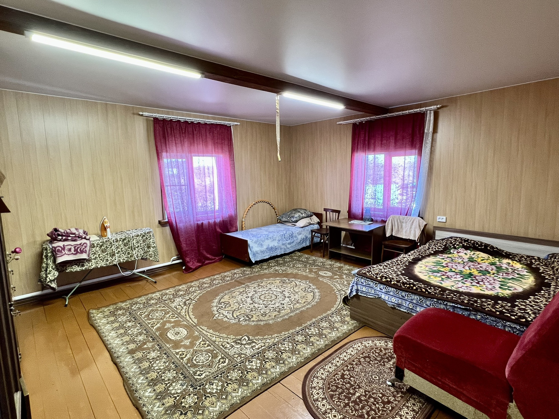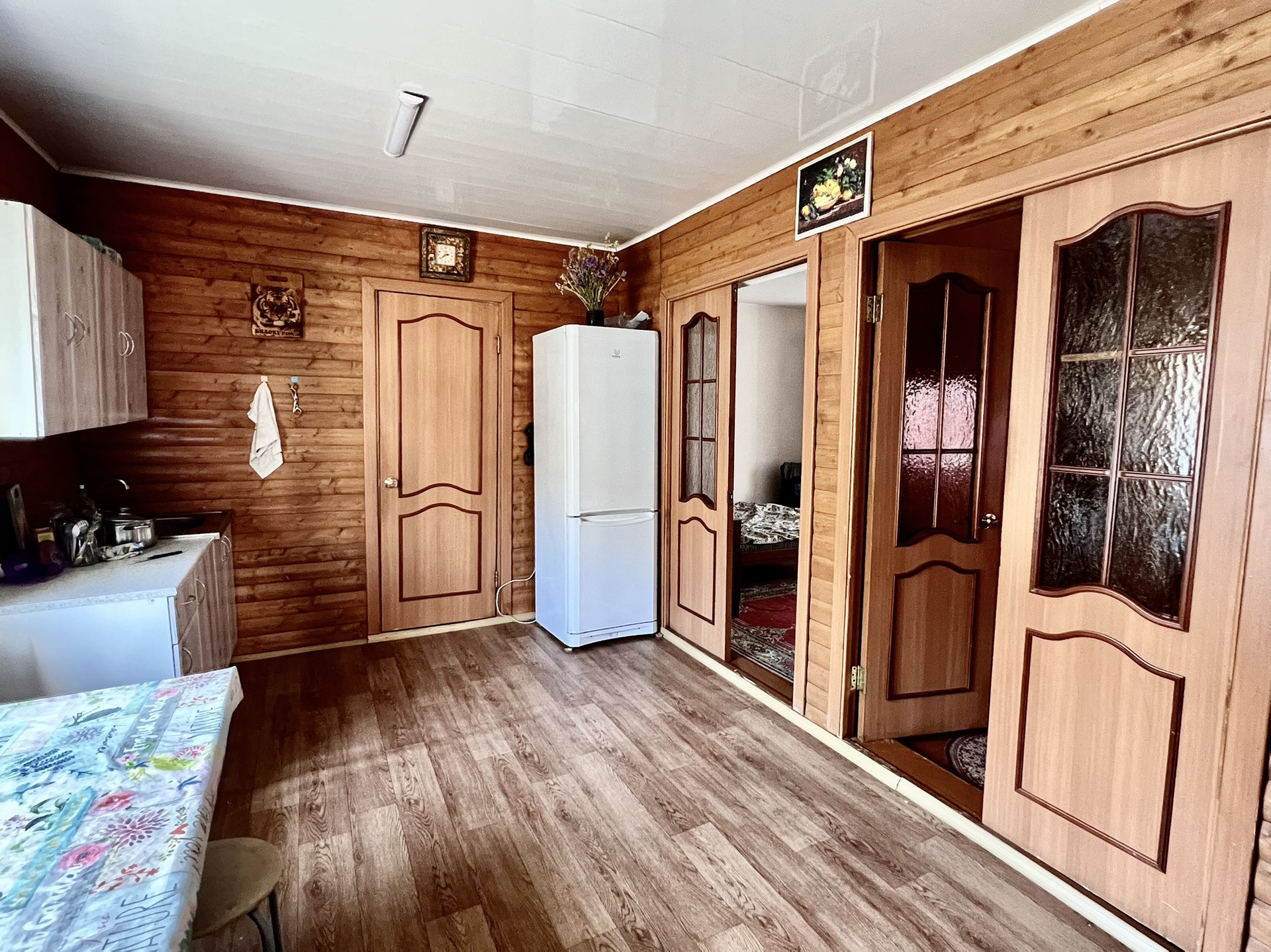 При входе в дом оборудована котельная из кирпича. На первом этаже расположены кухонная зона и 2 комнаты. Также рядом оборудован санузел с ванной и бойлером. Комнаты очень просторные,-25м2 и 17м2. С хорошим ремонтом в спальной зоне и на кухне линолеум на полу, во всех комнатах натяжной потолок. Стены обшиты.