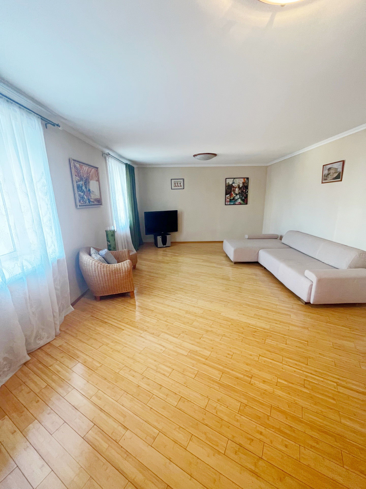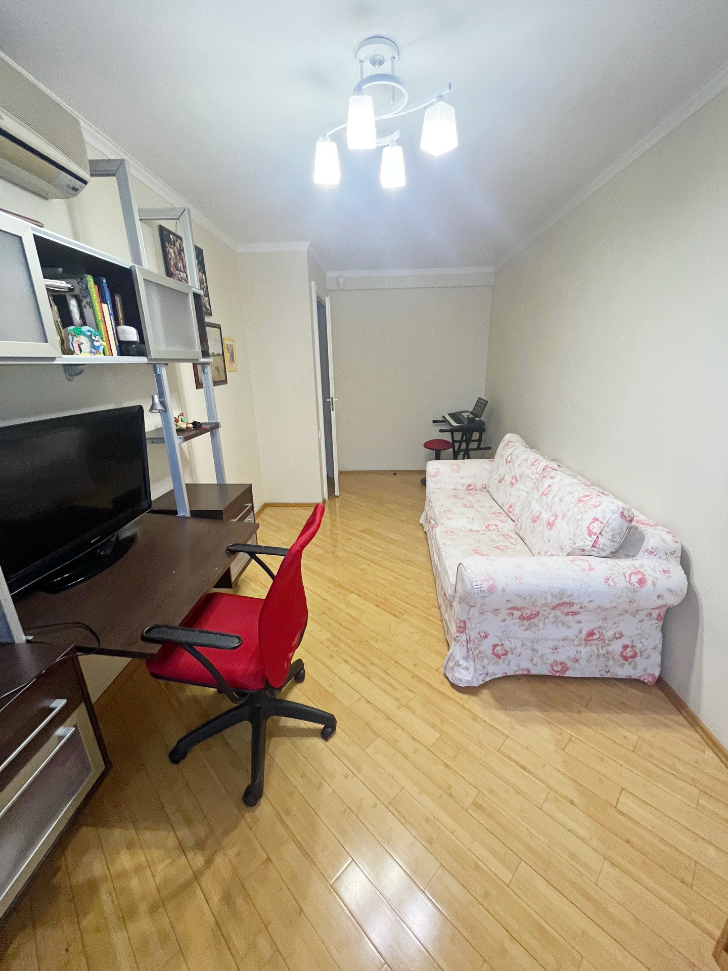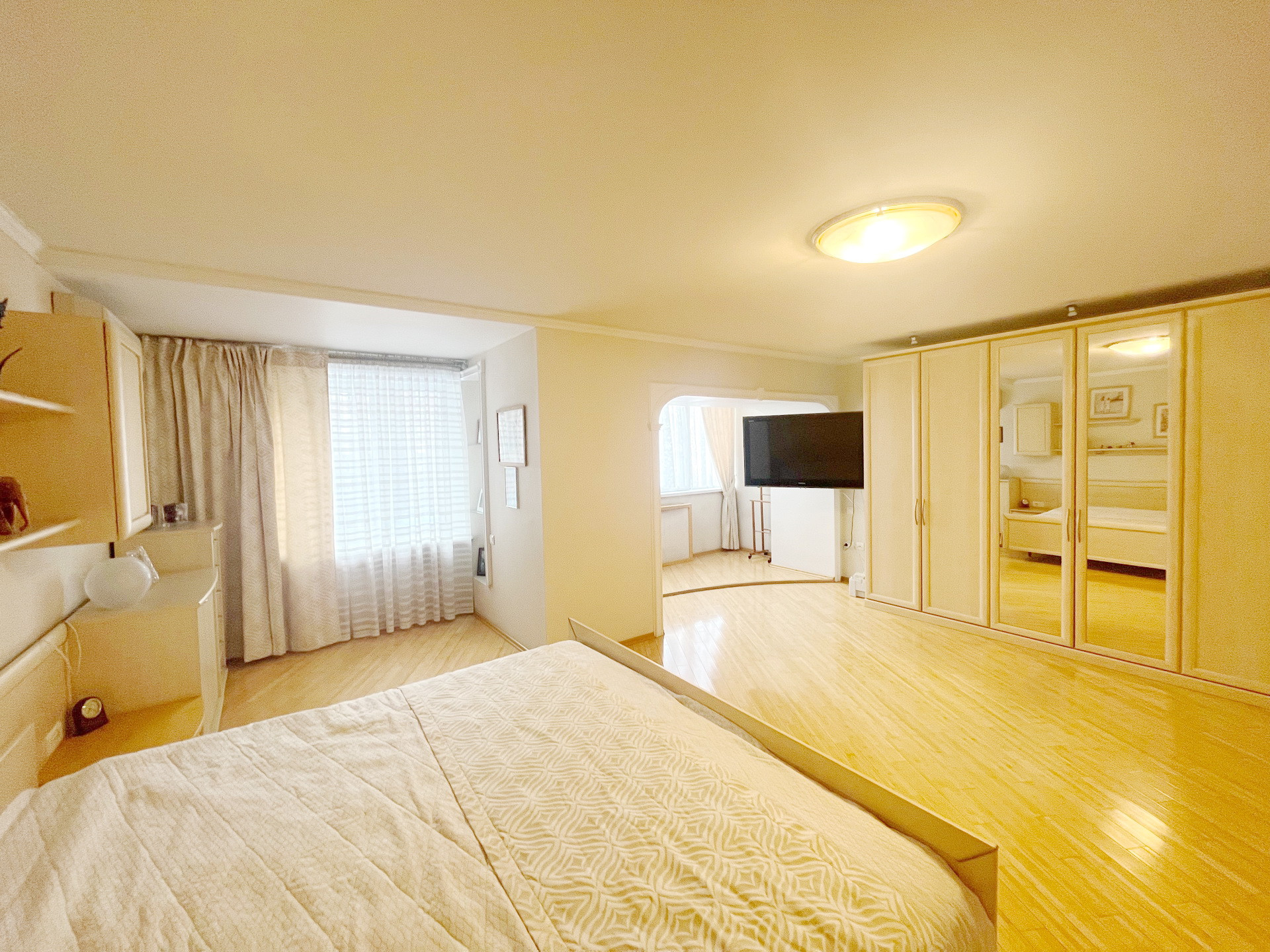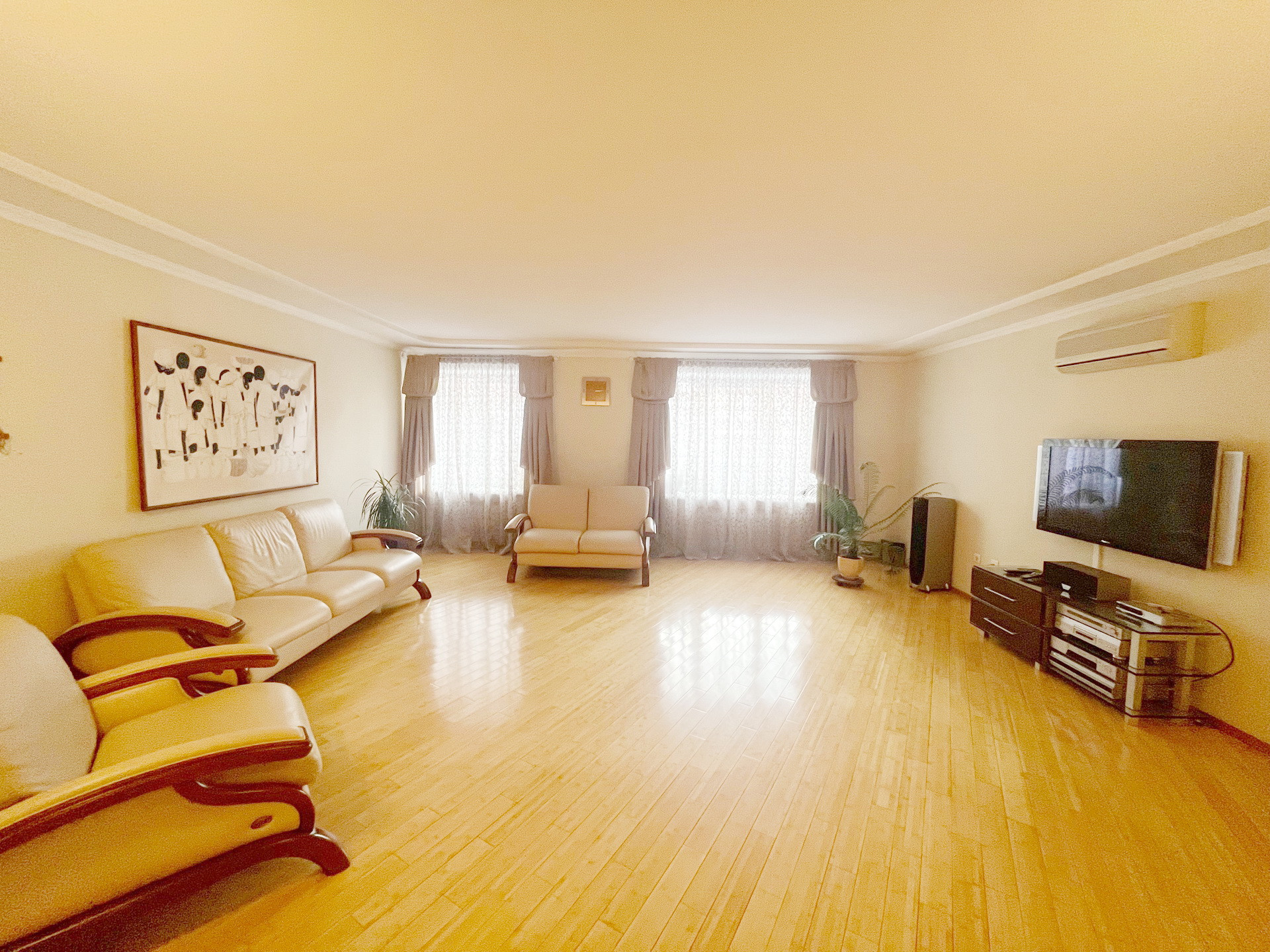 На полу паркет из натурального бамбука.Стены и полы выровнены ,потолки гипсокартон.Мебель натуральная кожа. Шкафы Mr Doors.
