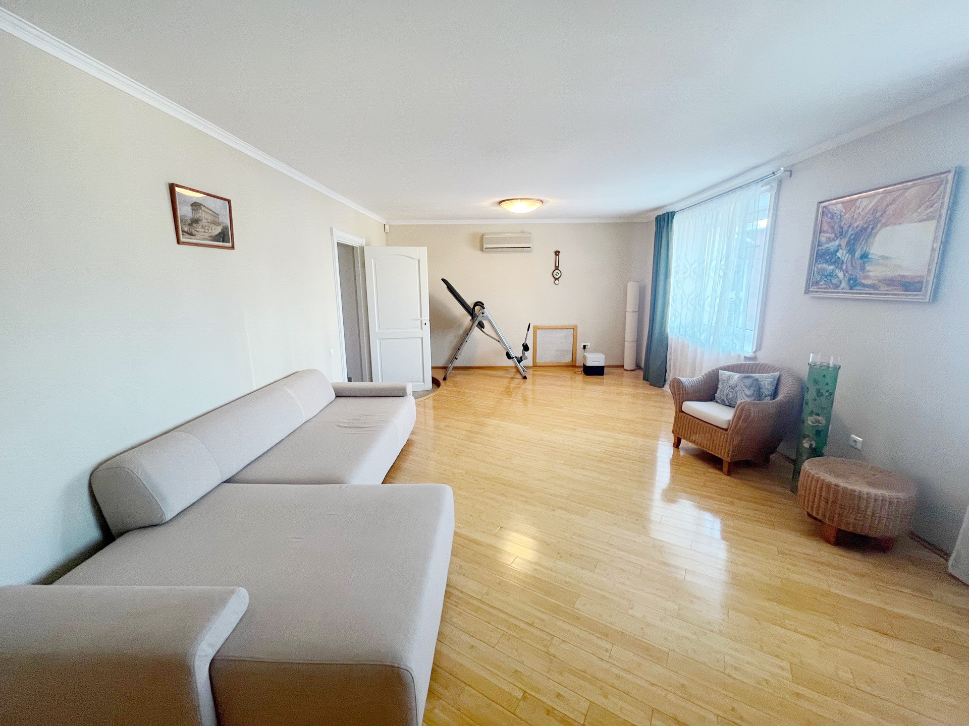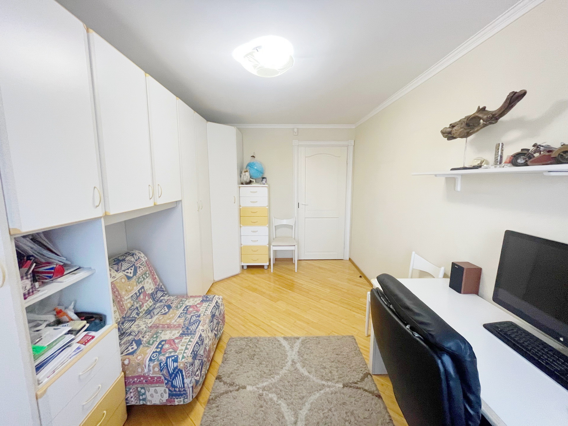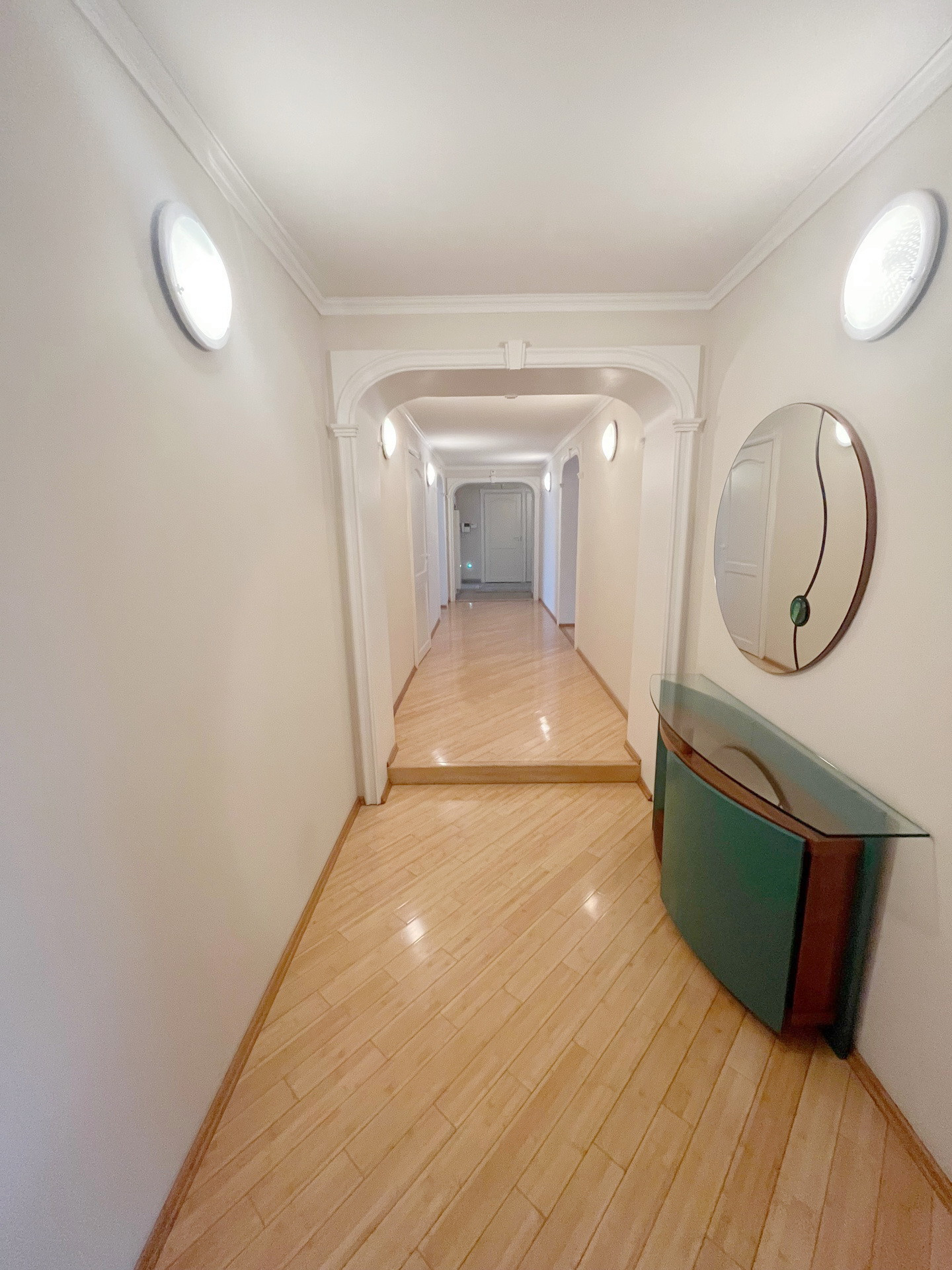 На полу паркет из натурального бамбука.Стены и полы выровнены ,потолки гипсокартон.Мебель натуральная кожа. Шкафы Mr Doors.