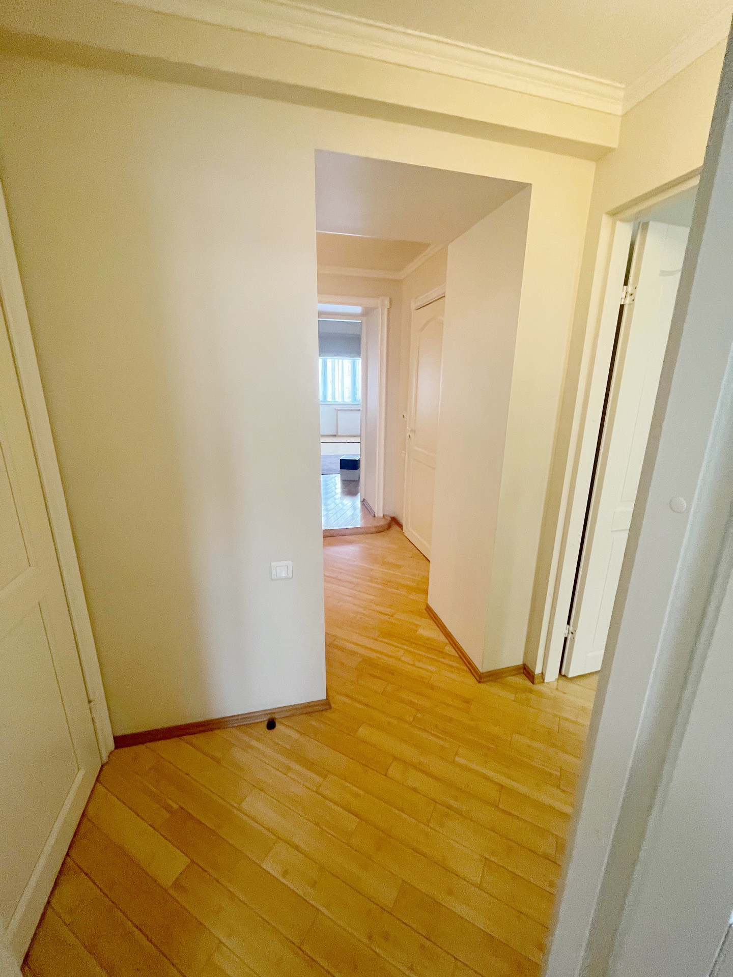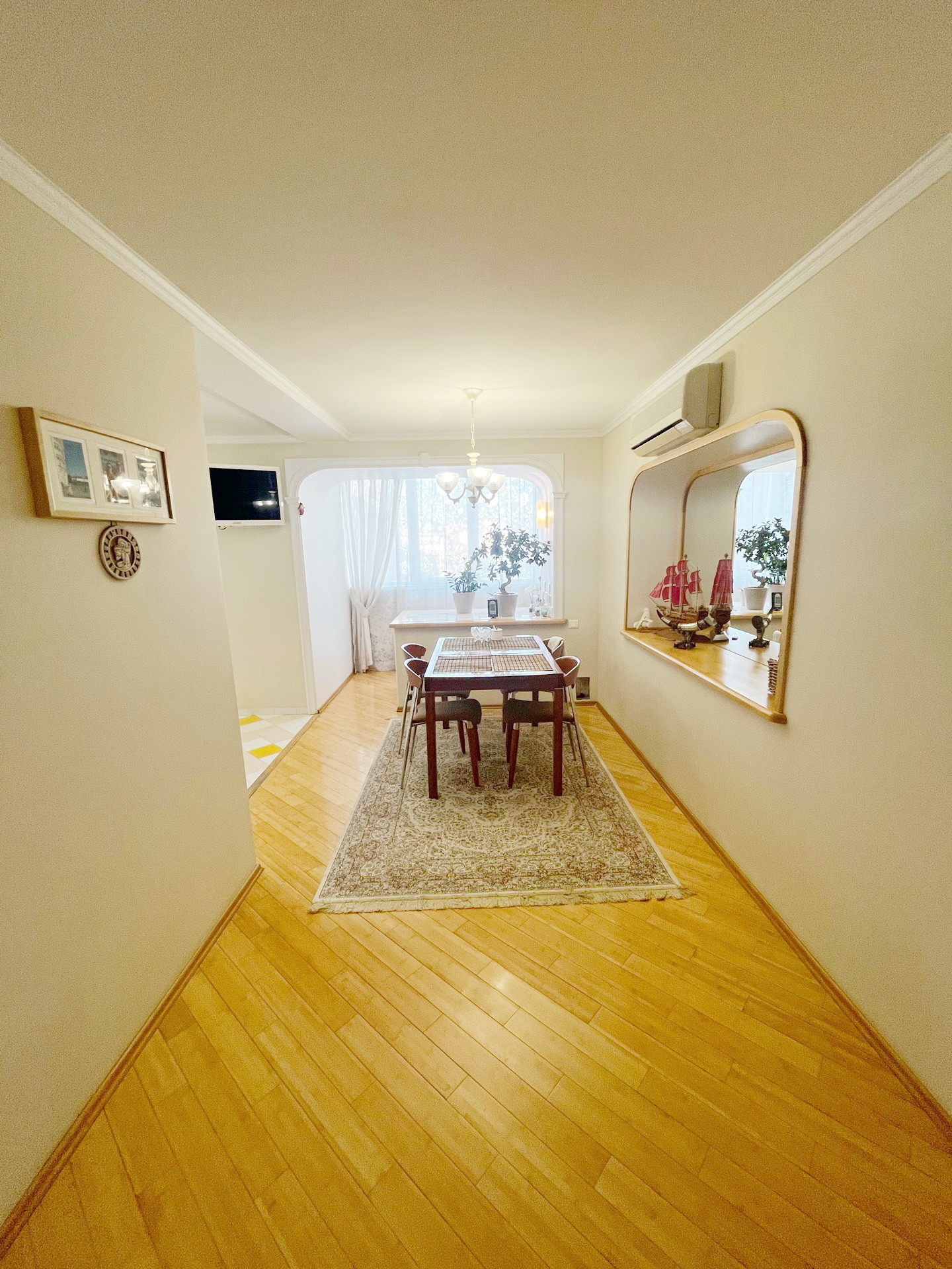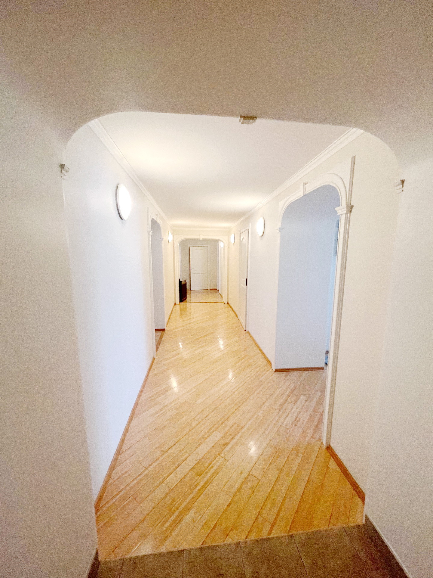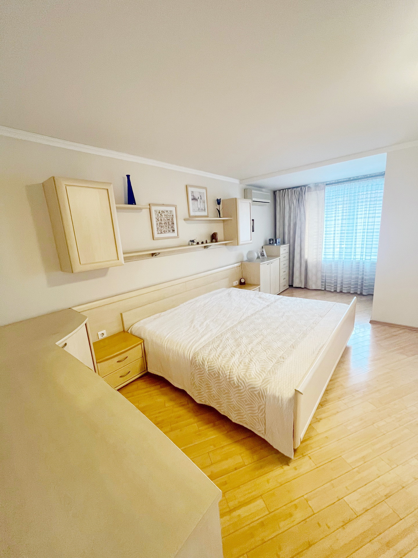 На полу паркет из натурального бамбука.Стены и полы выровнены ,потолки гипсокартон.Мебель натуральная кожа. Шкафы Mr Doors.