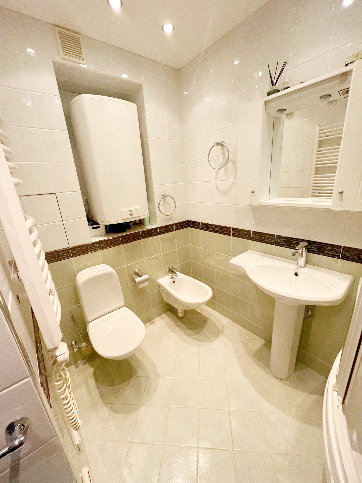 Два санузла. Первый:душевая кабина с гидромассажем и сауной,унитаз,биде,электрический полотенцесушитель,бойлер.