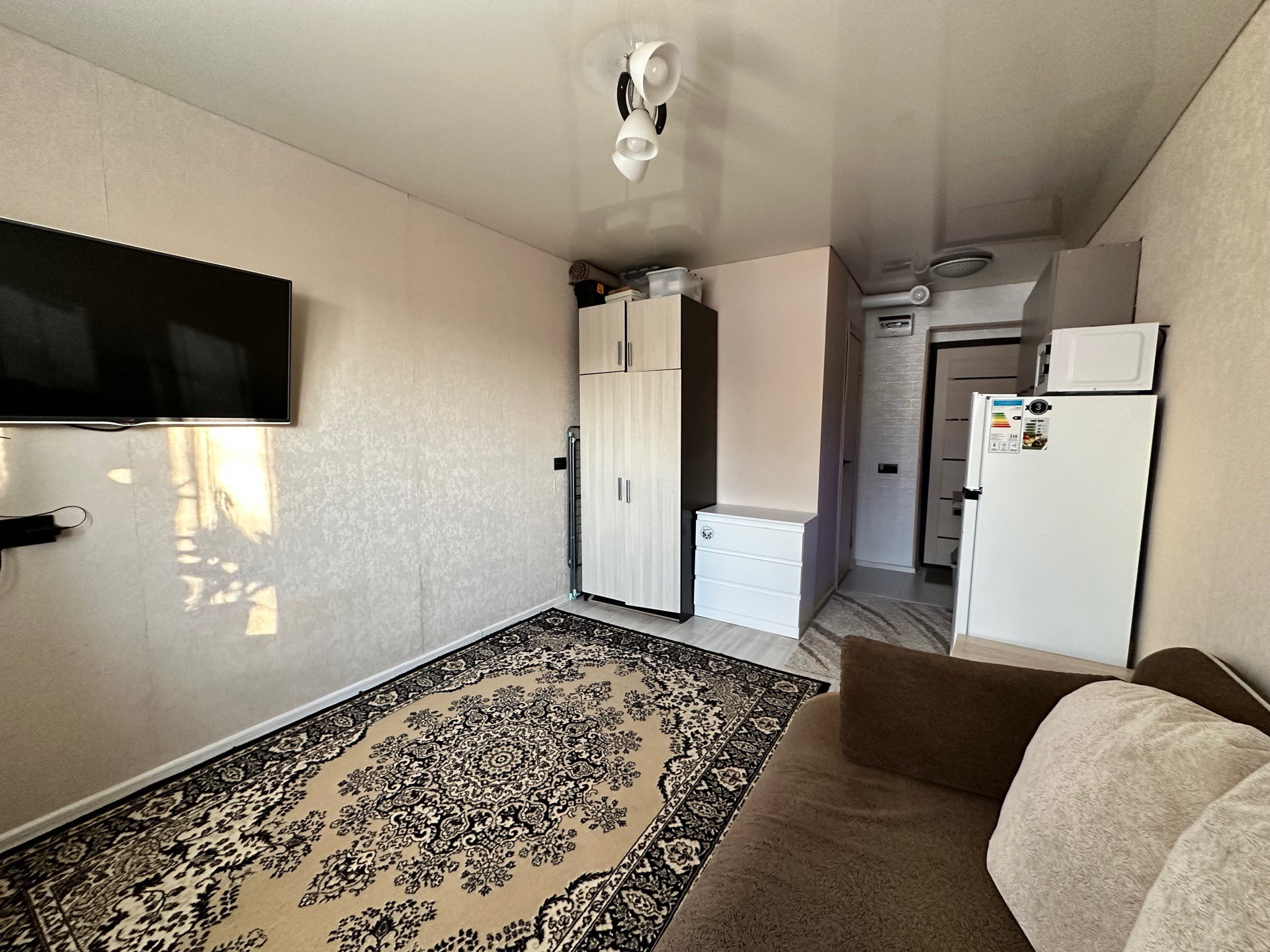 В квартире выполнен капитальный ремонт. Установлено окно ПВХ, радиатор, натяжной потолок. Стены и пол выровнены, напольное покрытие - ламинат. У входной двери выкладка кафелем.