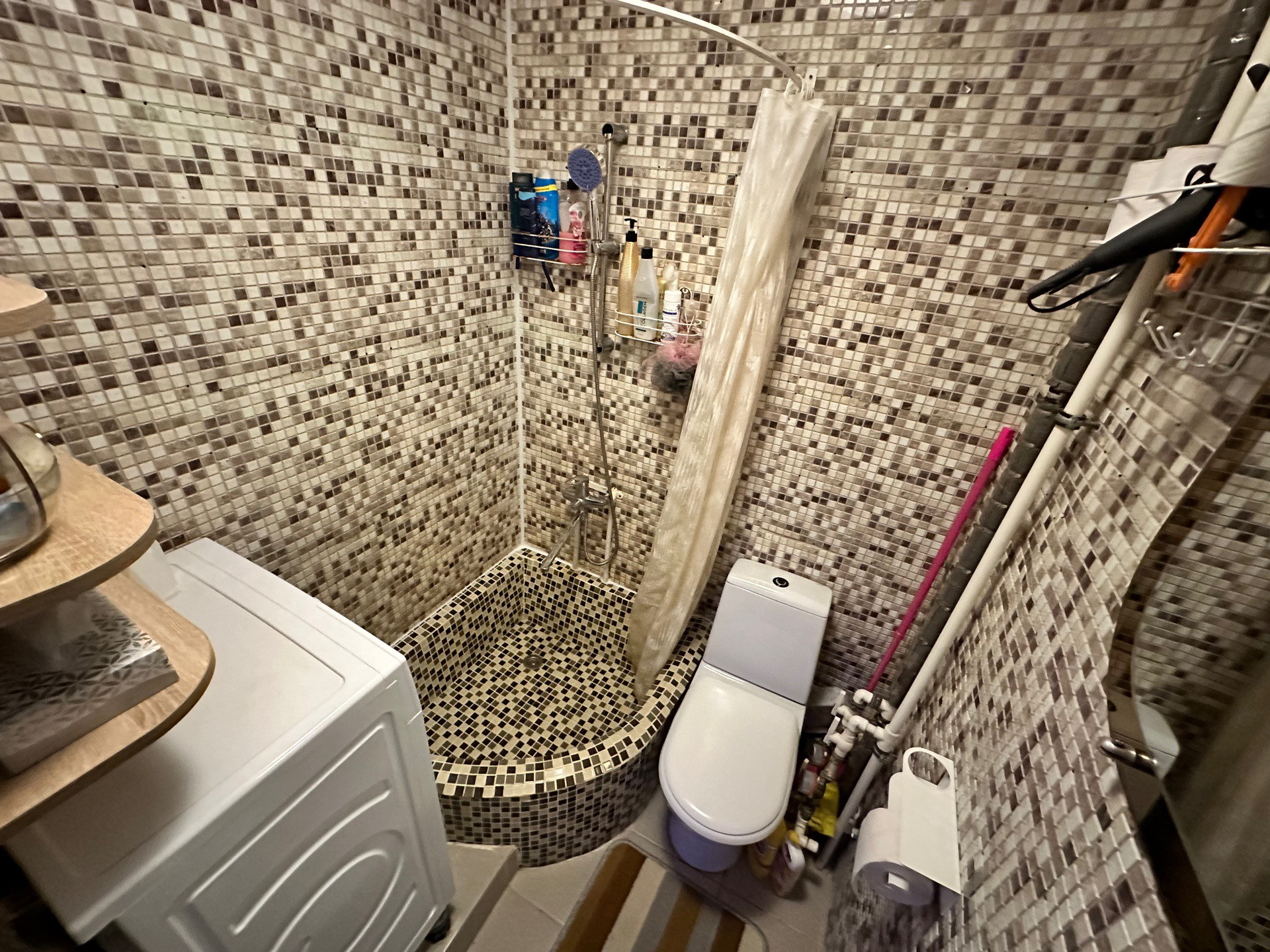 Санузел совмещен. Пол и стены выкладка кафелем. Сантехника полностью заменена.