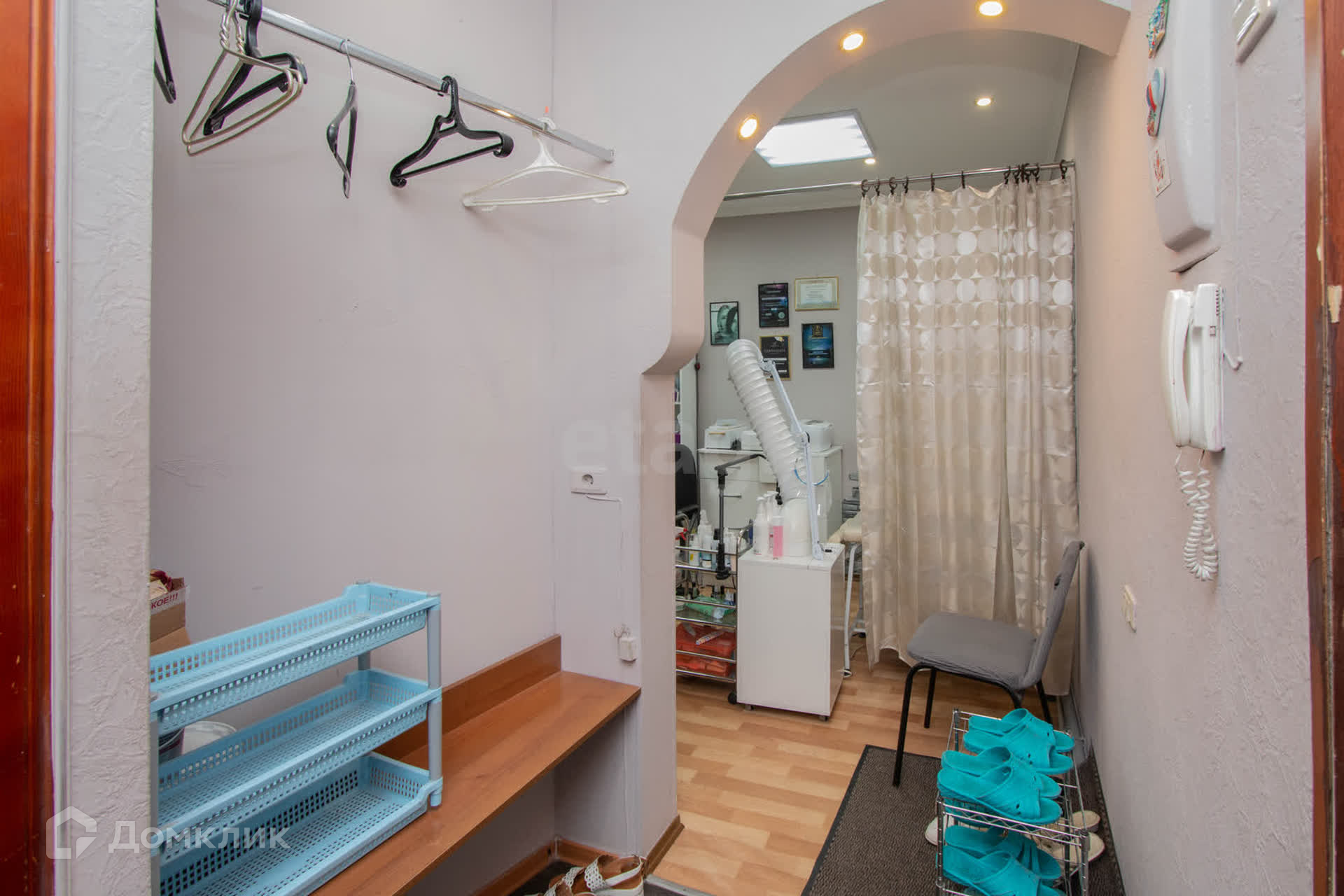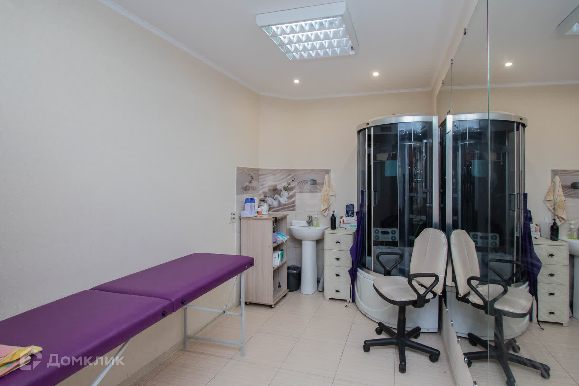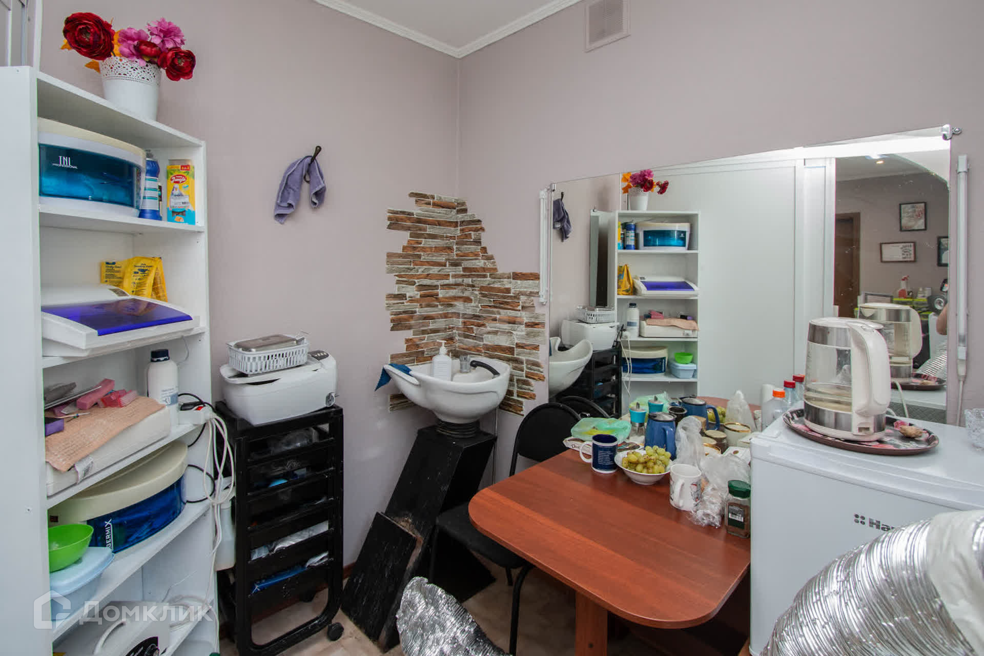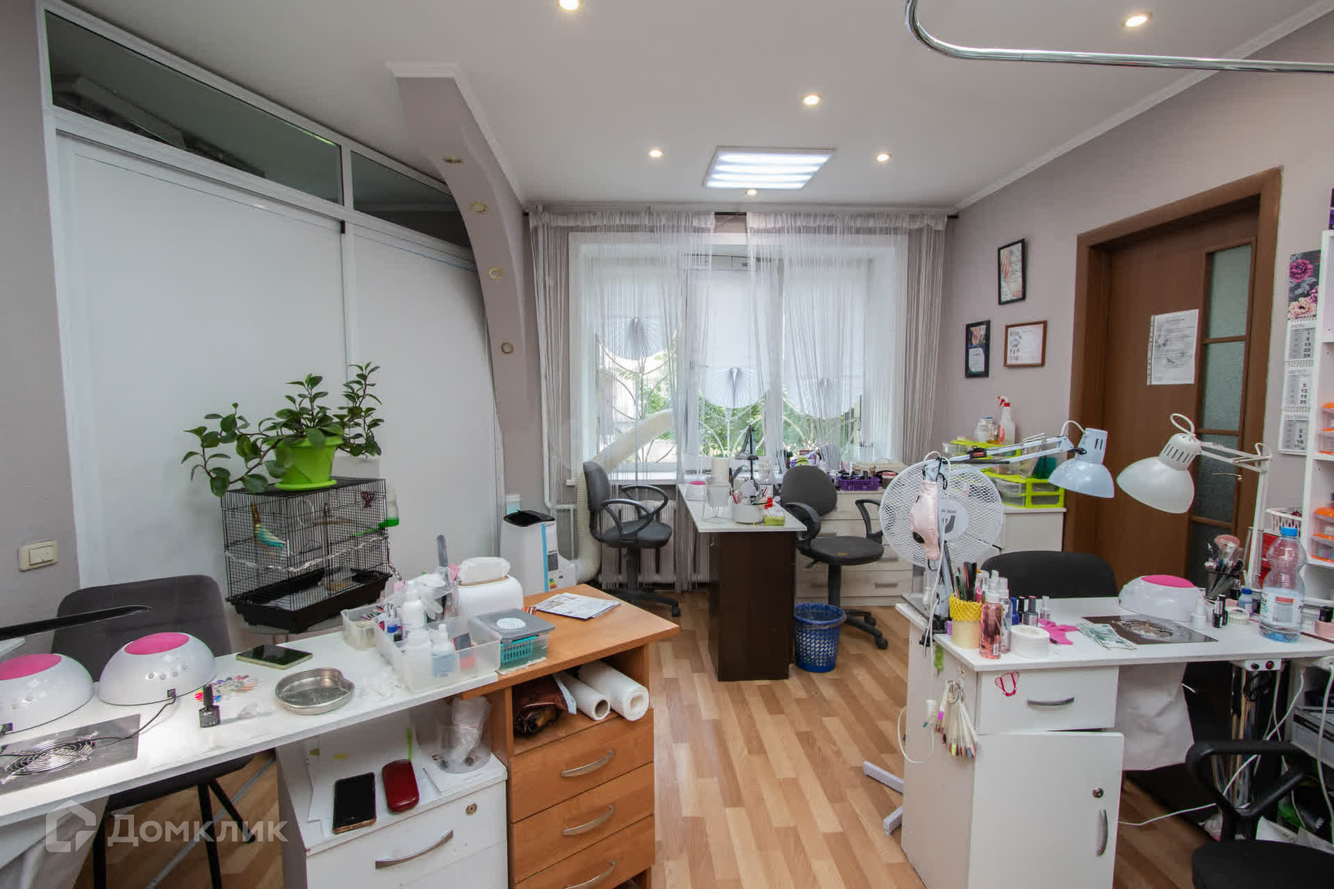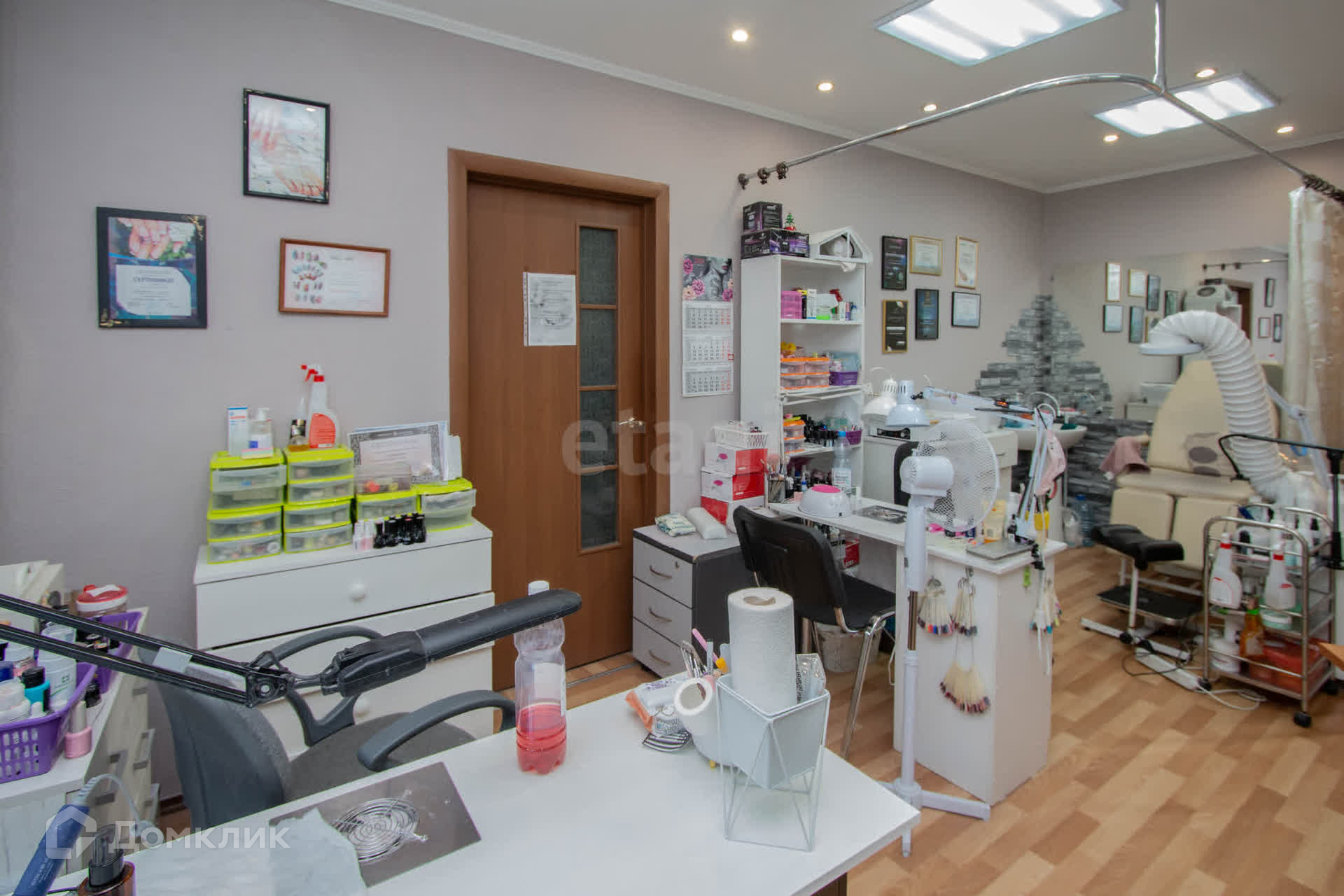 Оборудование: В помещении установлена душевая кабина, массажный стол, три стола для маникюрных мастеров, зона для педикюра, место для парикмахера.