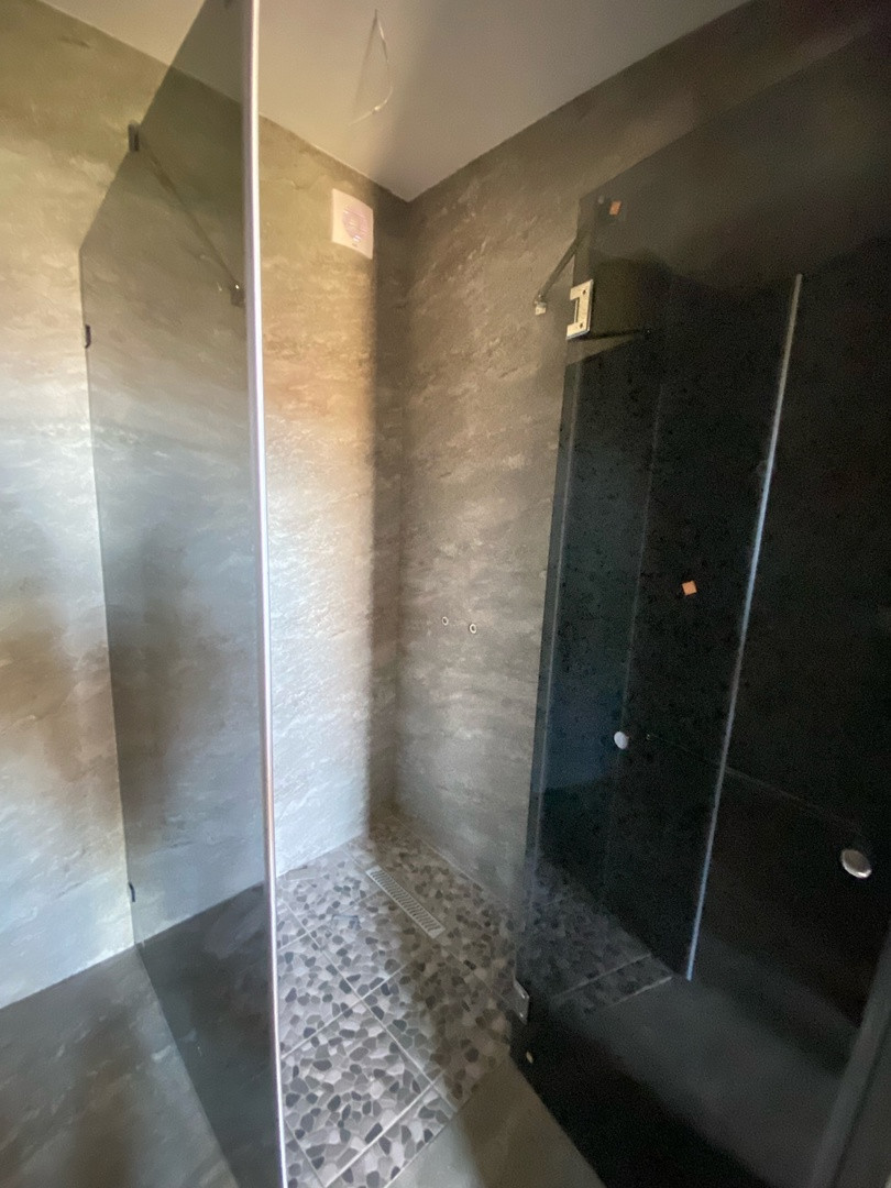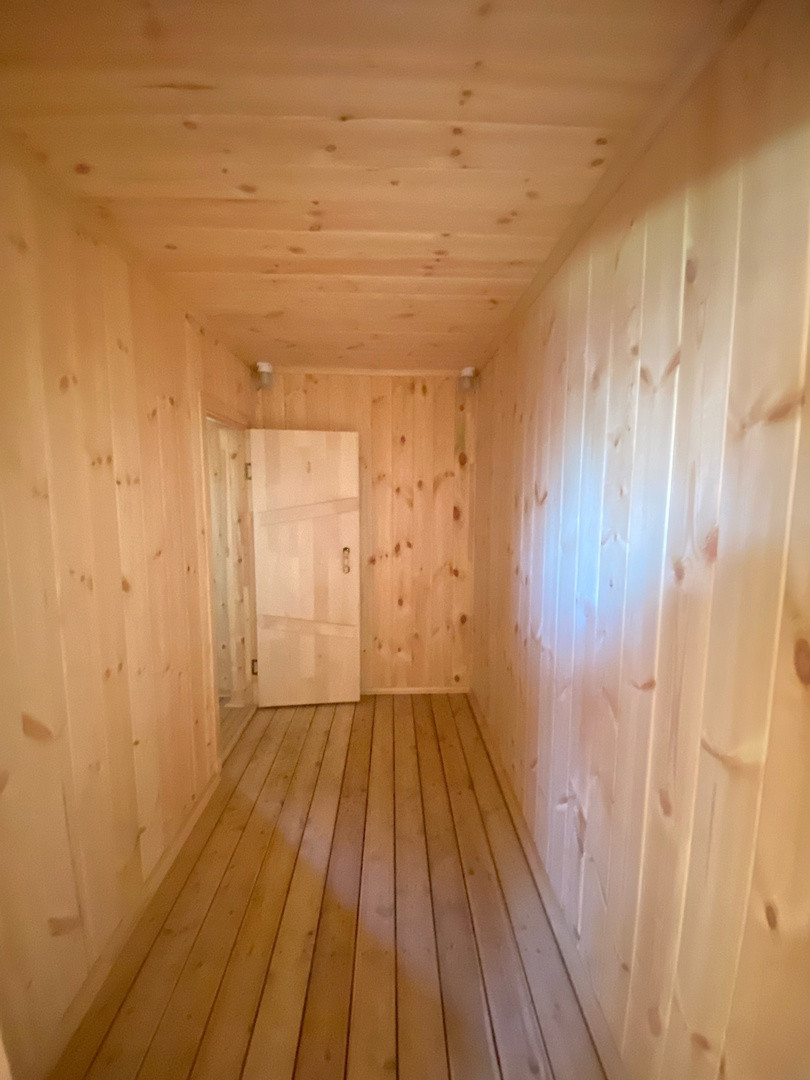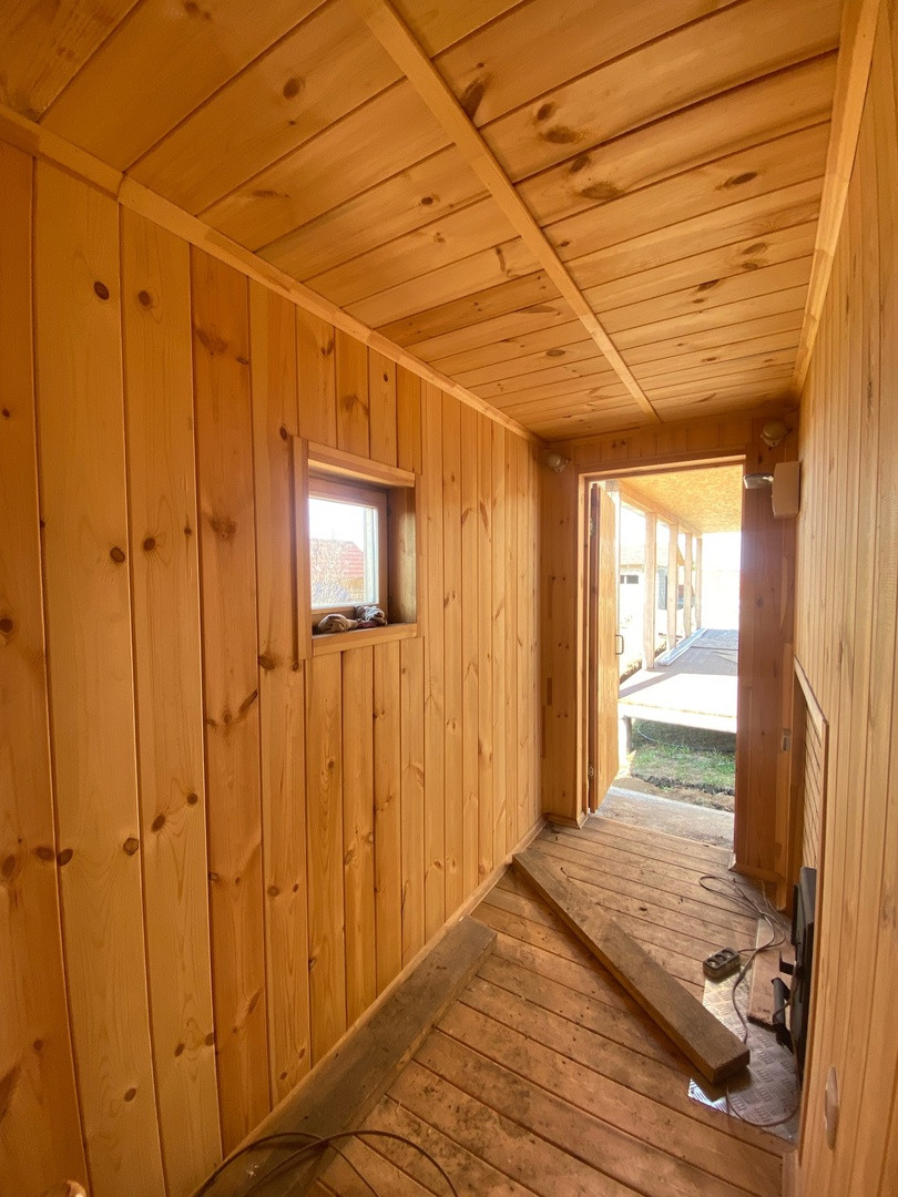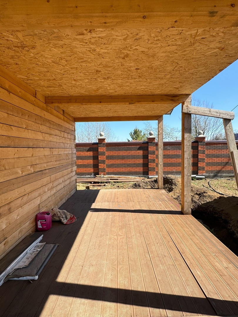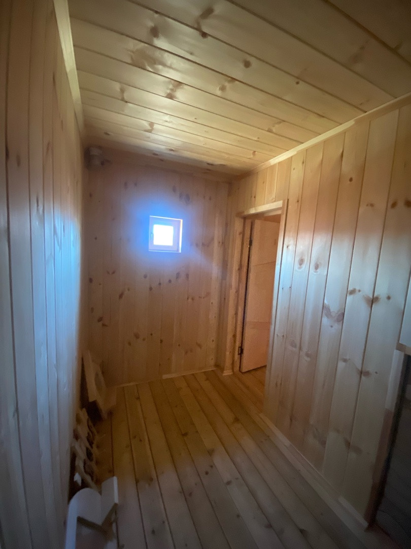Гостевой дом из бруса, выполнены все этапы обработки материала - в доме гостили зимой ( электрические радиаторы отопления достаточно обогревают помещение, было даже жарко ). Стоят качественные стеклопакеты. Установлен новый кухонный гарнитур, новая душевая кабина и бойлер. В дом все заведено - и вода, и электричество, слив выведен. В душевой сделан пол с подогревом. Пол и стены по всему дому выложен керамогранитом, в душевой кабине - плитка. Большая терраса - опалубка лиственница.