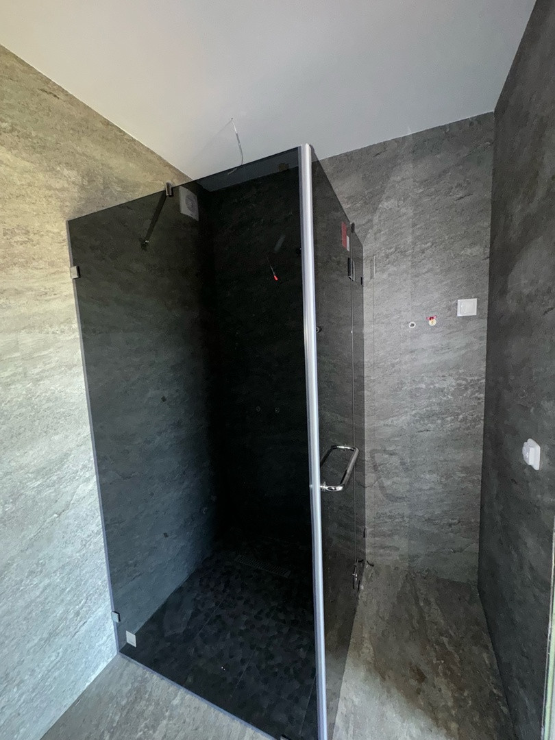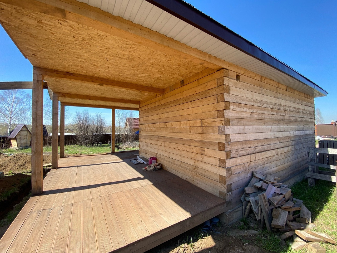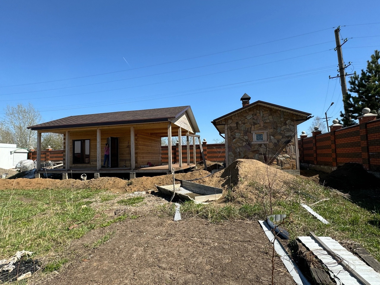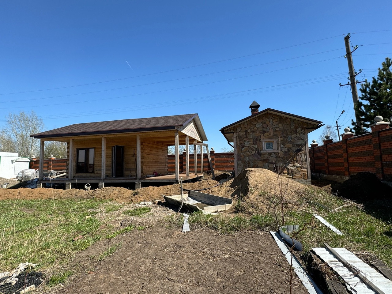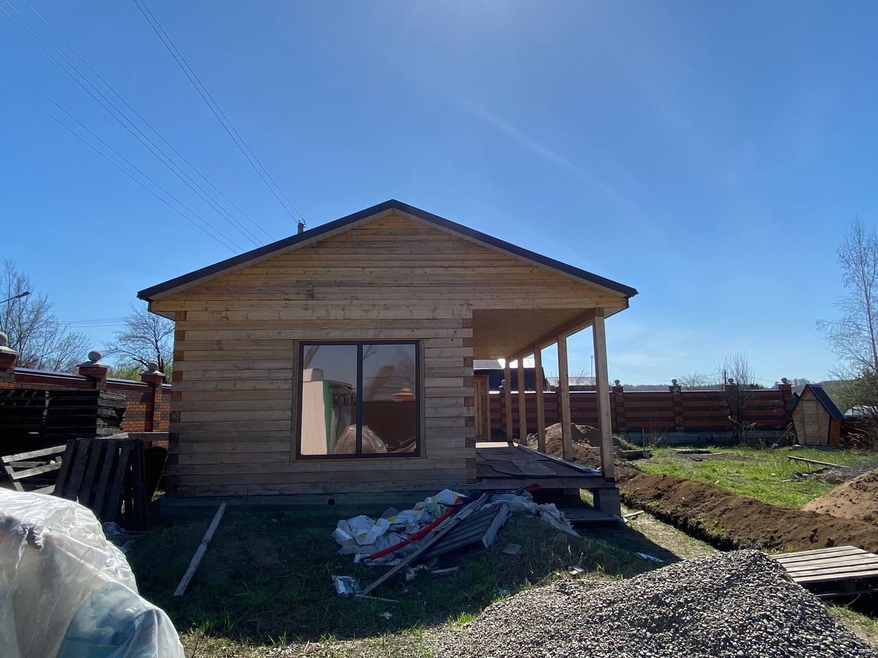 Гостевой дом из бруса, выполнены все этапы обработки материала - в доме гостили зимой ( электрические радиаторы отопления достаточно обогревают помещение, было даже жарко ). Стоят качественные стеклопакеты. Установлен новый кухонный гарнитур, новая душевая кабина и бойлер. В дом все заведено - и вода, и электричество, слив выведен. В душевой сделан пол с подогревом. Пол и стены по всему дому выложен керамогранитом, в душевой кабине - плитка. Большая терраса - опалубка лиственница.