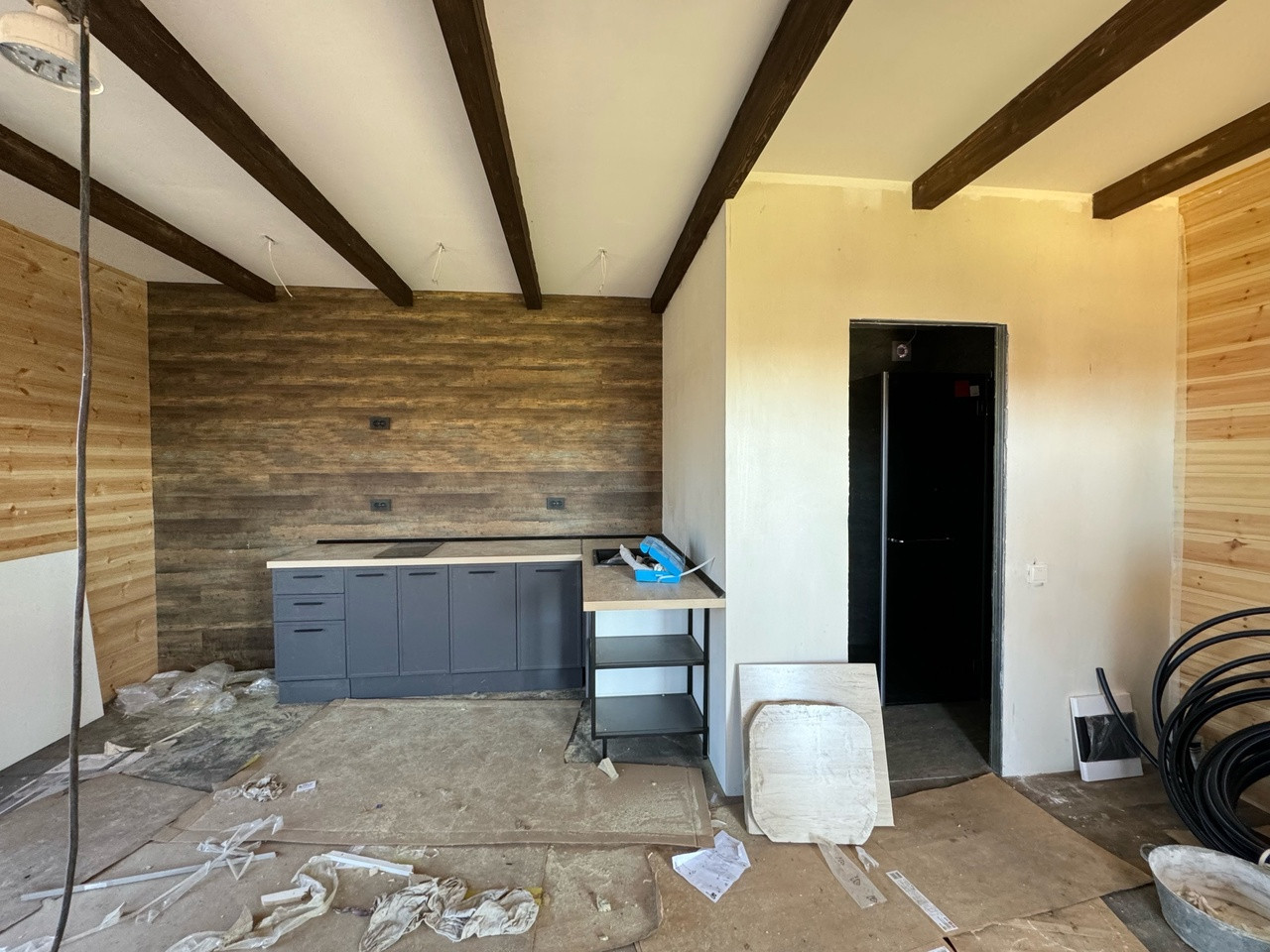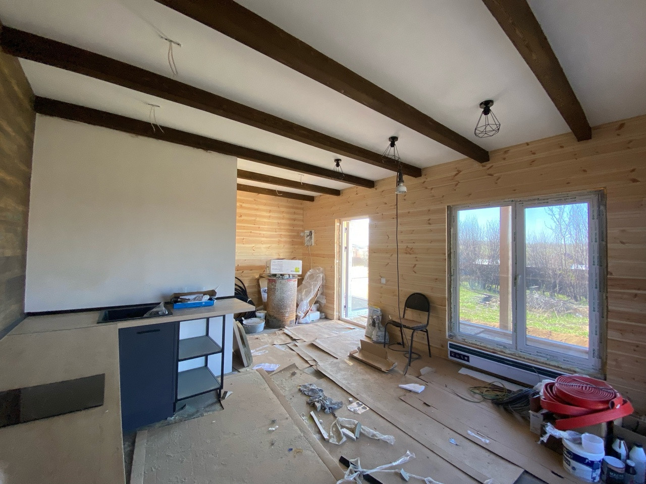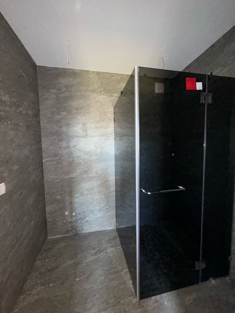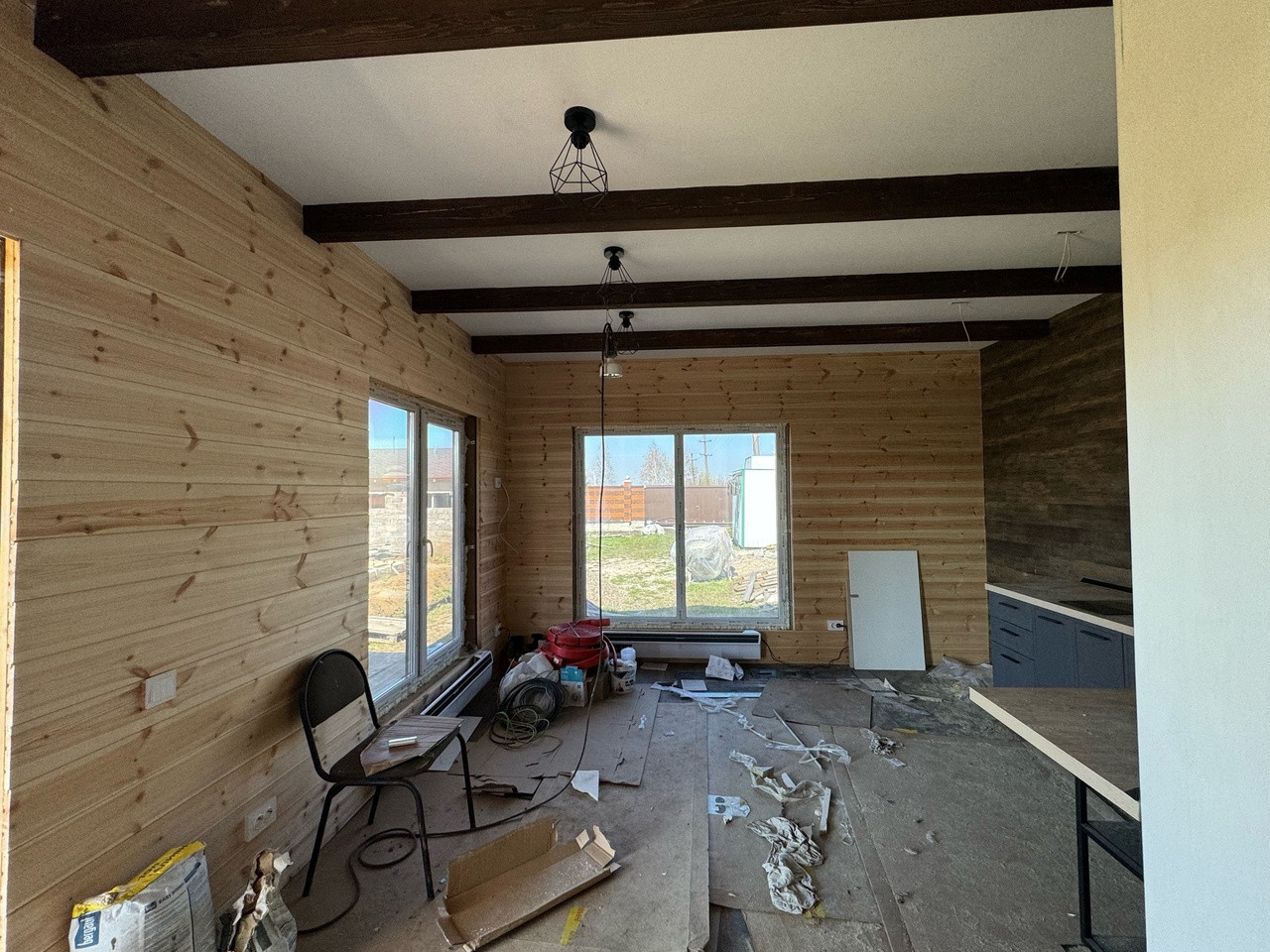 Гостевой дом из бруса, выполнены все этапы обработки материала - в доме гостили зимой ( электрические радиаторы отопления достаточно обогревают помещение, было даже жарко ). Стоят качественные стеклопакеты. Установлен новый кухонный гарнитур, новая душевая кабина и бойлер. В дом все заведено - и вода, и электричество, слив выведен. В душевой сделан пол с подогревом. Пол и стены по всему дому выложен керамогранитом, в душевой кабине - плитка. Большая терраса - опалубка лиственница.