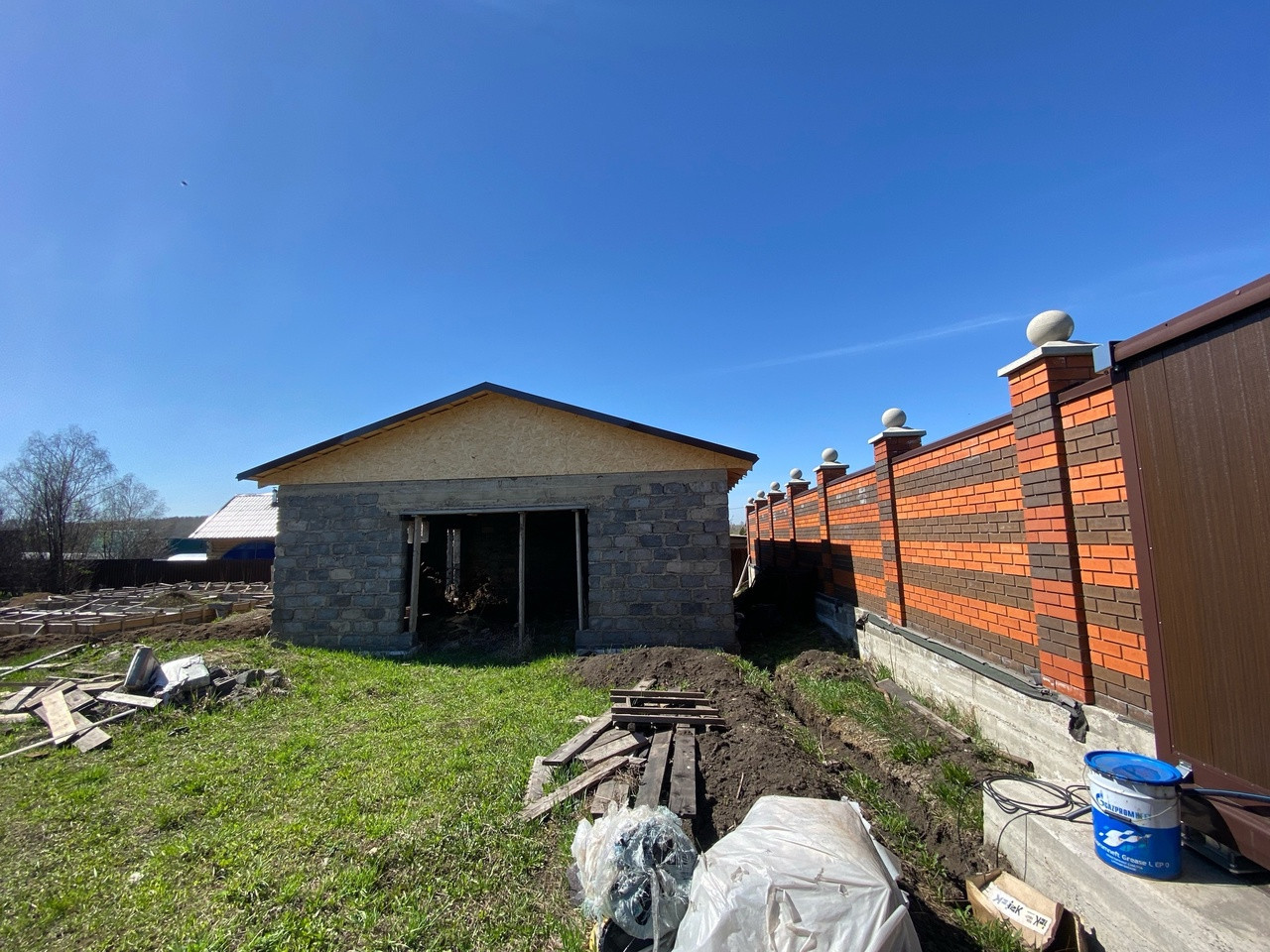 По периметру установлен высокий долговечный забор из кирпича. Так же стоят откатные электрические ворота ( управление с пульта ).